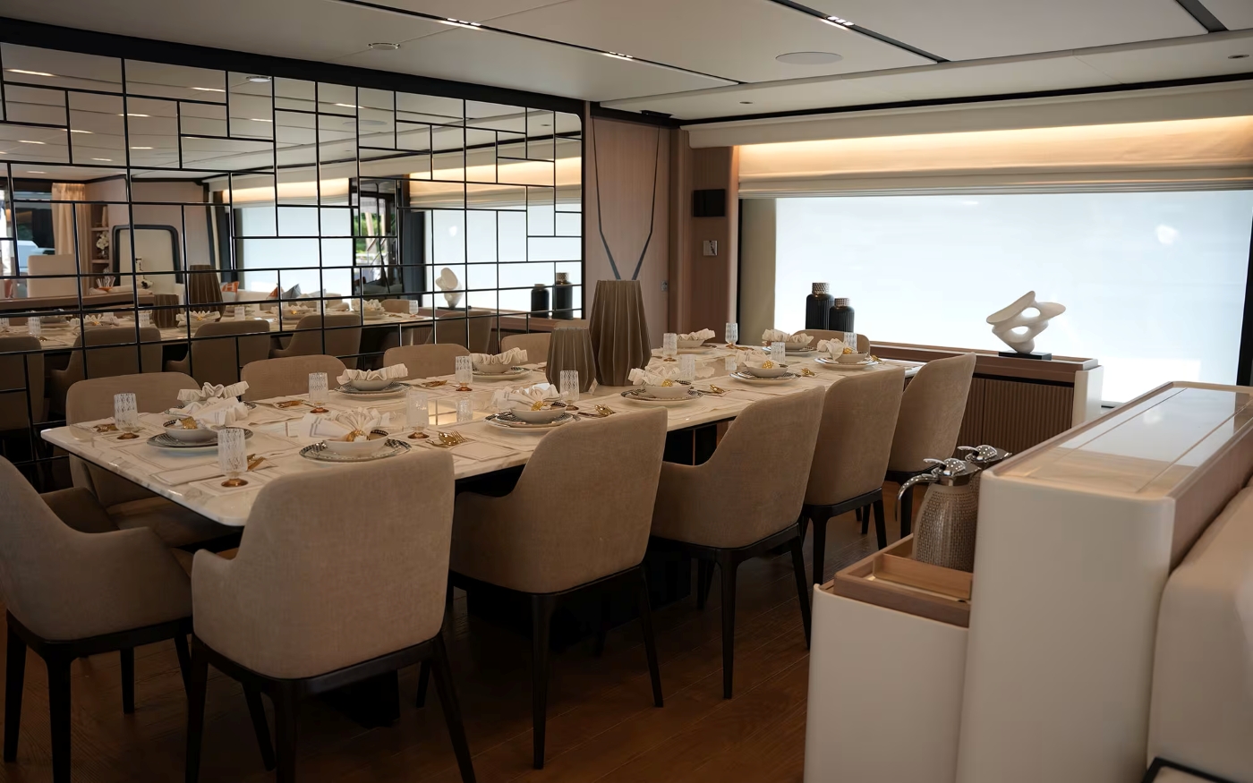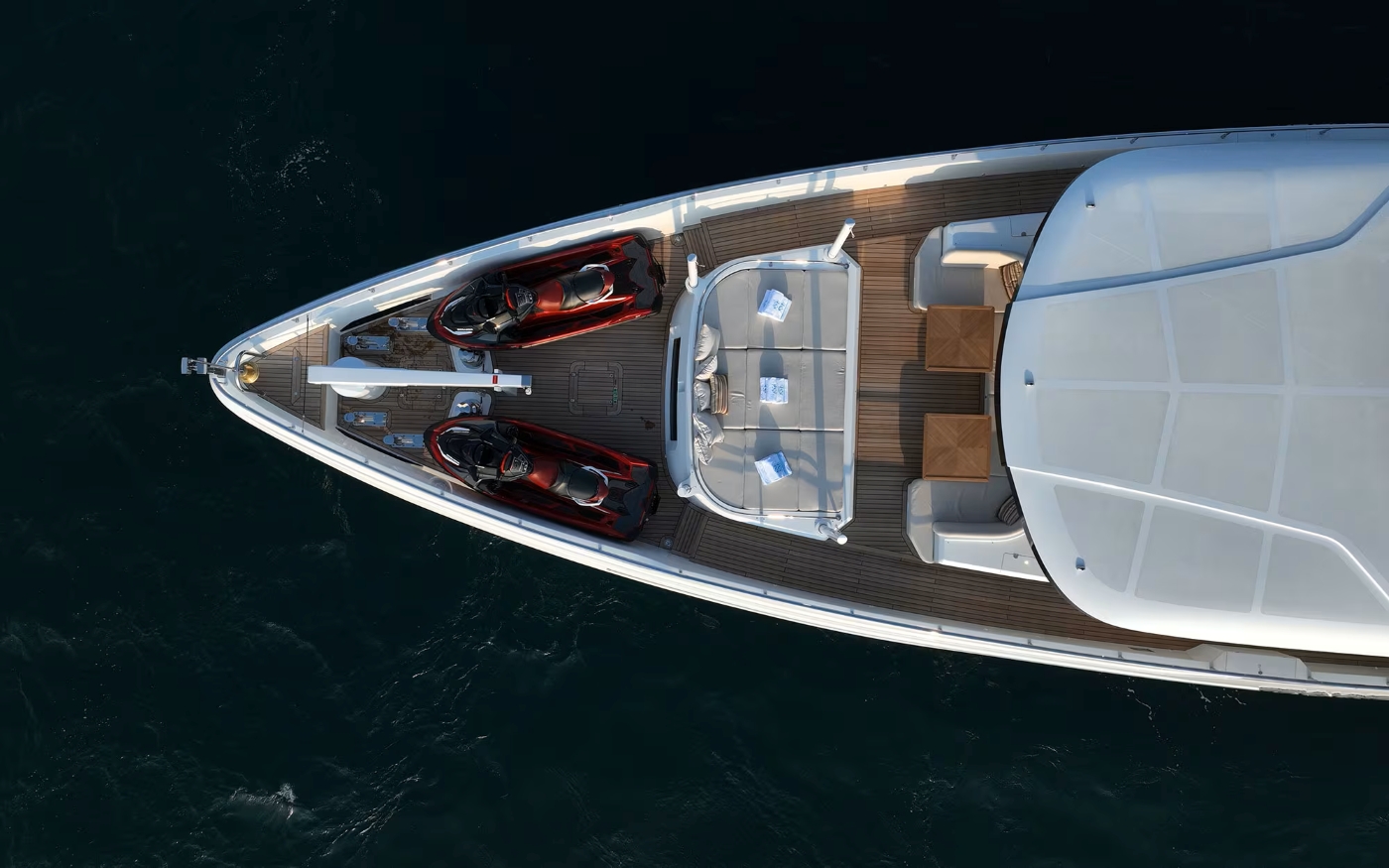 The tender garage on the working deck cleverly transforms into a teak-clad hydraulic swim terrace, complete with a wet bar and sculpted steps leading into the sea - a thoughtful bridge between elegance and effortless access to the water.