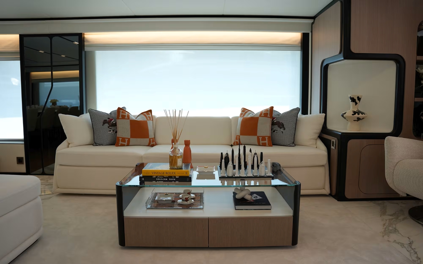 Inside, GEULUNEL’s décor is calm and carefully considered. The main saloon extends across the beam to embrace natural light through generous glazing, creating a flowing, open living area. A softly lit walnut staircase provides a stylish vertical spine, connecting all three decks with fluid grace.