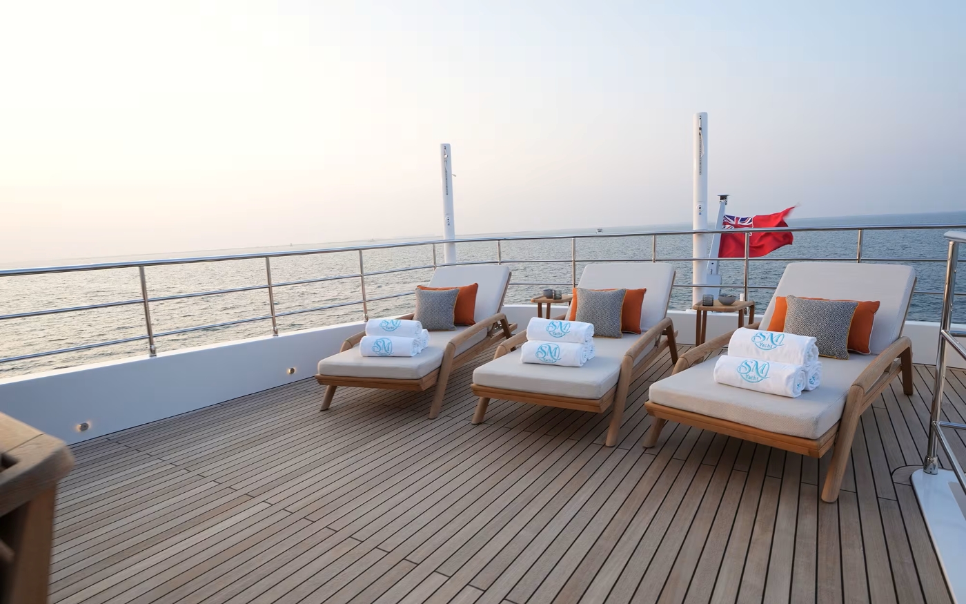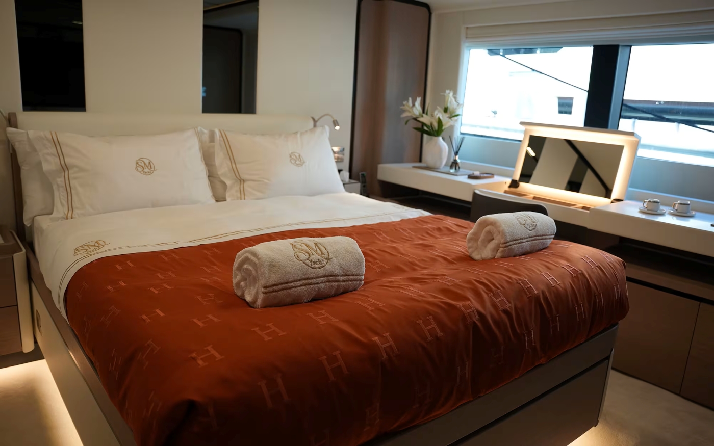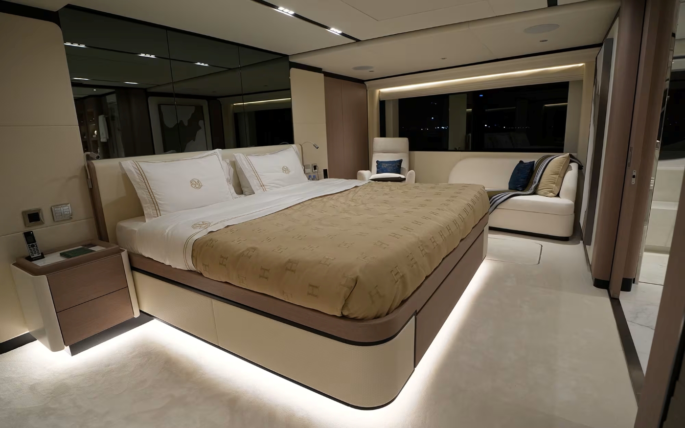 Guest accommodation comprises six impeccably appointed suites: ~ Master suite on the main deck with striking panoramic views and a sense of refined calm ~ Two VIP cabins, each with queen sized beds and en suite facilities ~ One double cabin with a queen sized bed and en suite bathroom ~ Two twin cabins, each with two single beds and en suite bathrooms Seven crew are accommodated in well-considered crew quarters, ensuring discreet and attentive service.