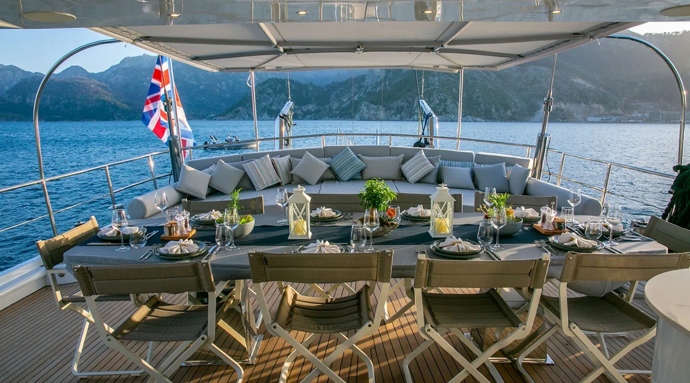 GOOD LIFE offers a generous layout of outdoor living spaces designed for relaxed elegance. The aft deck welcomes guests with a teak dining table and comfortable director-style chairs, ideal for casual breakfasts or sunset dinners. Further forward, the foredeck is home to a striking circular jacuzzi surrounded by sun pads, with panoramic views and ample space for lounging.