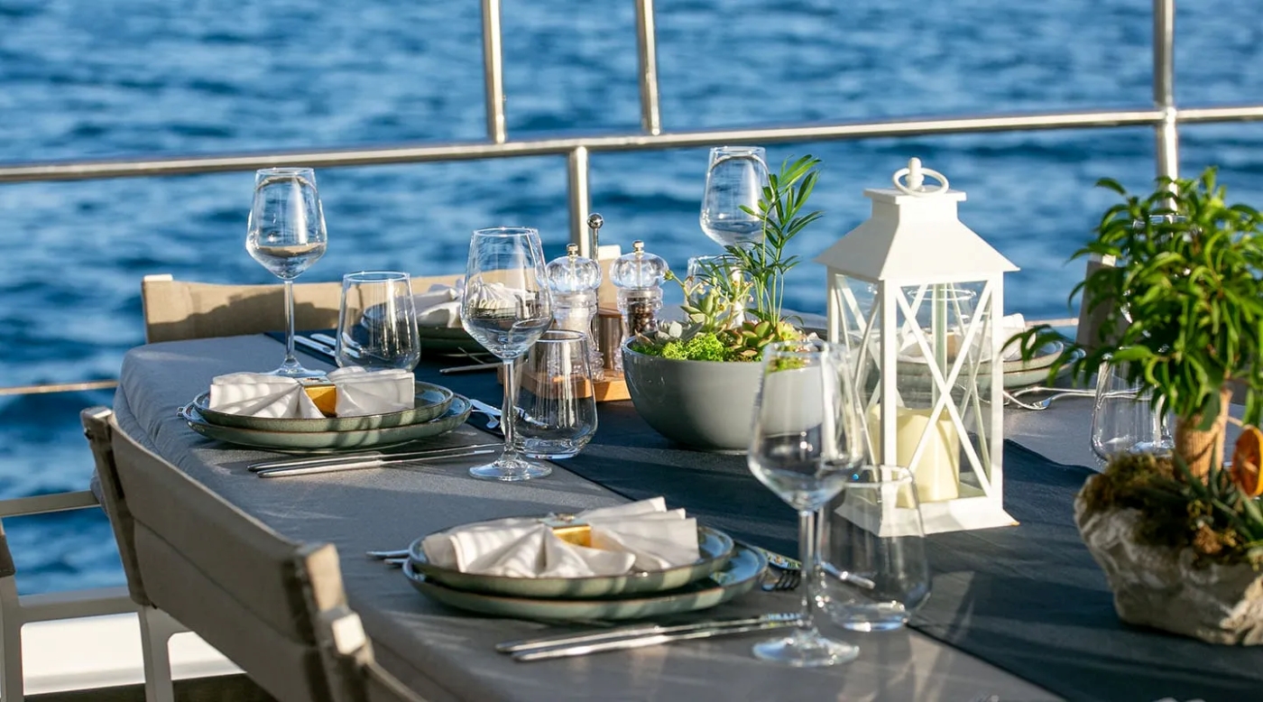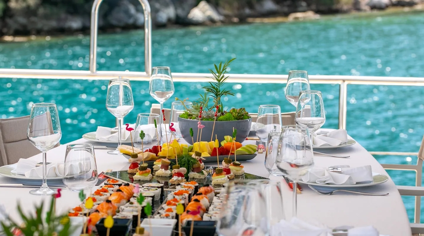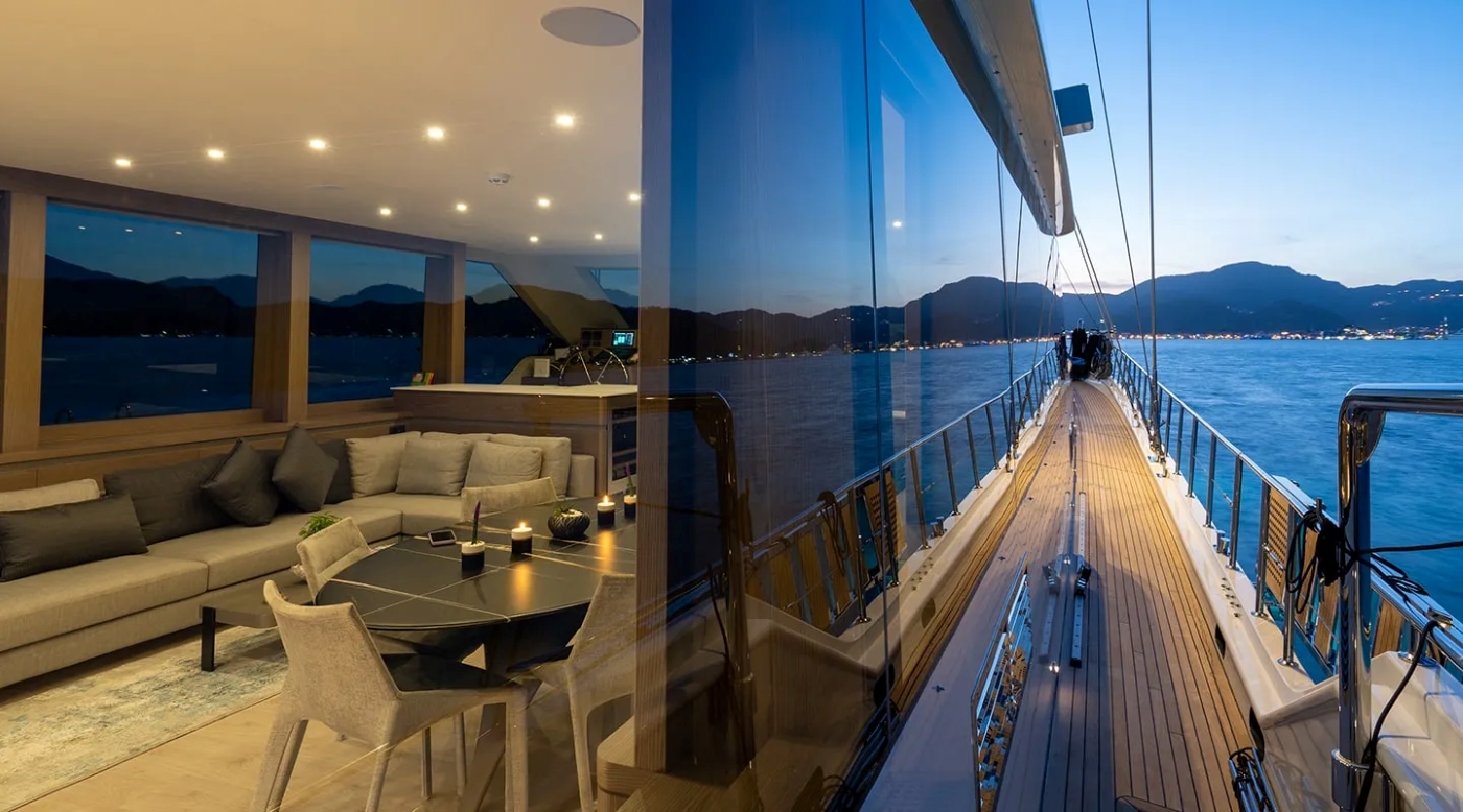 Inside, the yacht’s main salon exudes a relaxed sophistication. Wrapped in floor-to-ceiling windows, it offers a luminous, contemporary atmosphere with plush L-shaped sofas, a flat-screen TV, and a dining table positioned for dramatic ocean vistas. Neutral tones and natural materials create a calm, coastal chic aesthetic.