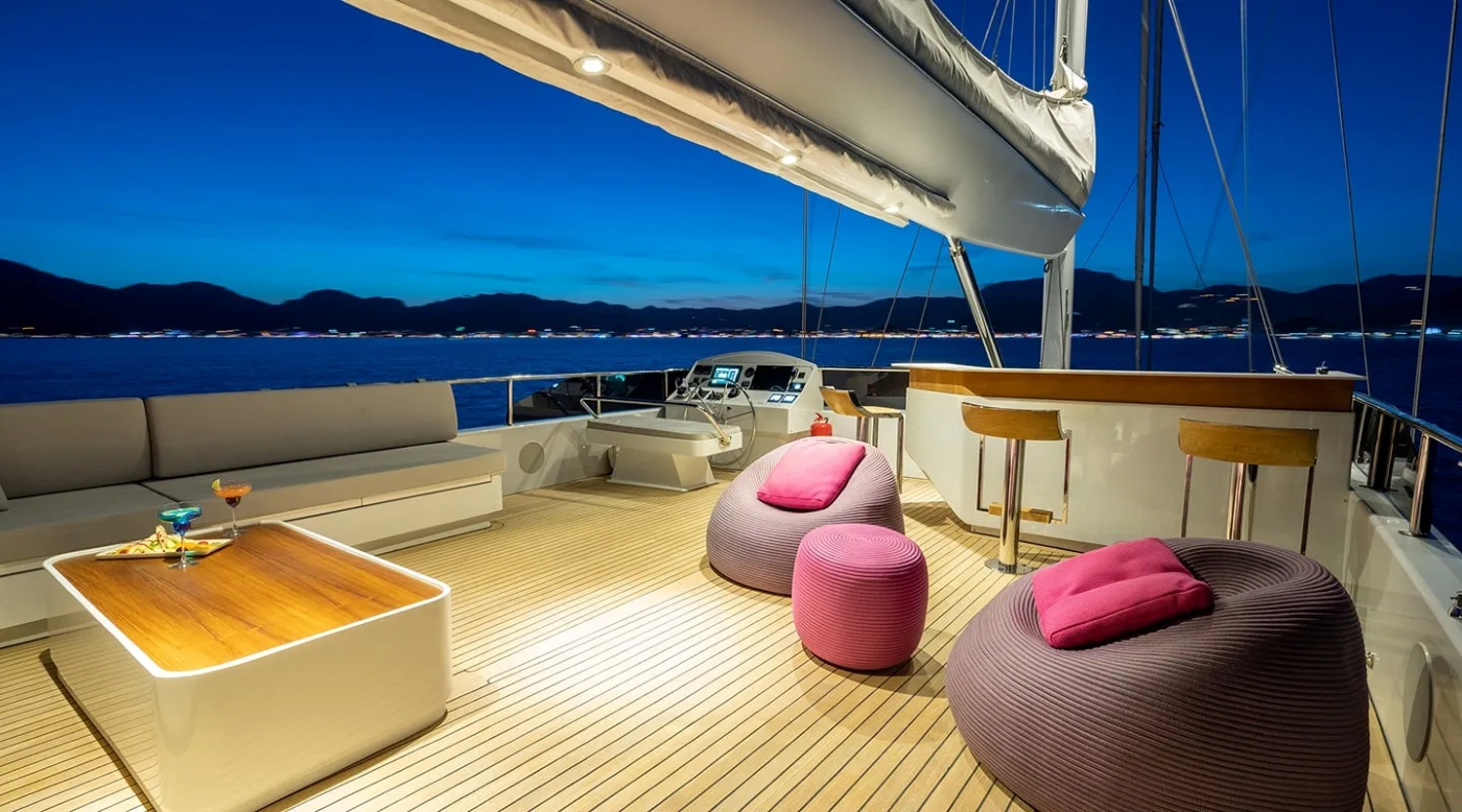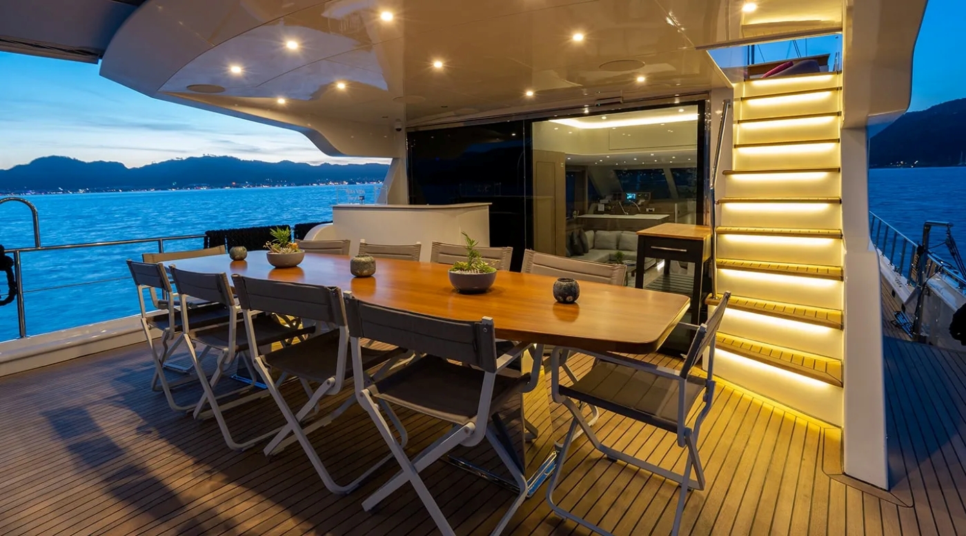 Under sail or at anchor, the expansive decks are beautifully lit at night, creating a serene glow across the water. The flybridge provides yet another social space with bean bags, cocktail tables and shaded spots for relaxation.