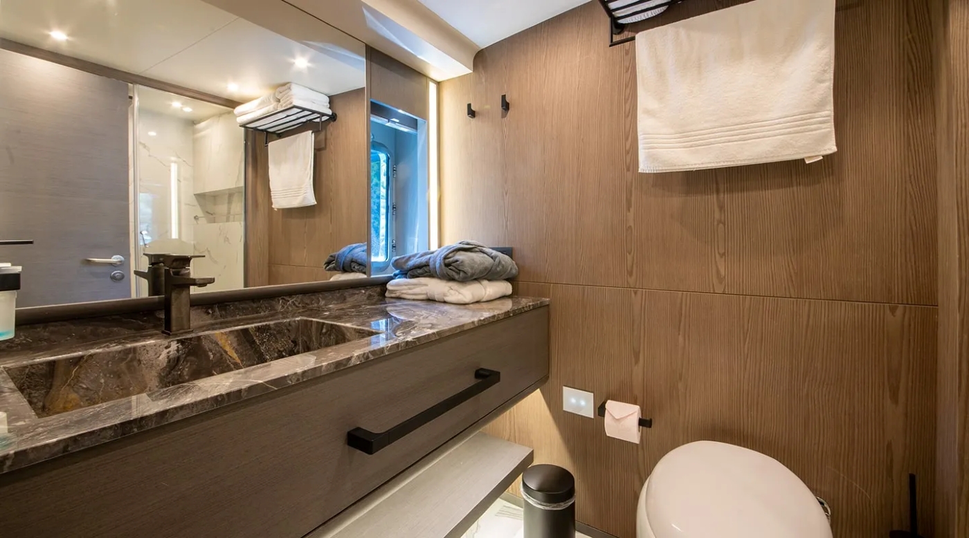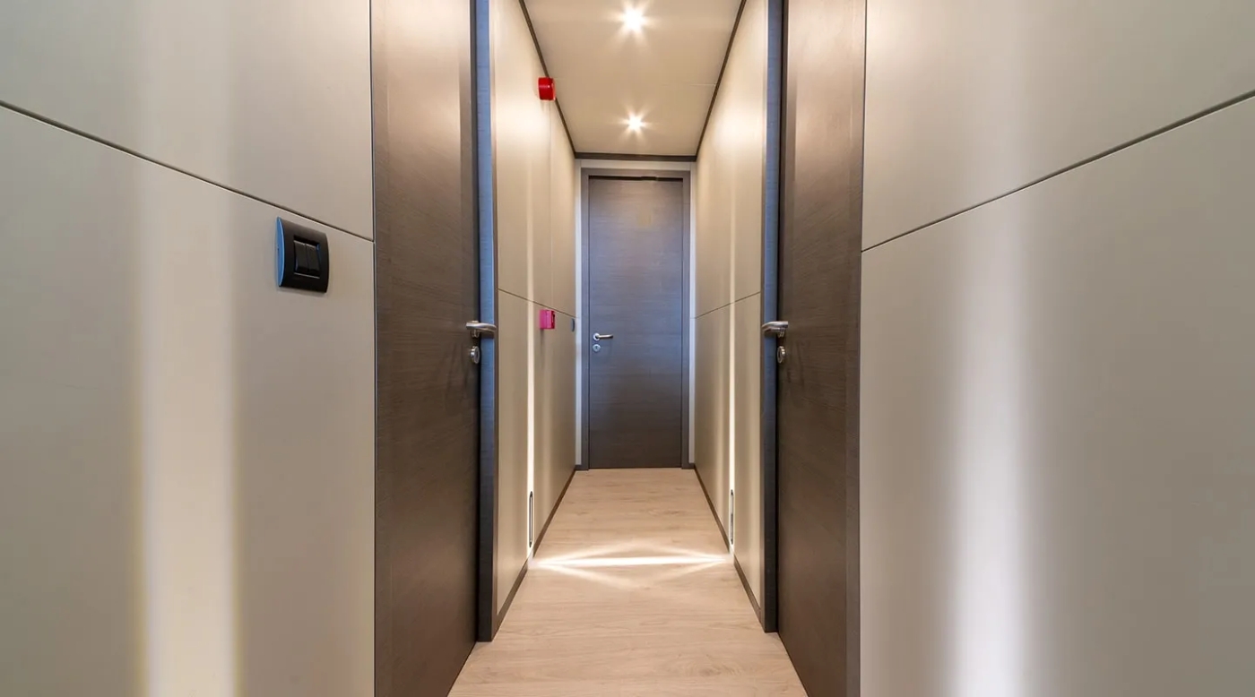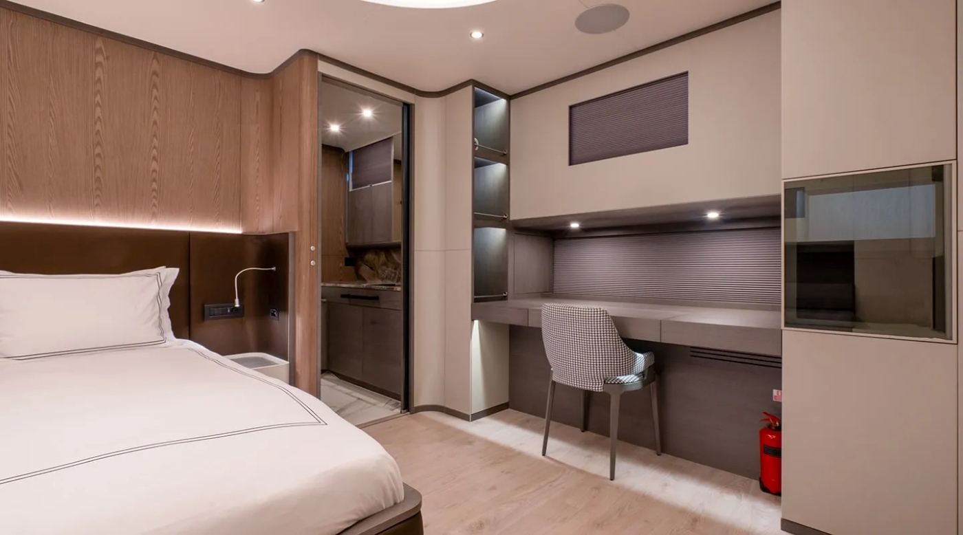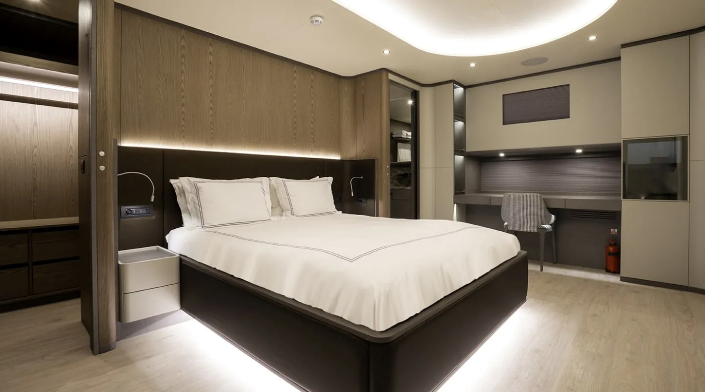 The design cleverly balances open-plan flow with intimate nooks for conversation or reading. Recessed lighting and subtle LED floor accents enhance the evening mood, while wide corridors and clean lines echo the yacht’s spaciousness throughout.