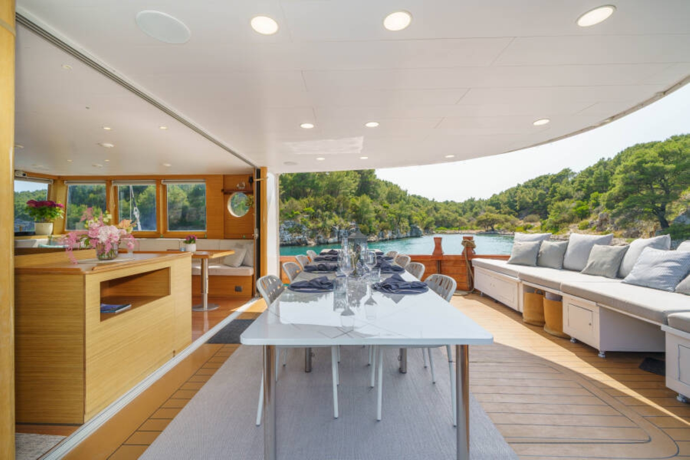 GREEN RAY’s exterior decks are designed with versatility and socialising in mind. The main aft deck features a shaded alfresco dining table where guests can enjoy breakfast or long lunches with sea views. Steps lead down to a broad swim platform – perfect for water sports, boarding tenders, or simply relaxing at the water’s edge.