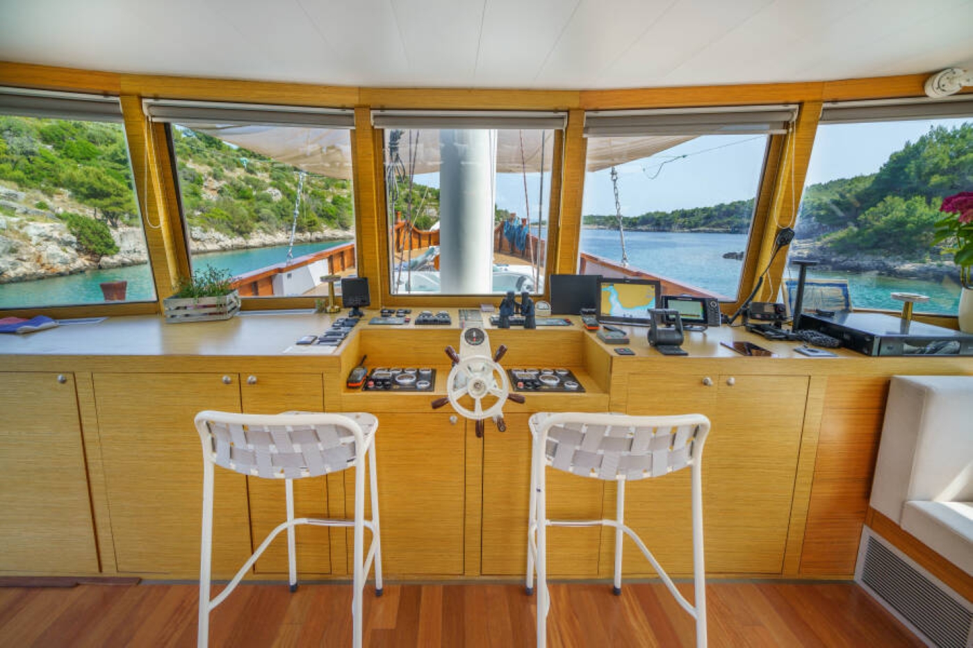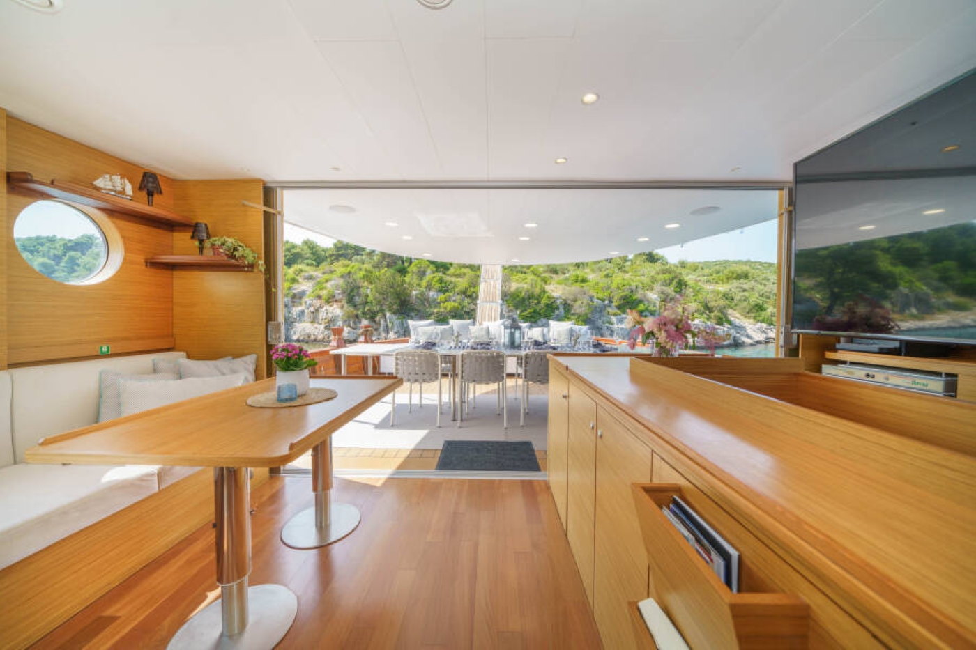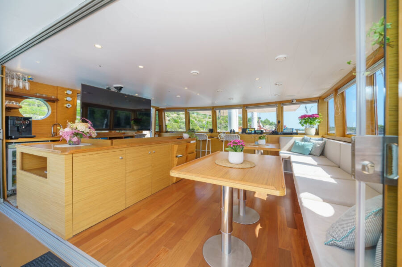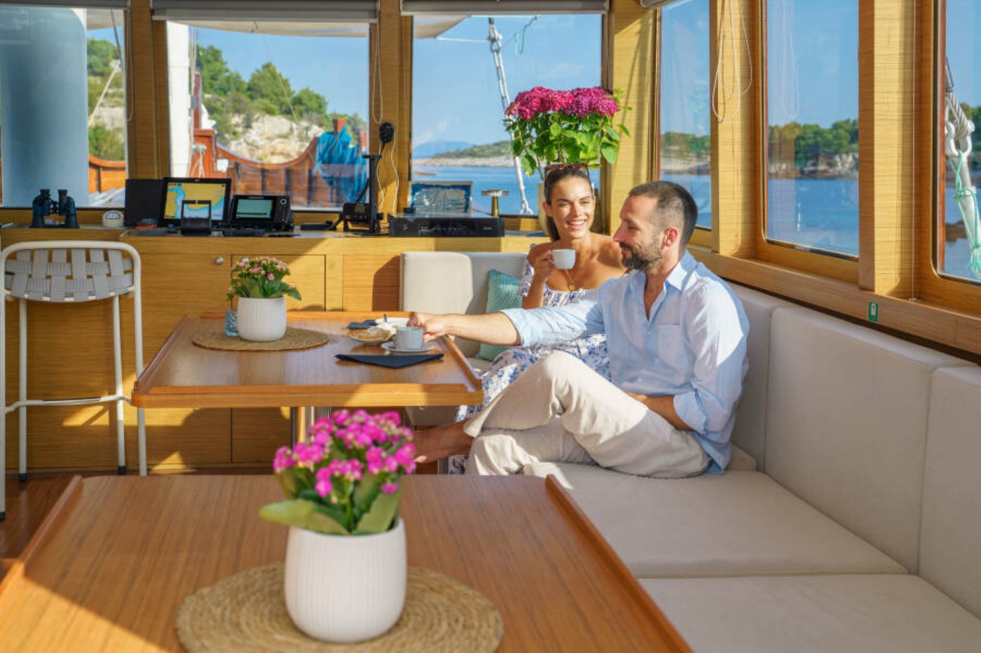 Refined yet informal, the interior palette is anchored in light woods, neutral fabrics, and uncluttered design, appealing to guests who appreciate simplicity with a touch of Scandinavian elegance. Each area feels open and inviting, making full use of the yacht’s 7.8m beam.