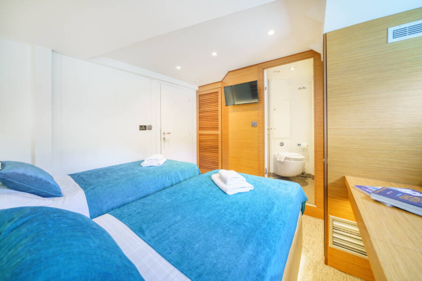 The guest accommodation aboard GREEN RAY comprises: ~ 2 Double cabins with king-sized beds and ensuite facilities ~ 4 Convertible cabins with king-sized beds that can be reconfigured as twins – each with ensuite bathrooms ~ All cabins are finished in a modern, calming style with ensuite facilities and individually controlled air conditioning