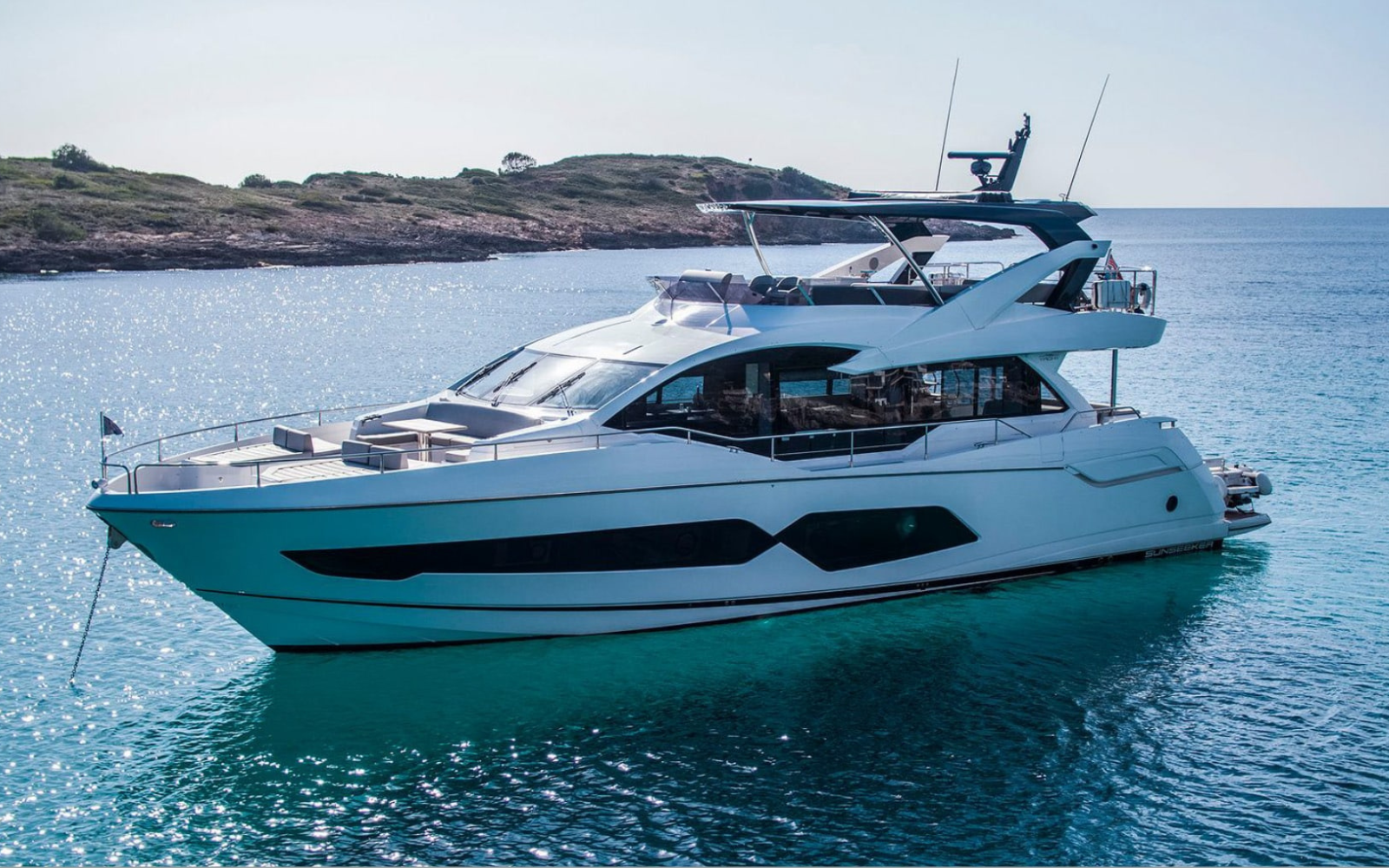 Guest Accommodation: The stunning Sunseeker 76 Yacht delivers everything discerning charter guests expect from a modern luxury yacht, combining exceptional seakeeping, striking design, and generous living spaces throughout. Its sleek profile cuts an impressive silhouette on the horizon, while expansive glazing floods the interior with natural light, creating a strong visual connection with the surrounding seascape. Once on board, the main deck opens into a beautifully designed open-plan living area, offering an almost 360-degree view and an inviting sense of space—perfect for socialising, relaxing, and entertaining. The day area is arranged in a seamless open-space layout, featuring a fully equipped open galley, a comfortable lounge sofa, and a spacious dining table. This layout creates a welcoming, sociable atmosphere where guests can enjoy meals, conversation, and downtime together, all within a refined and contemporary setting. Outdoor living is a defining feature of the yacht. The cockpit can be configured with additional lounge seating, while the stern hosts a stylish mini beach club complete with a barbecue grill, fold-down seating, and a rain shower—an ideal setting for relaxed lunches, sunset aperitifs, or post-swim comfort. The extended bathing platform provides easy access to the sea and ample space for water toys, tenders, and swimming activities. The experience continues on the foredeck, where large sunbeds, flexible seating arrangements, and integrated refrigeration create a versatile social area, equally suited to sunbathing or quiet moments at anchor. Above, the expansive flybridge offers exceptional space and flexibility, enhanced by a sleek composite hardtop with an electric retractable canopy and aft awning, allowing guests to enjoy sun or shade throughout the day. Below deck, the yacht accommodates up to eight guests in four beautifully appointed cabins, ensuring privacy, comfort, and a restful atmosphere. The layout includes a full-beam master cabin with a double bed, a VIP cabin, a double guest cabin, and a convertible (twin or double) cabin, all finished to a high standard with refined materials, ample storage, and elegant en suite bathrooms. Plush bedding and thoughtful details create a calm retreat after a day at sea. A professional crew of three is discreetly accommodated in dedicated quarters, ensuring smooth operations and attentive service throughout the charter, while maintaining guest privacy at all times. Designed to deliver a smooth and comfortable cruise both underway and at anchor, the yacht features advanced stabilisation systems and carefully considered lighting that enhances the onboard ambiance from day to night. Underwater lights further elevate the evening atmosphere, transforming nights at anchor into a truly memorable experience. Whether enjoying a relaxed morning on the foredeck, an afternoon swim from the beach club, or an elegant dinner in the open-plan saloon, this Sunseeker 76 Yacht is perfectly configured to offer a sophisticated yet effortless charter lifestyle—ideal for guests seeking comfort, style, and unforgettable moments on the water.