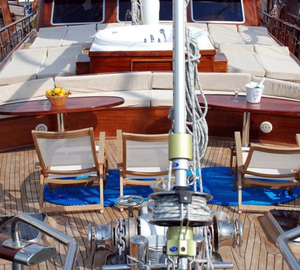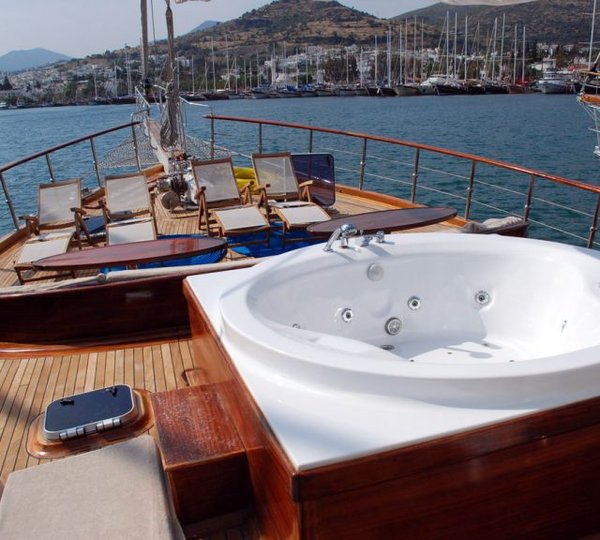 Luxury Gulet Sagapo offers her guests plenty of deck space to soak up the Mediterranean sunshine. She has twelve comfortable sun-loungers on her forward deck so everyone can relax and sunbath together. Sagapo is also one of the only Gulets in Turkey to feature a Spa Pool on deck. Alfresco dining on the aft deck for twelve is also another fantastic feature of this luxury Gulet.