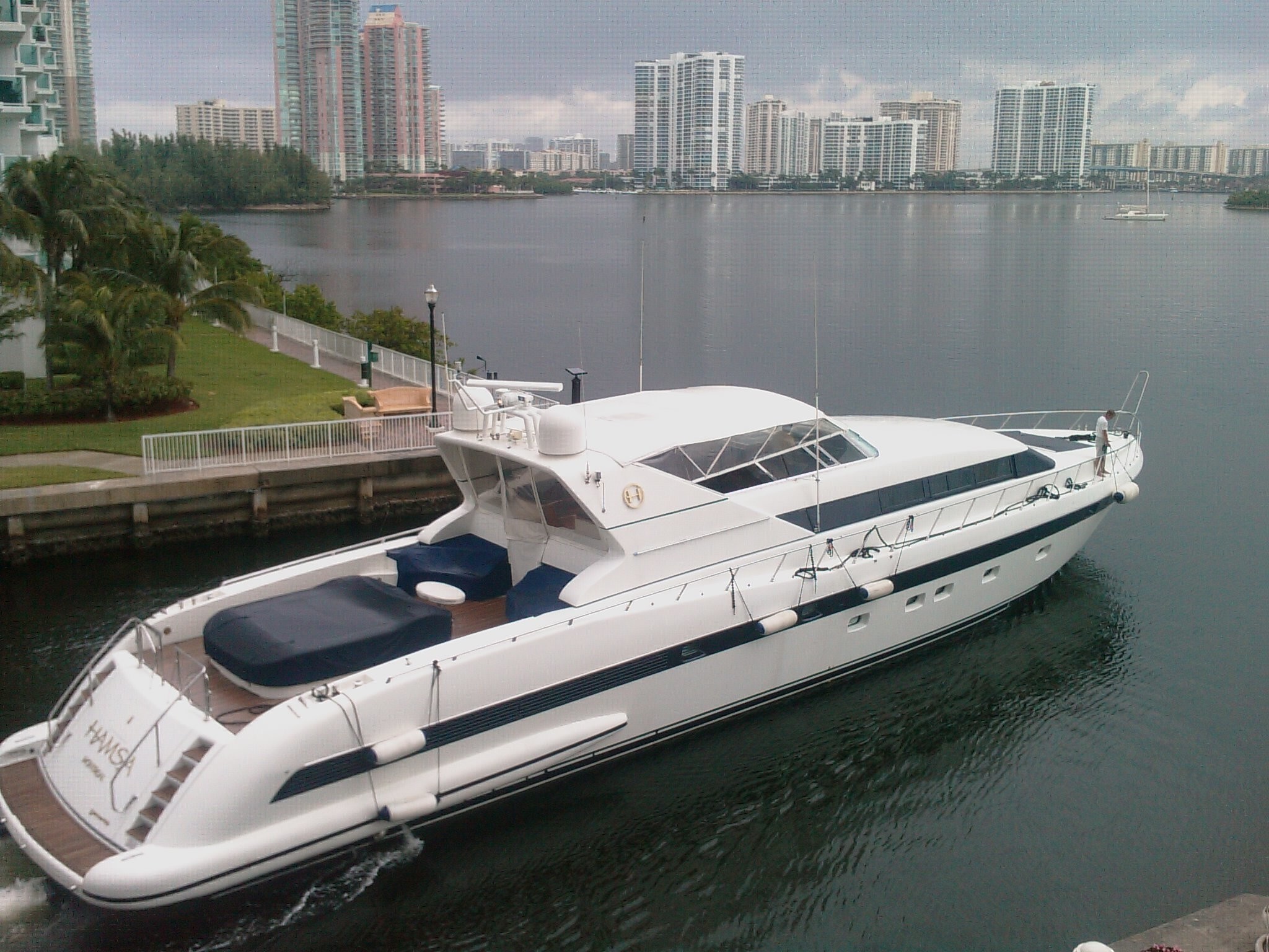 The motor yacht HAMSA is a 32 metre 105 (ft) well proportioned composite ship which was produced from the keel up at Overmarine (Rodriguez Group) and conceived from the design board of Studio Bacigalupo and Stefano Righini. The well proportioned sports style yacht HAMSA is a very well designed Italian built superyacht which was launched to accolade in 2000. Accommodating 8 passengers and 4 qualified crew, motor yacht HAMSA was named Mangusta 105. The naval architecture office which delivered the design work for this ship is Studio Bacigalupo and Stefano Righini. She could be described as a modern sports style yacht.