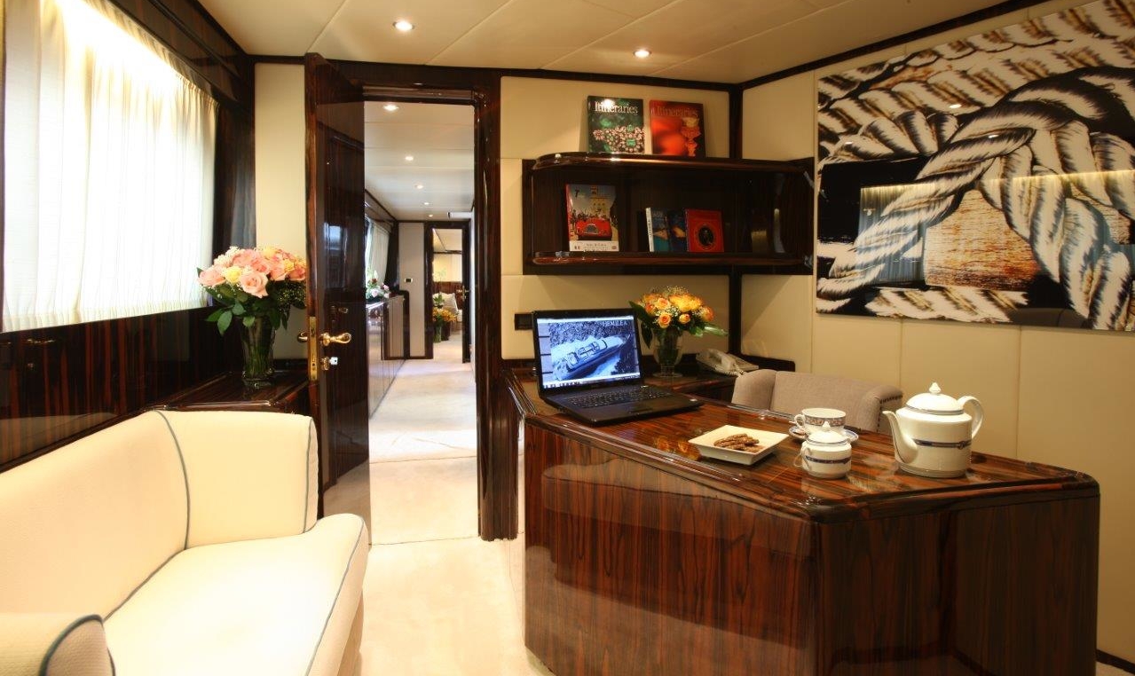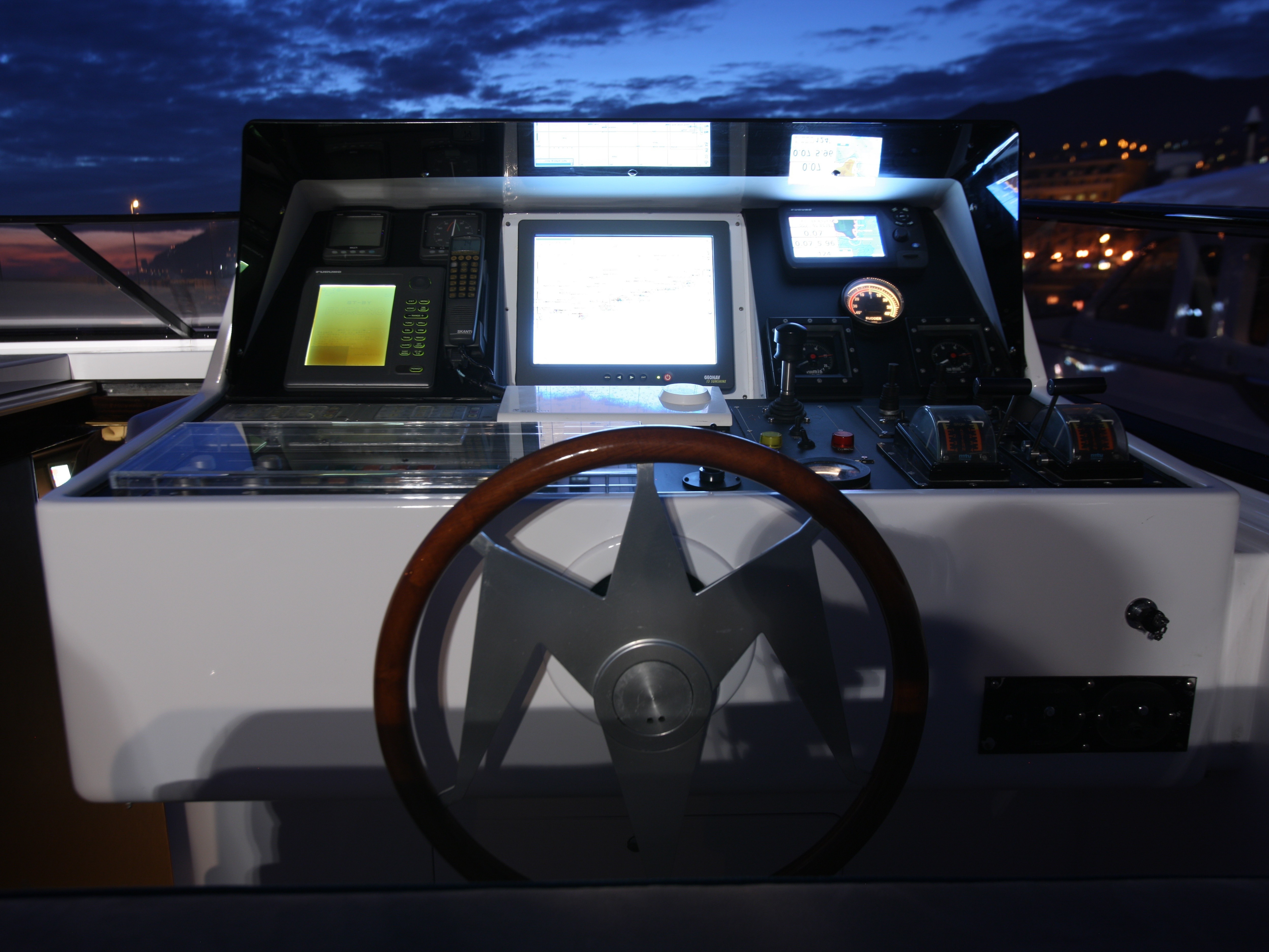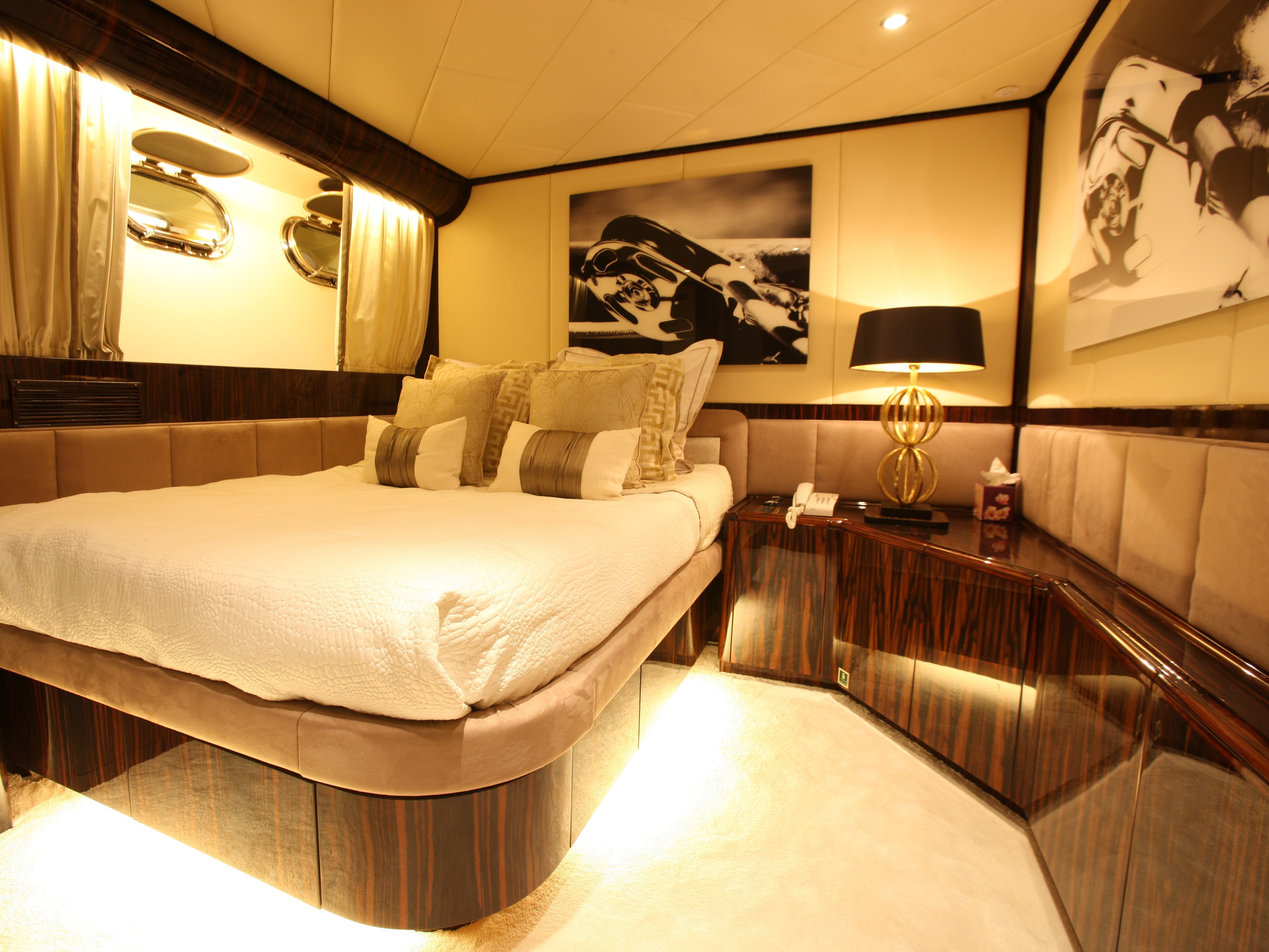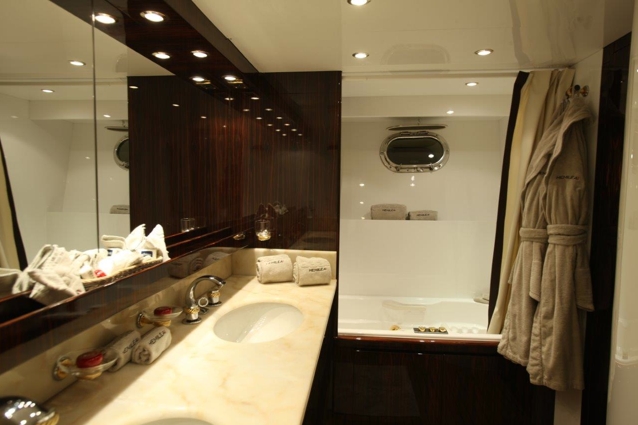 This ship is propelled by two robust MTU main engine(s) and can find a exhilarative top continuous speed at 31 knots. The engine of the HEMILEA gives 2230 horse power (or 1641 kilowatts). Her total HP is 4460 HP and her total Kilowatts are 3282. Connected to her MTU engine(s) are twin water jets (kamewa). As for thrusters she uses Richfield. This yacht’s animated cruising speed is 28 knots which provides a range of 3500.