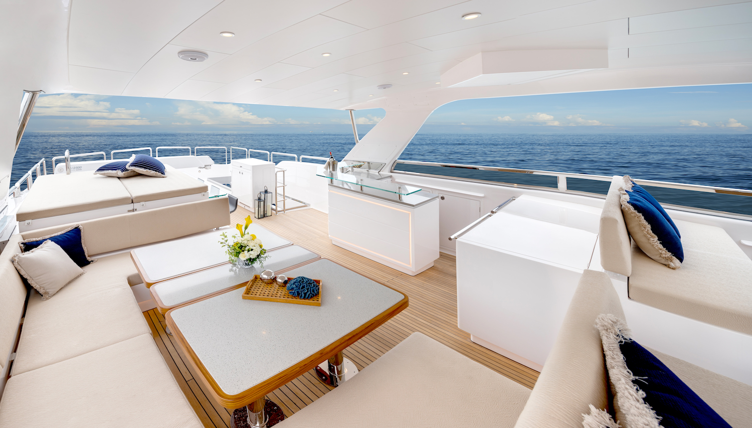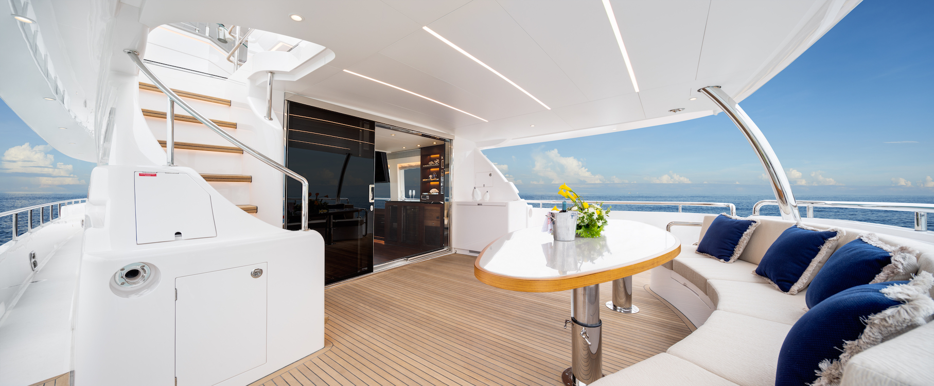 Side walkways lead around to the foredeck, where there is a plush C-shaped sofa surrounding a drinks table and a sunbed farther forward where guests can rest and take in uninterrupted forward views.