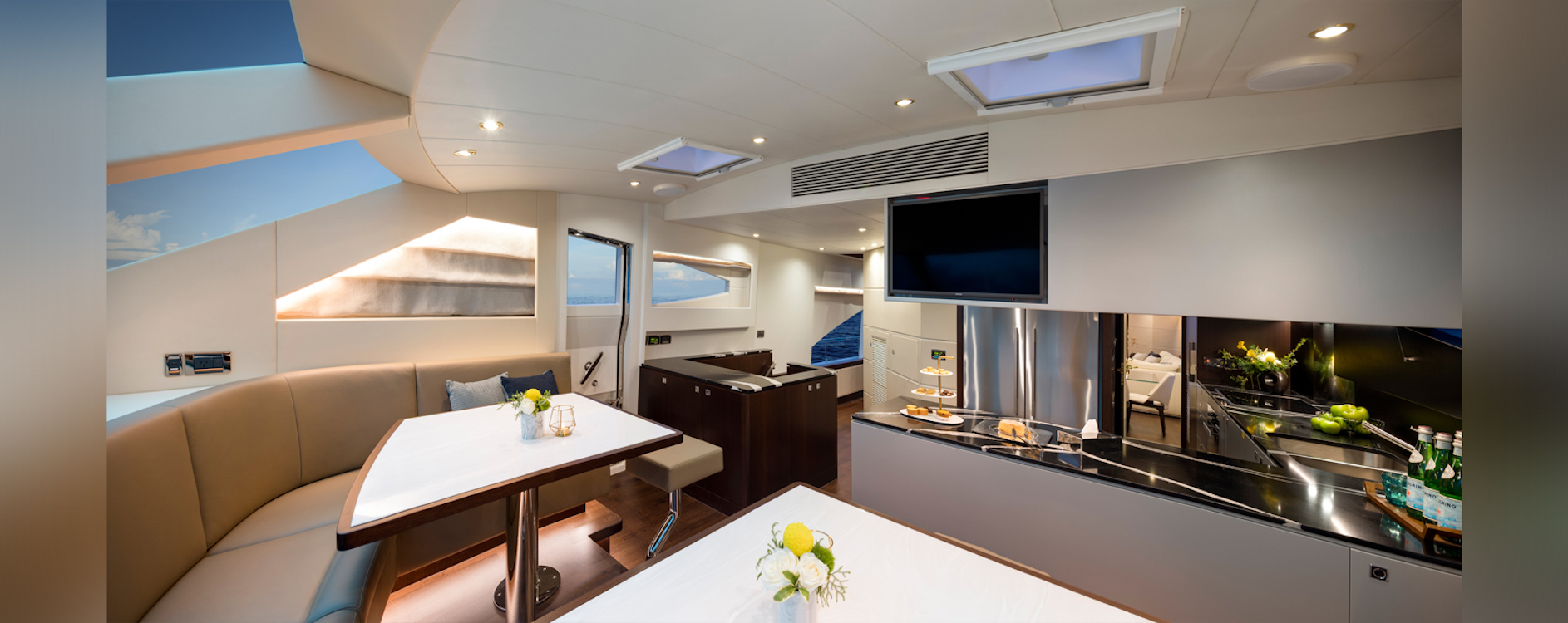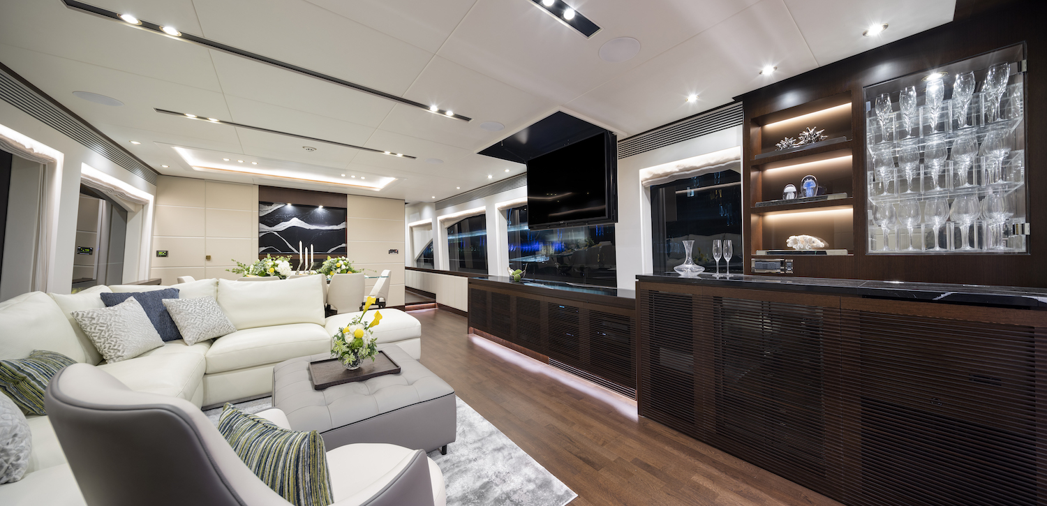 On the main deck the forward section hosts the fully-equipped galley with the forward seating beneath the windows curving around two elevated tables. Aft of the galley is the formal dining area which seats up to eight guests in elegant modern surroundings, and the aft area of the open-plan space is fitted with cabinetry to starboard which holds crystal glasses, while a widescreen TV drops down from the ceiling.
