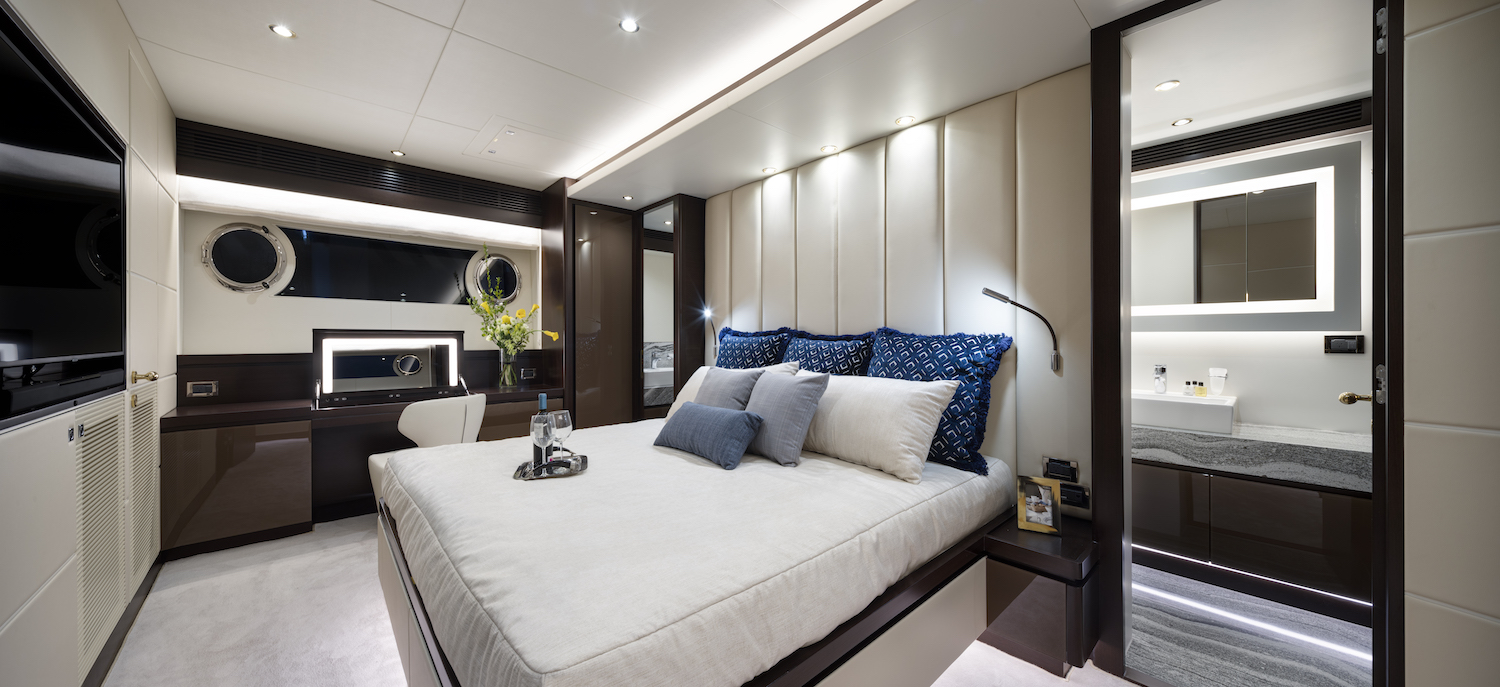 The accommodation sleeps a maximum of 8 guests over 4 en-suite cabins: 1 Master suite, 1 VIP stateroom and 2 twin cabins. ~ All cabins are placed on the lower deck, with the Master suite amidships to take advantage of the full-beam. There is a full-sized bed with a widescreen TV opposite, a desk/vanity and an en-suite bathroom behind. The VIP stateroom is placed in the bow, with the twin cabins to port and starboard between the two larger cabins. ~ The crew of 3 will ensure that all guests onboard receive the first-class service throughout their time onboard.