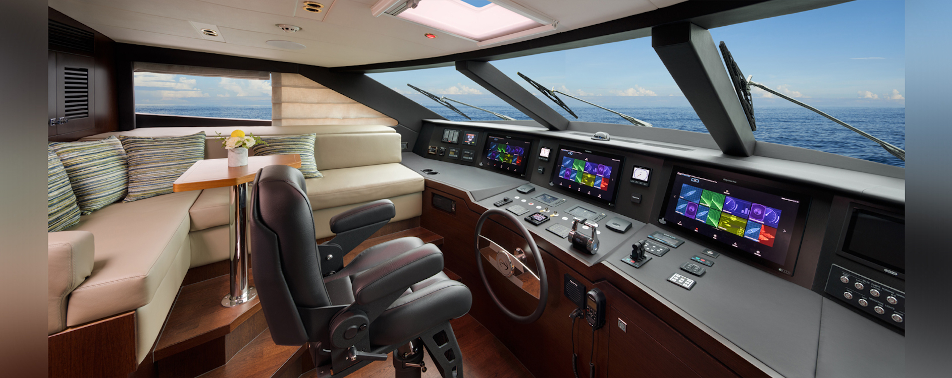 The flybridge above has a forward-facing corner sofa to port with a table for casual dining or resting with hobbies.