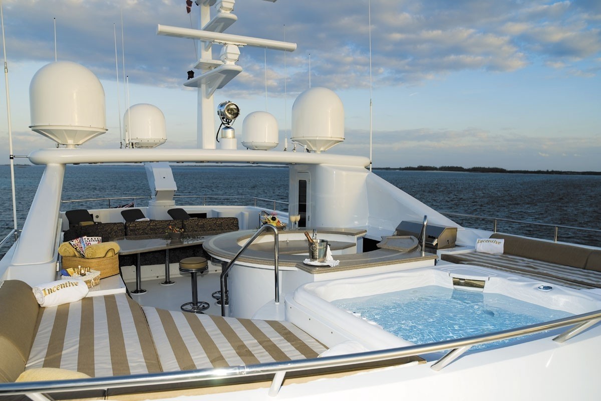 The yacht's wider design collaboration came from Vripack Naval Architects and Dick Boon. The technical naval architect plans are a products of Vripack Naval Architects. Motor Yacht INCENTIVE received her stylish interior designing from the interior design firm of Claudette Bonville. In 2004 she was formally launched with celebration in Sturgeon Bay WI and post sea trials and final completion was thereafter handed over to the owner. Palmer Johnson Yachts completed their new build motor yacht in the United States. The hull was crafted from aluminium. The motor yacht superstructure is made for the most part with aluminium. With a width of 8.53 m / 28 ft INCENTIVE has fairly large size. She has a shallow draught of 2.23m (7.3ft).