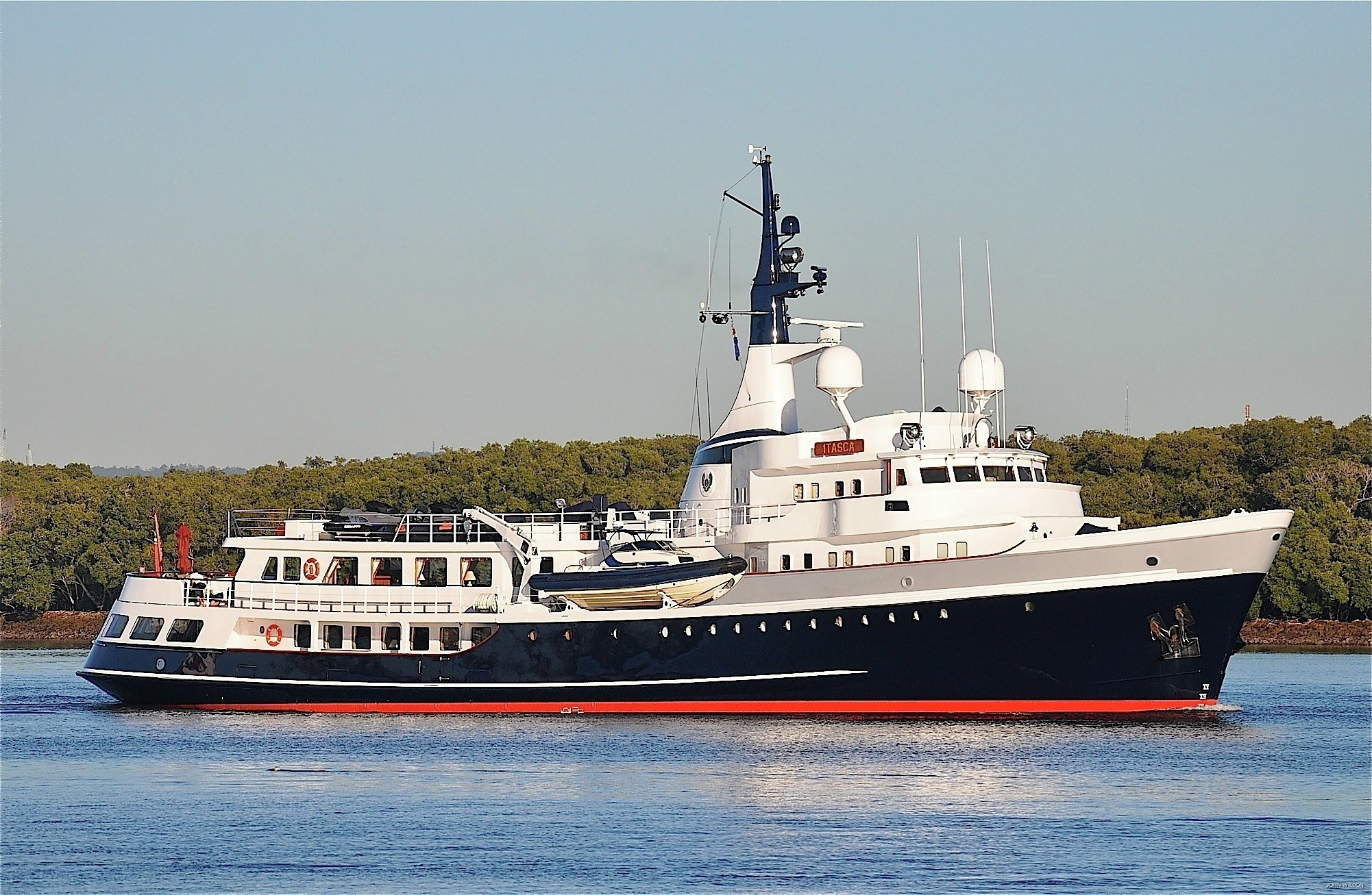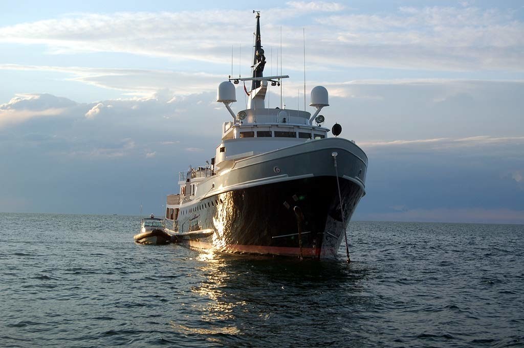 The 53,55m (175.7 ft) Smitt Holland ITASCA has 71,855 gallon fuel tanks. This expedition yacht has travelled the world and perhaps has one of the most impressive lists of cruising itineraries for a luxury motor yacht. From the Bering Strait to Cape Horn to the icy world of Antarctica, this fuel efficient boat can travel 13,000 nautical miles at 11 knots before having to re-fuel.