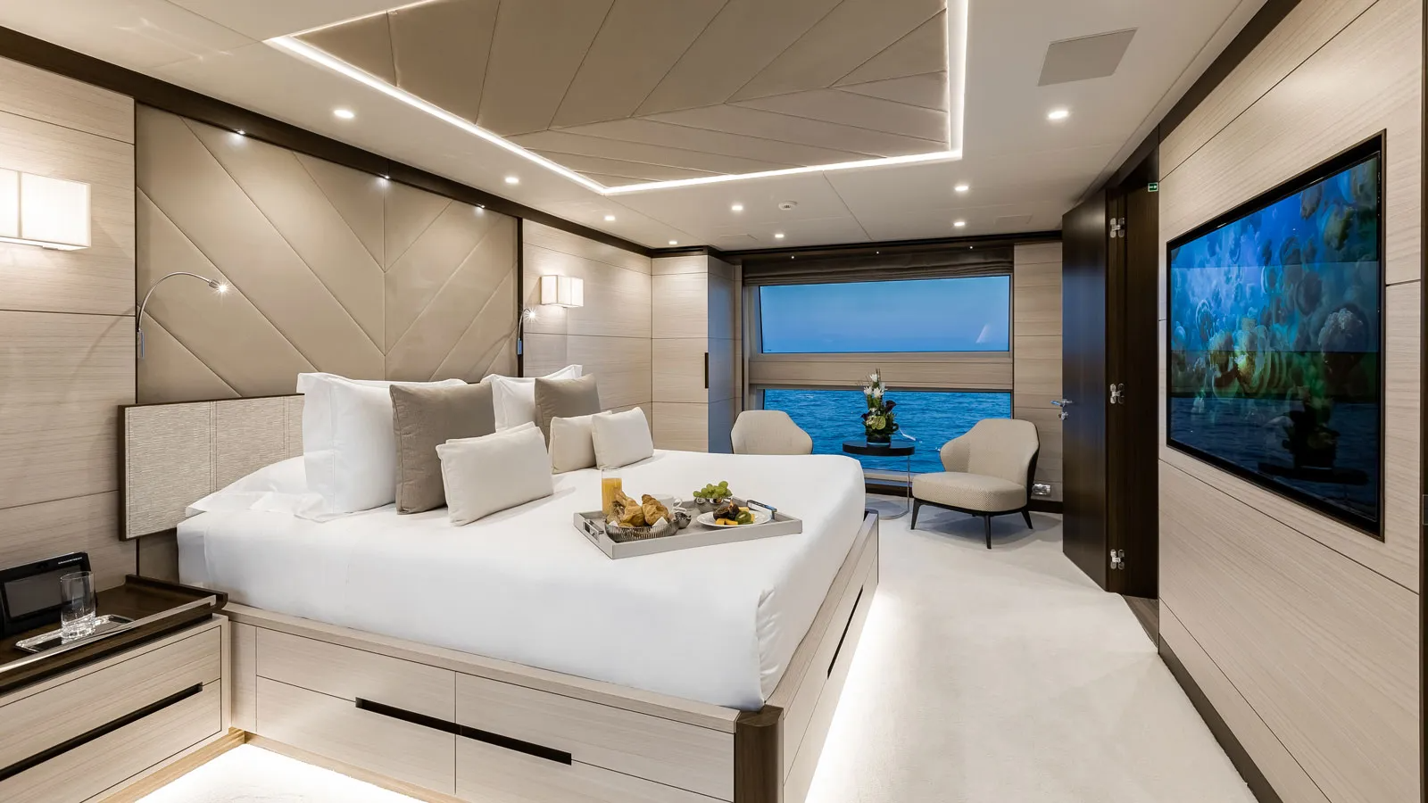 The owner's suite is equipped with a king-size bed, ensuite bathroom and a dressing room. The lower deck hosts 2 double cabins and two twin cabins.