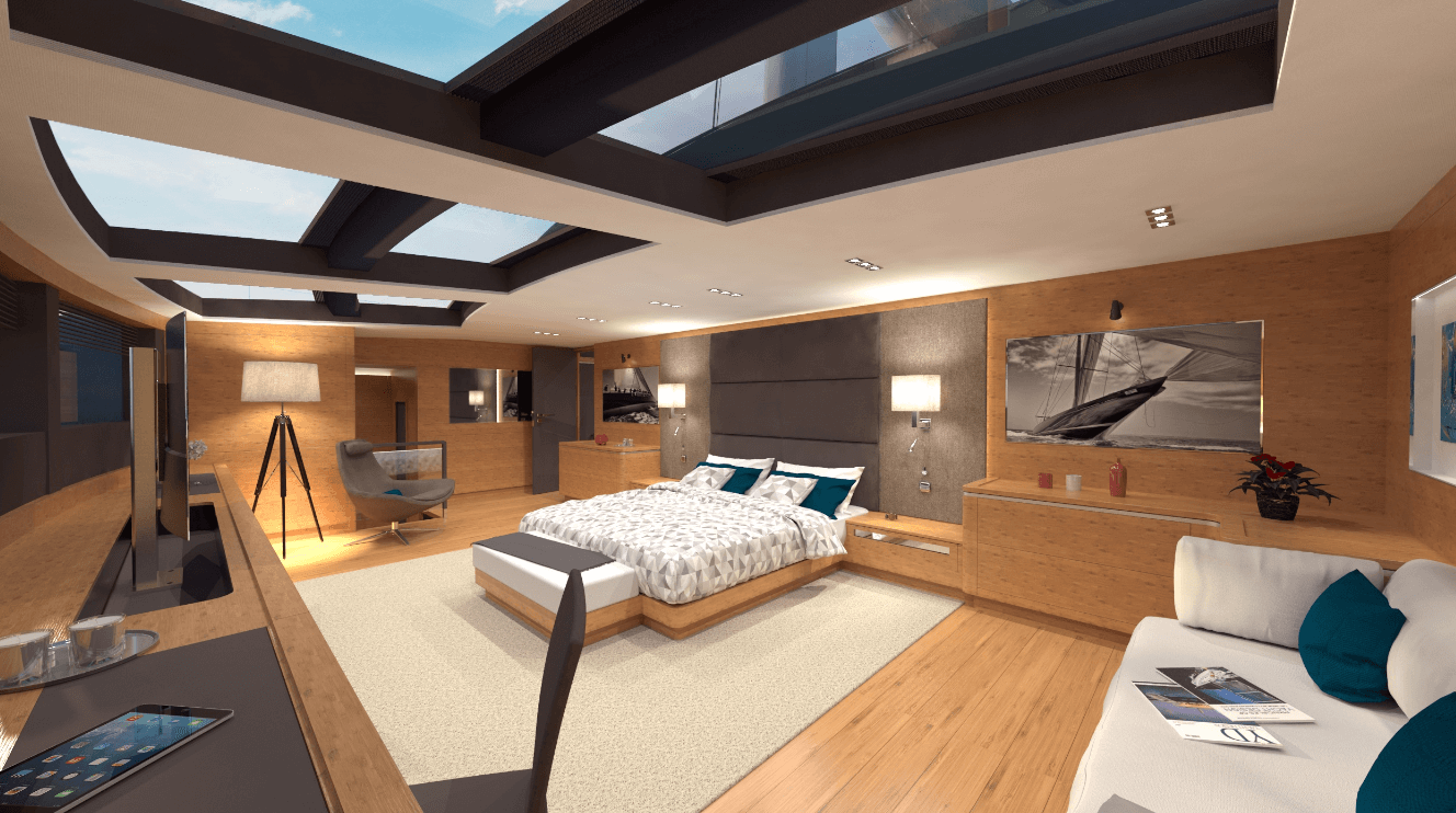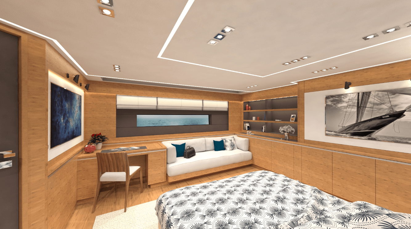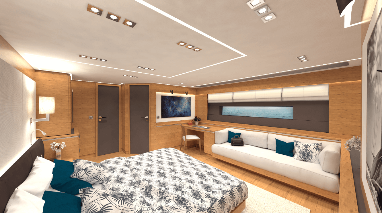 The acocmmodation is provided for up to 10 guests in 5 cabins. The master suite is placed forward on the lower deck, while two twin and two double cabins are placed on each side of the hull.
