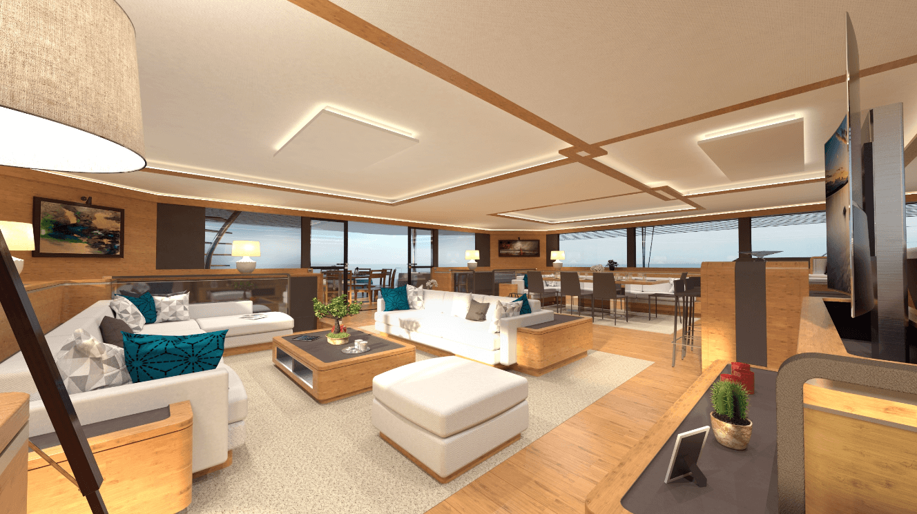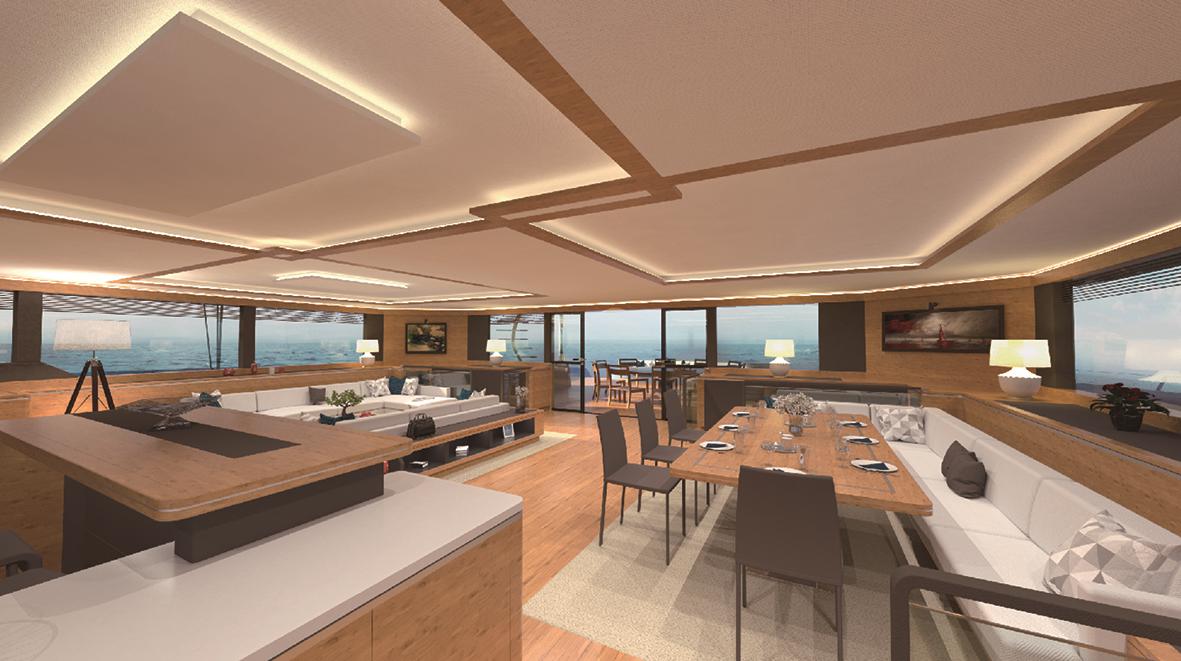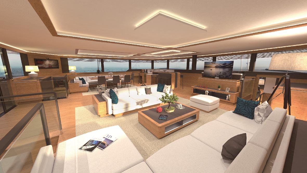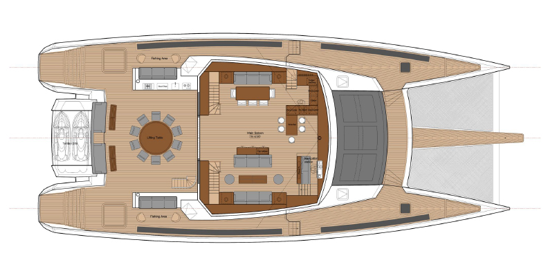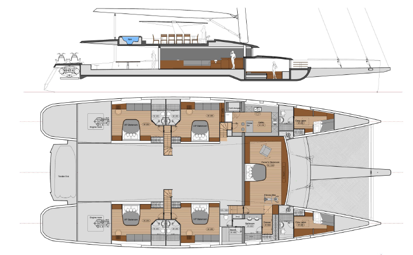 The acocmmodation is provided for up to 10 guests in 5 cabins. The master suite is placed forward on the lower deck, while two twin and two double cabins are placed on each side of the hull.