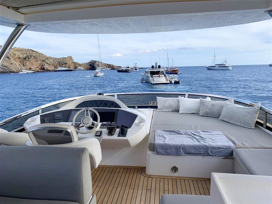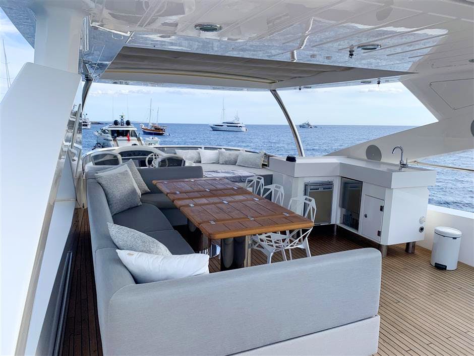 This Sunseeker 86 is a flybridge version which offers multiple deck space for guests to relax and entertain. Her lower aft deck offers lounging and her foredeck offers a further lounge and table. LI-JOR also enjoys a spacious and functional flybridge with a helm station, chaise lounges, sunpads, outdoor sofa, an alfresco dining table and an outdoor galley with a grill, deep fryer and a teppanyaki cooker.