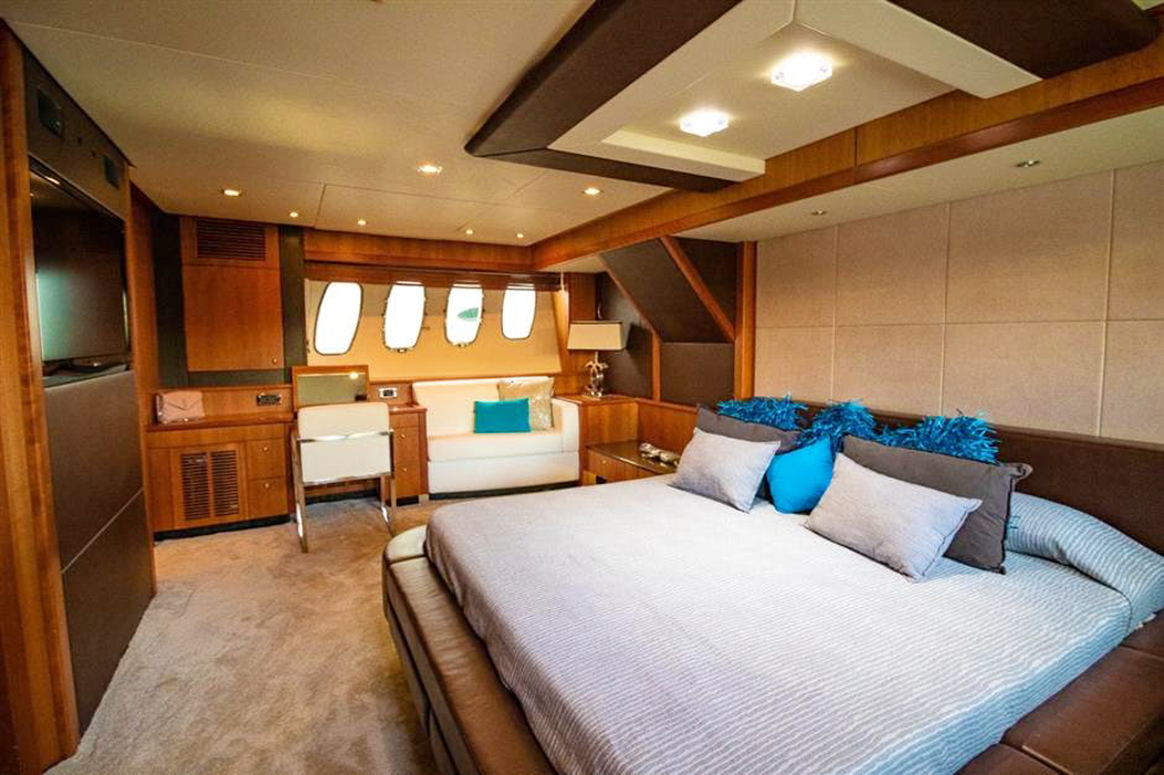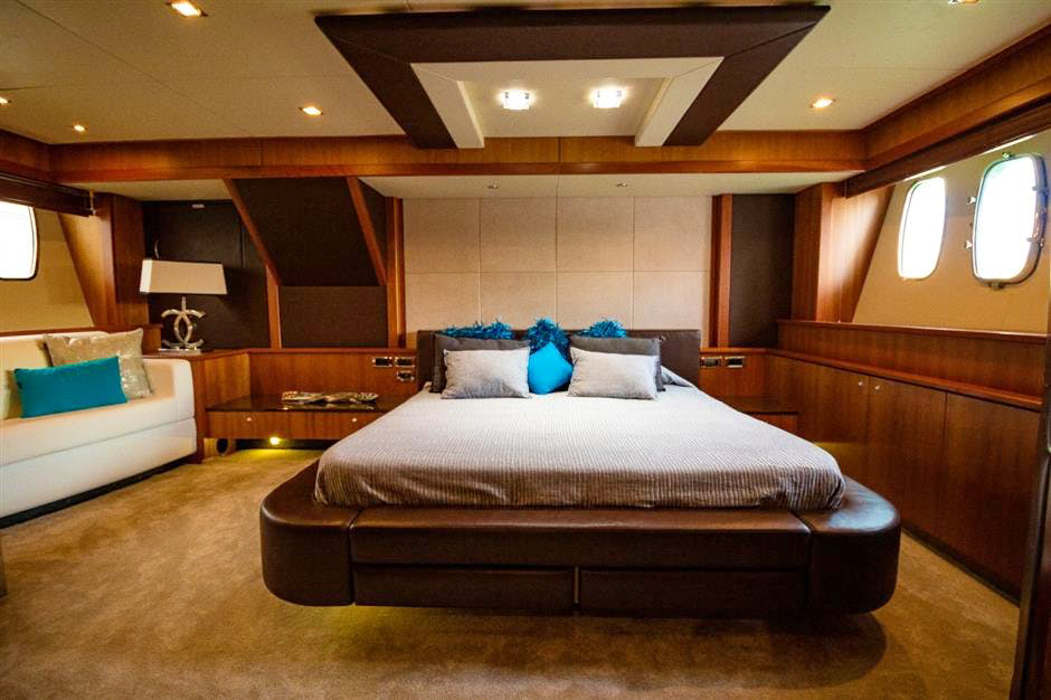 Luxury yacht LI-JOR can accommodate up to 10 guests in 4 cabins. The master suite is full beam and amidships and features a walk-around double bed, vanity and en-suite facilities. The VIP stateroom is forward and full beam of the yacht with a walk-around double bed and en-suite facilities. A further 2 twin cabins offer 2 single beds and Pullman berth each, both cabins have en-suite facilities. All cabins are stylishly decorated in a simplistic relaxing tone and offer plenty of natural light.