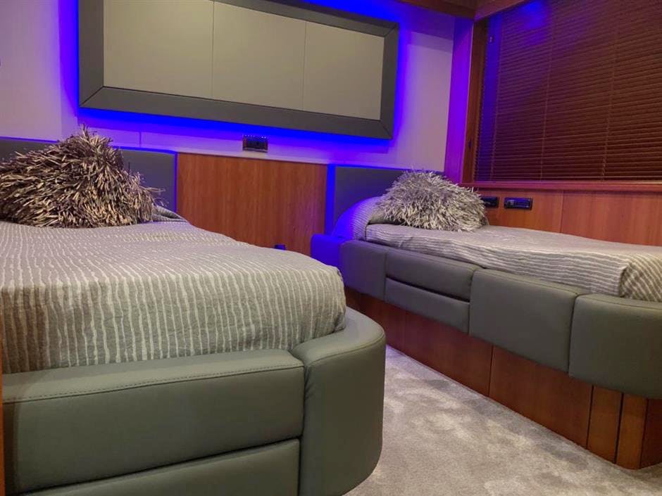 Below decks, LI-JOR is equally as spacious and offers a level of volume that would be difficult to beat on a yacht of her length. Her accommodation includes two full-beam cabins plus two twin cabins each fitted with an additional Pullman. She can, therefore, sleep 8 guests comfortably or 10 by utilizing the Pullman berths. Each cabins is fitted with an ensuite bathroom.