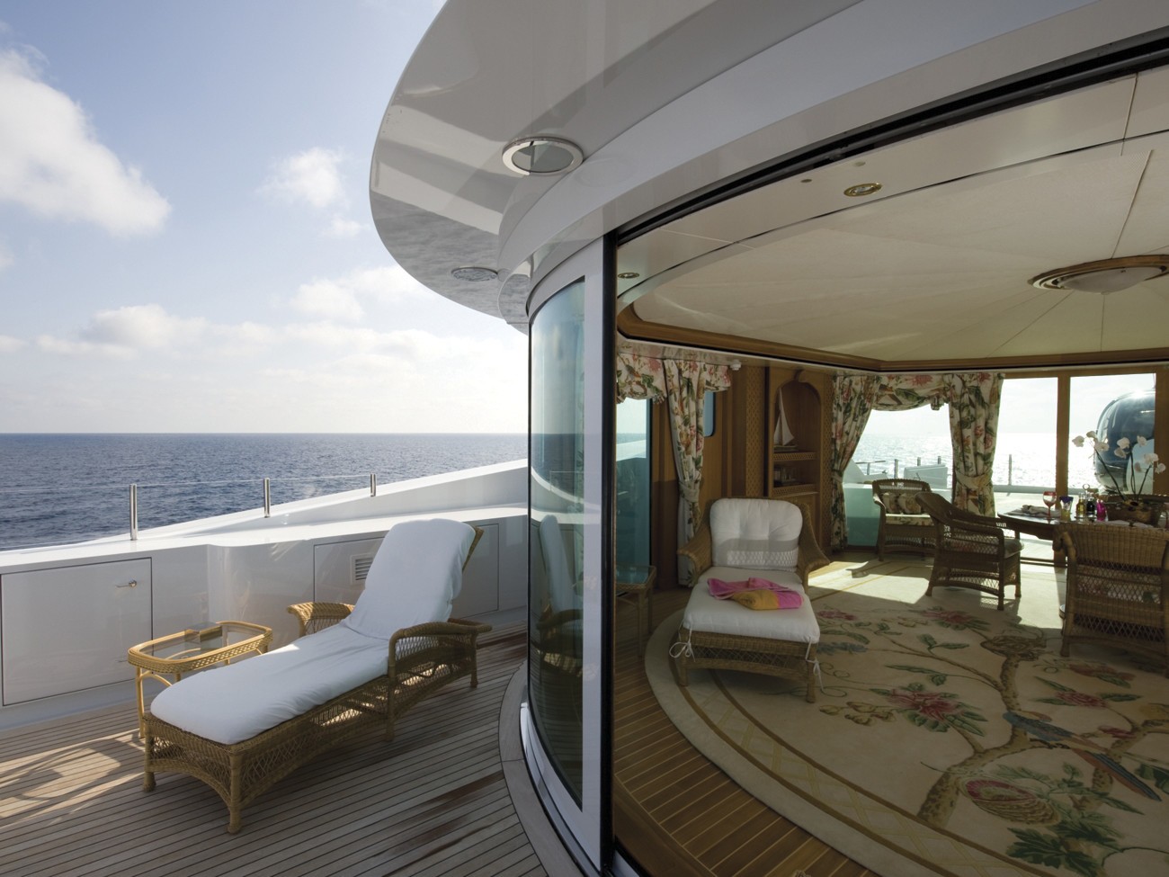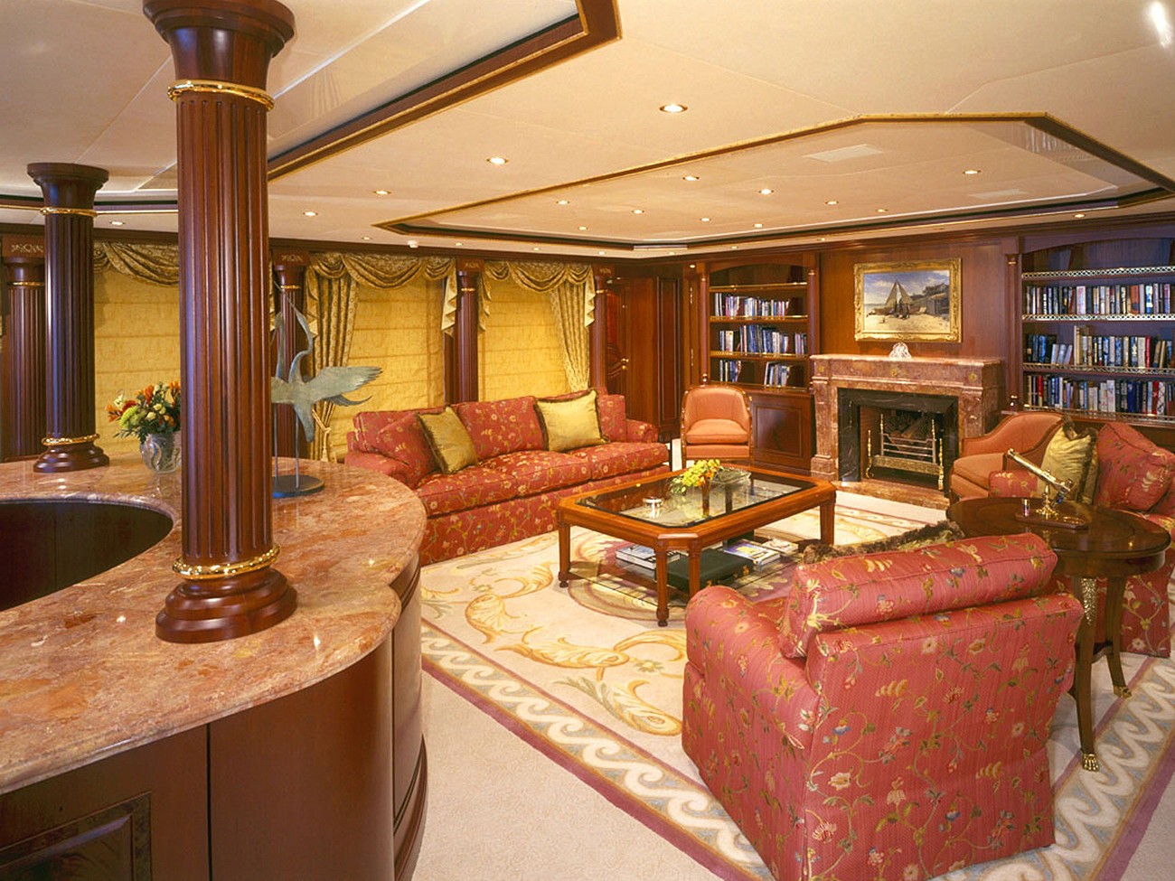 QUEEN MAVIA's layout was initially designed by Oceanco's in-house studio, the "A" Group, with detailing executed by Gerard P Villate of Gerard Interiors, Monaco. The interior is finished to an exceptional standard with traditional raised-and-fielded panelling in Cuban mahogany, outlined in burr elm. In several compartments there are tables by Alain Lejeunne of Cannes, using a variety of precious woods for marquetry and banding, while additional freestanding furniture is by Baker, Knapp & Tubbs of the USA and English furniture makers, Arthur Brett & sons.