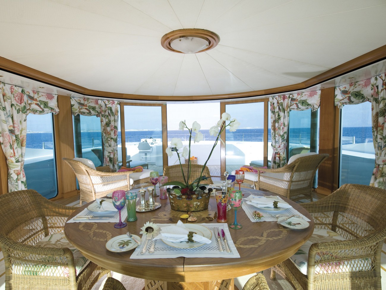 On the main deck, the formal dining is separated from the salon in a room which enjoys superb panoramic views through a semicircle of windows.