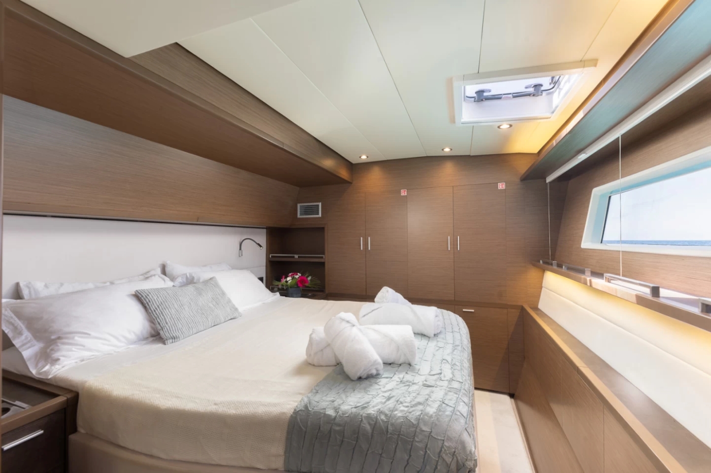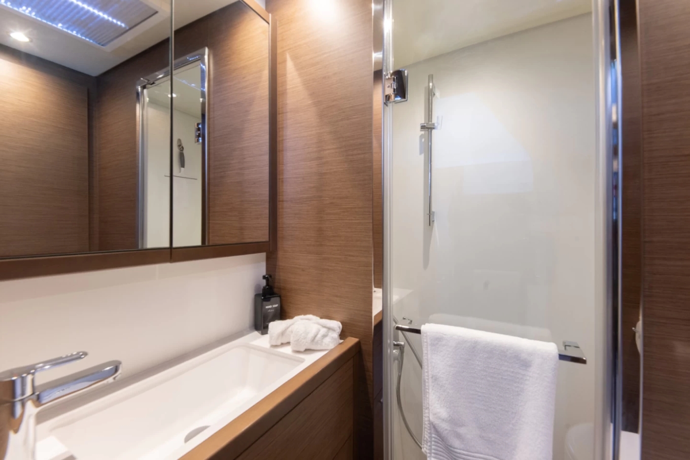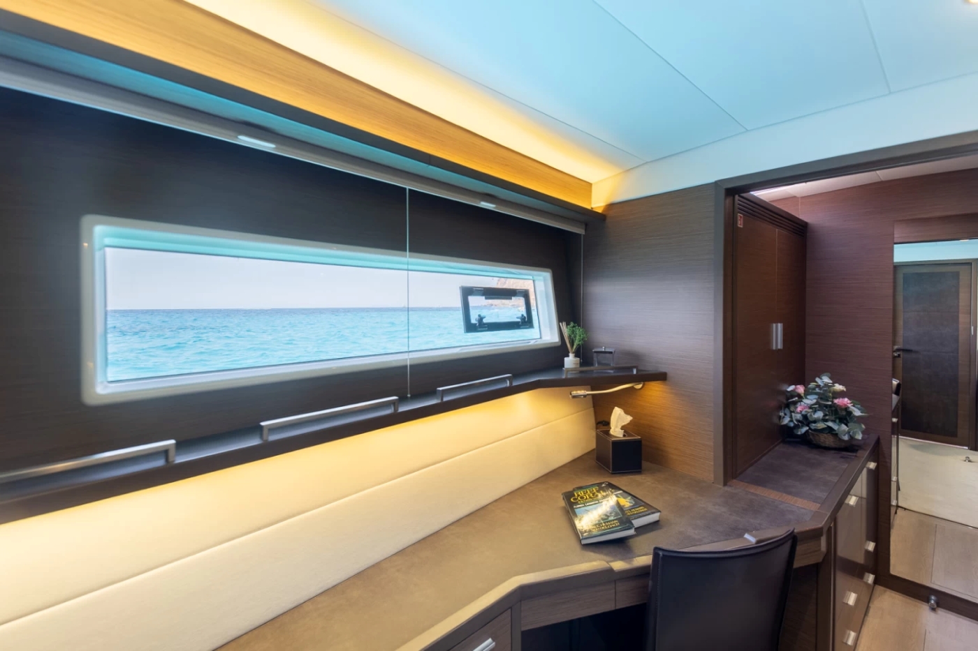 The yachts interiors were completed by Nauta Design and feature a lovely neutral decor. Her main salon is surrounded by vertical windows and offer large sliding glass doors leading directly onto the shaded aft deck, making it ideal for gathering with family and friends. Relax in the salon on one of 2 generous sofas, 2 tables to starboard convert into a formal dining space, giving the salon great versatility.