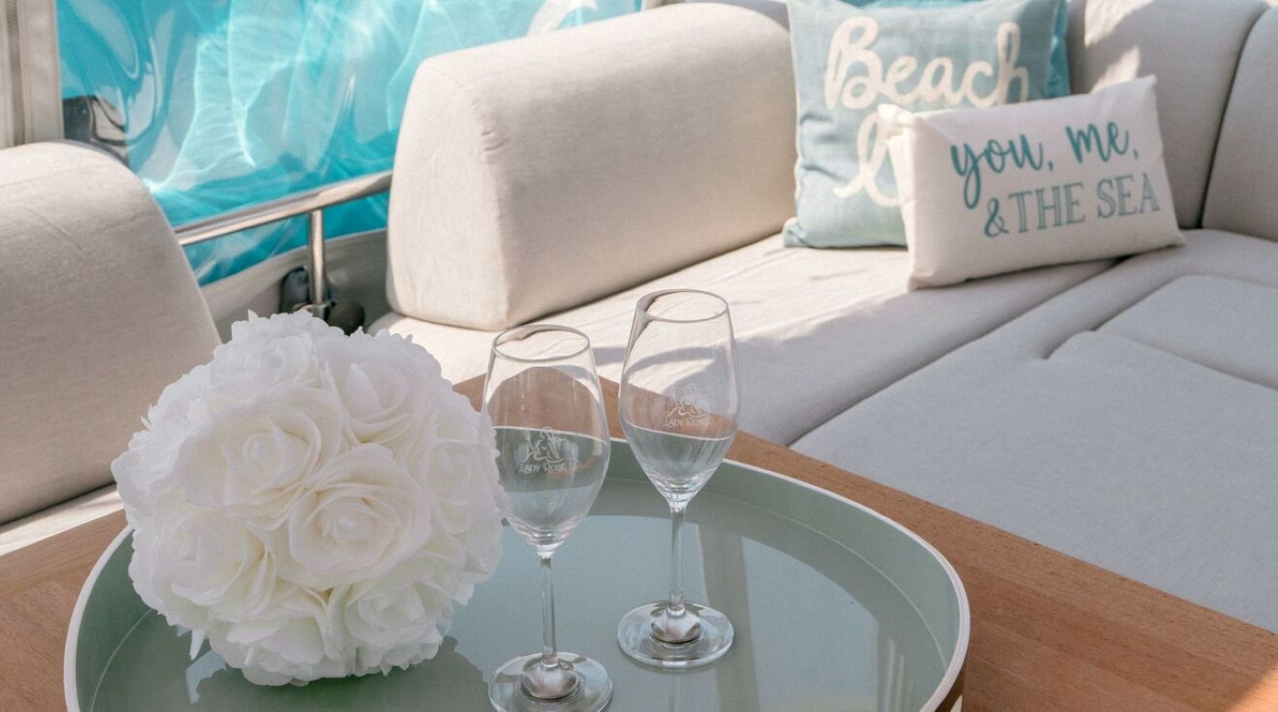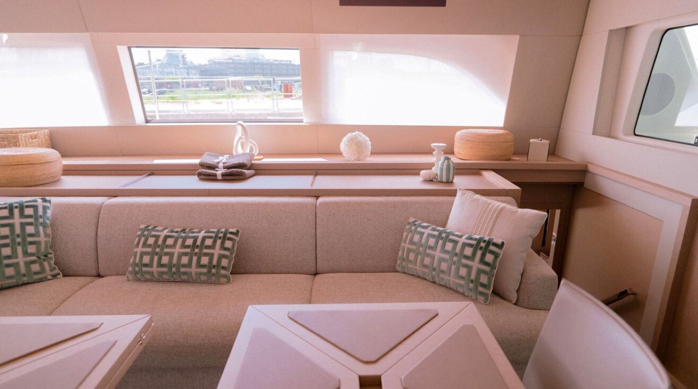 LADY ROSÉ’s interiors are bright and welcoming, with contemporary lines and a calm, neutral palette. The open-plan saloon is bathed in natural light from wraparound windows and offers both a relaxed lounge and a dining area. Quality materials and subtle textures evoke a refined yet understated elegance, making the interior an inviting space whether day or night.