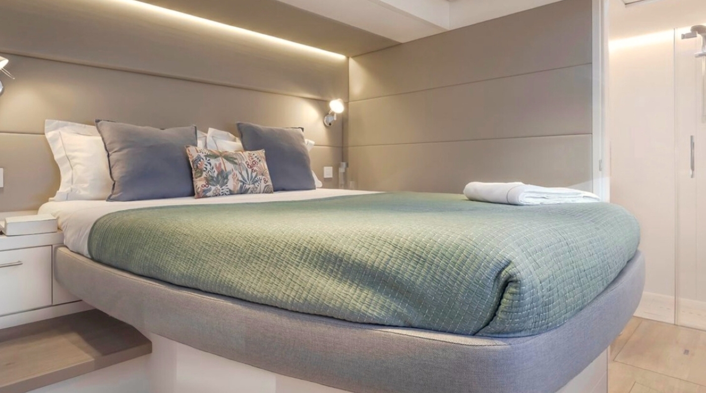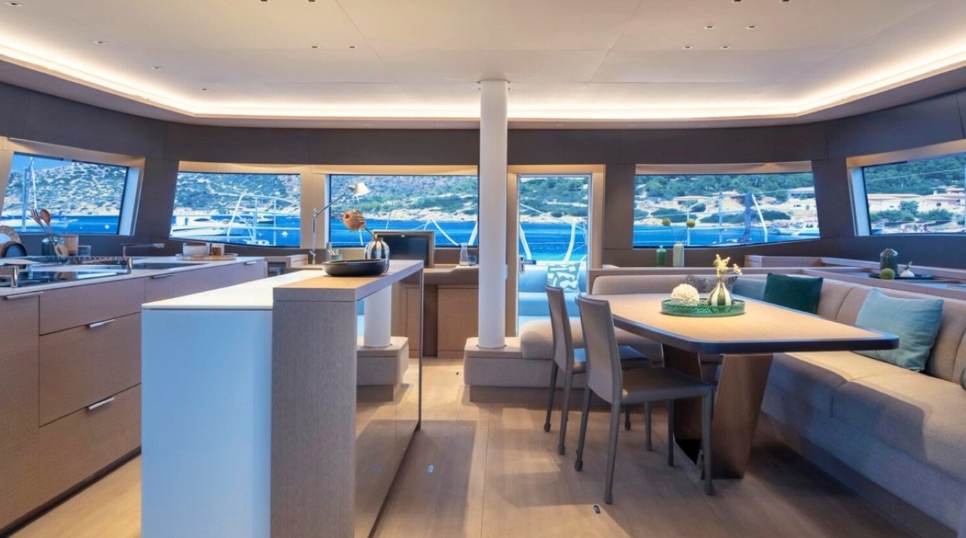 The galley is efficiently designed for both gourmet preparation and seamless service, enabling the crew to cater to every detail discreetly. The main saloon flows naturally out to the cockpit, blurring the line between inside and out—a hallmark of Lagoon’s thoughtful design.