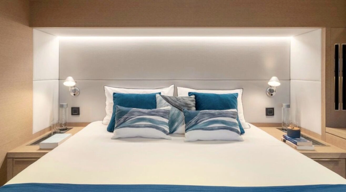 The guest accommodation aboard LADY ROSÉ is thoughtfully laid out for up to 8 guests: ~ Master suite – King-sized bed, ensuite bathroom, premium fittings, ample storage ~ 3 Guest cabins – Queen-sized beds, each with ensuite facilities and elegant finishes ~ Crew quarters – Separate accommodation for 3 crew, allowing for discreet service