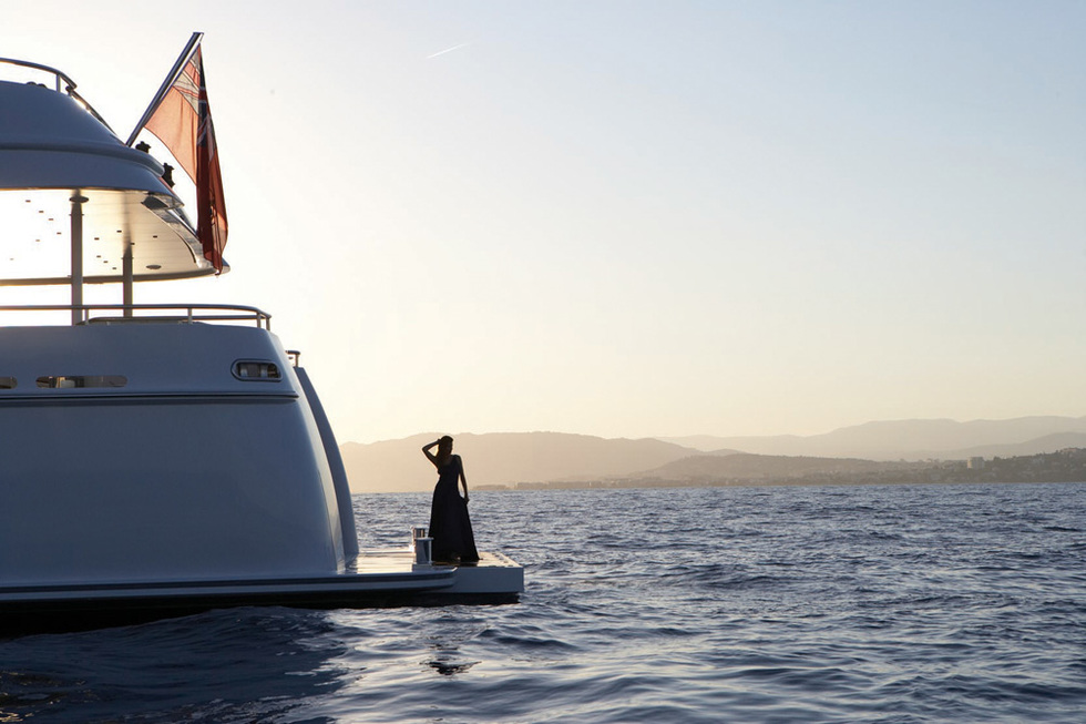 The main deck aft is furnished with an informal alfresco lounge ideal for morning coffee or relaxing with a good book. Stairs connect down to the swim platform for easy access to the water and the tenders.