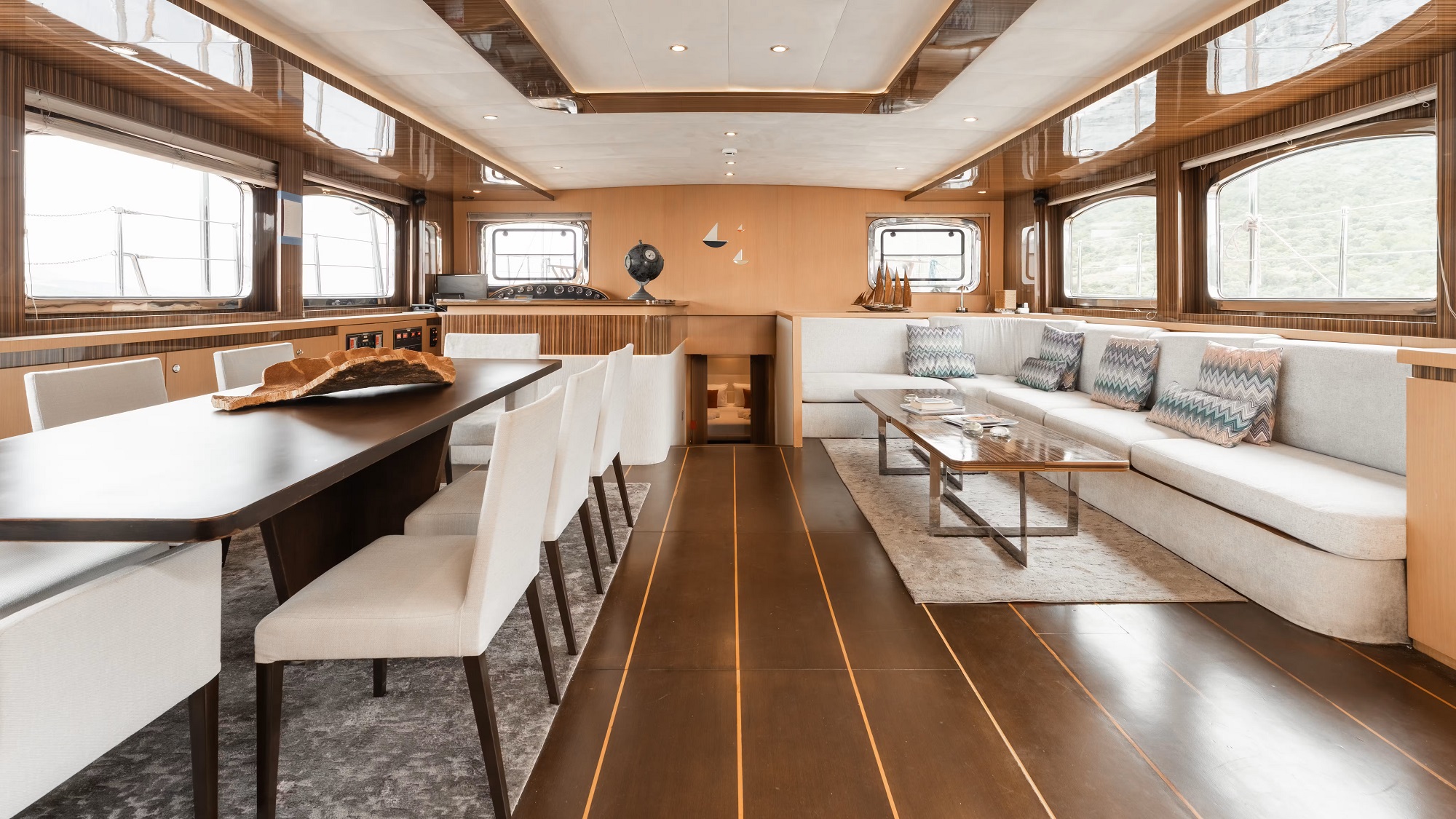 The sailing yacht LE PIETRE features a modern chic interior of pale oak panels, dark wood floors and earthy toned soft furnishings, creating a welcoming elegant ambience. The salon and dining are an open plan in the raised deckhouse. On the starboard side is a comfortable lounge with sofa, coffee table and entertainment system. To port are the formal dining area and wet bar, ideal for socializing. Wrap around panoramic windows infuses the space with ample natural light and optimum views.