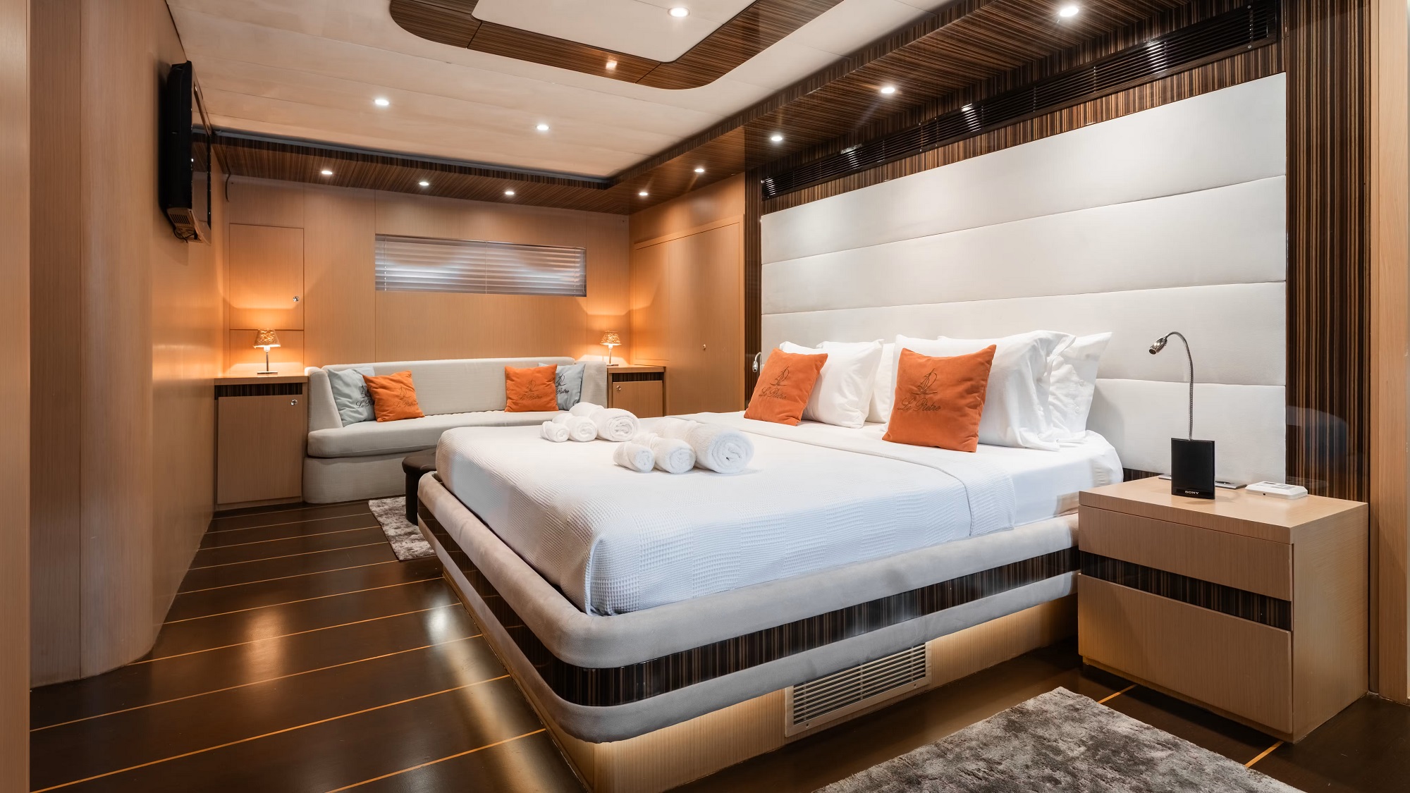 The LE PIETRE sailing yacht has 4 en-suite cabins, for up to 8 charter guests. Each cabin boasts full air conditioning, ample storage, TV entertainment, marble-clad en-suite facilities and a contemporary serene décor. The master stateroom is aft and full beam of the yacht, with a king size centre-lined bed, sofa and vanity. The VIP cabin is forward and full beam of the yacht, with a centre-lined queen size bed and vanity. A further guest cabin has a double bed, while the 4th cabin offers side by side, twin beds. The twin cabin can convert into a double.