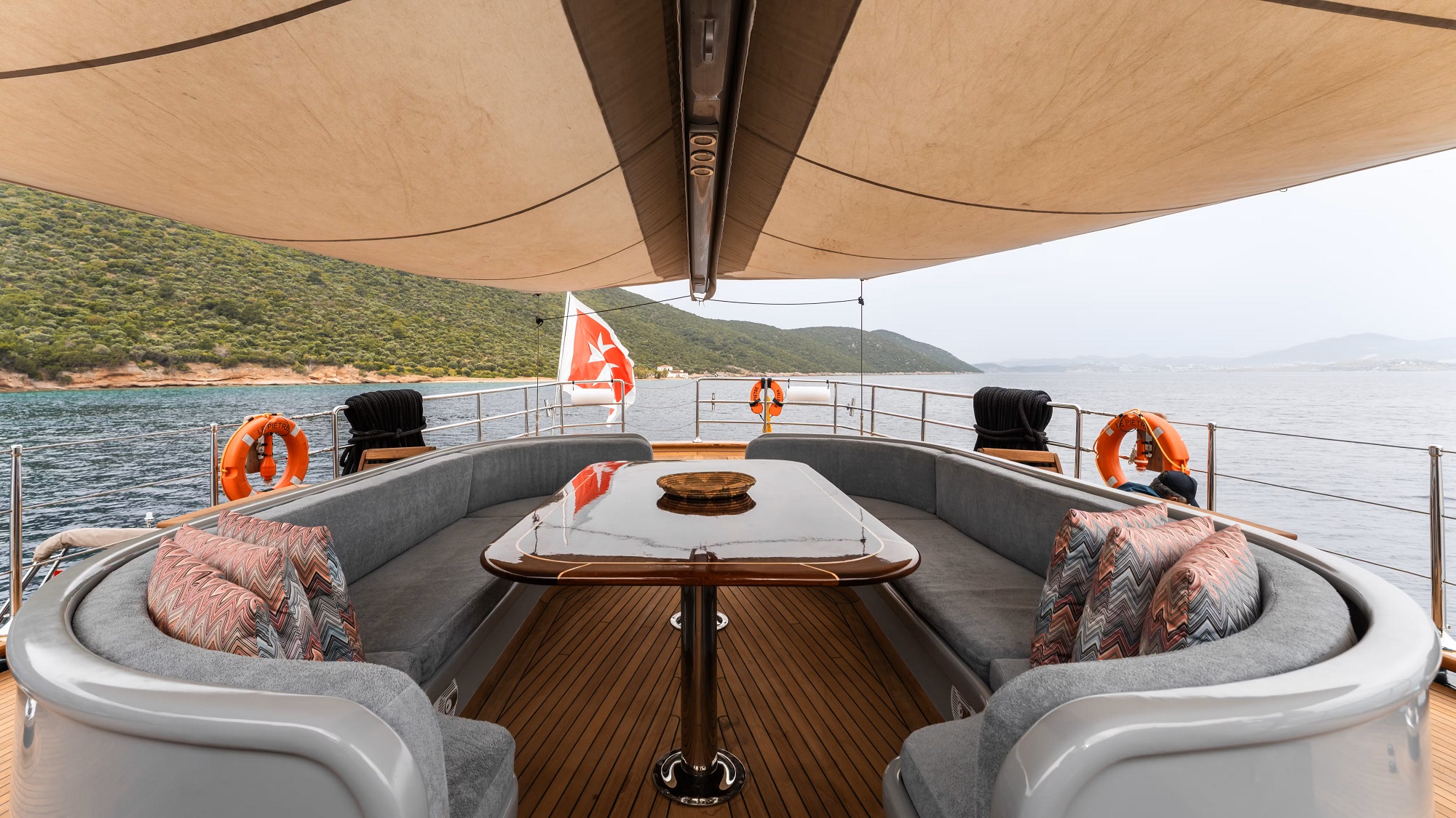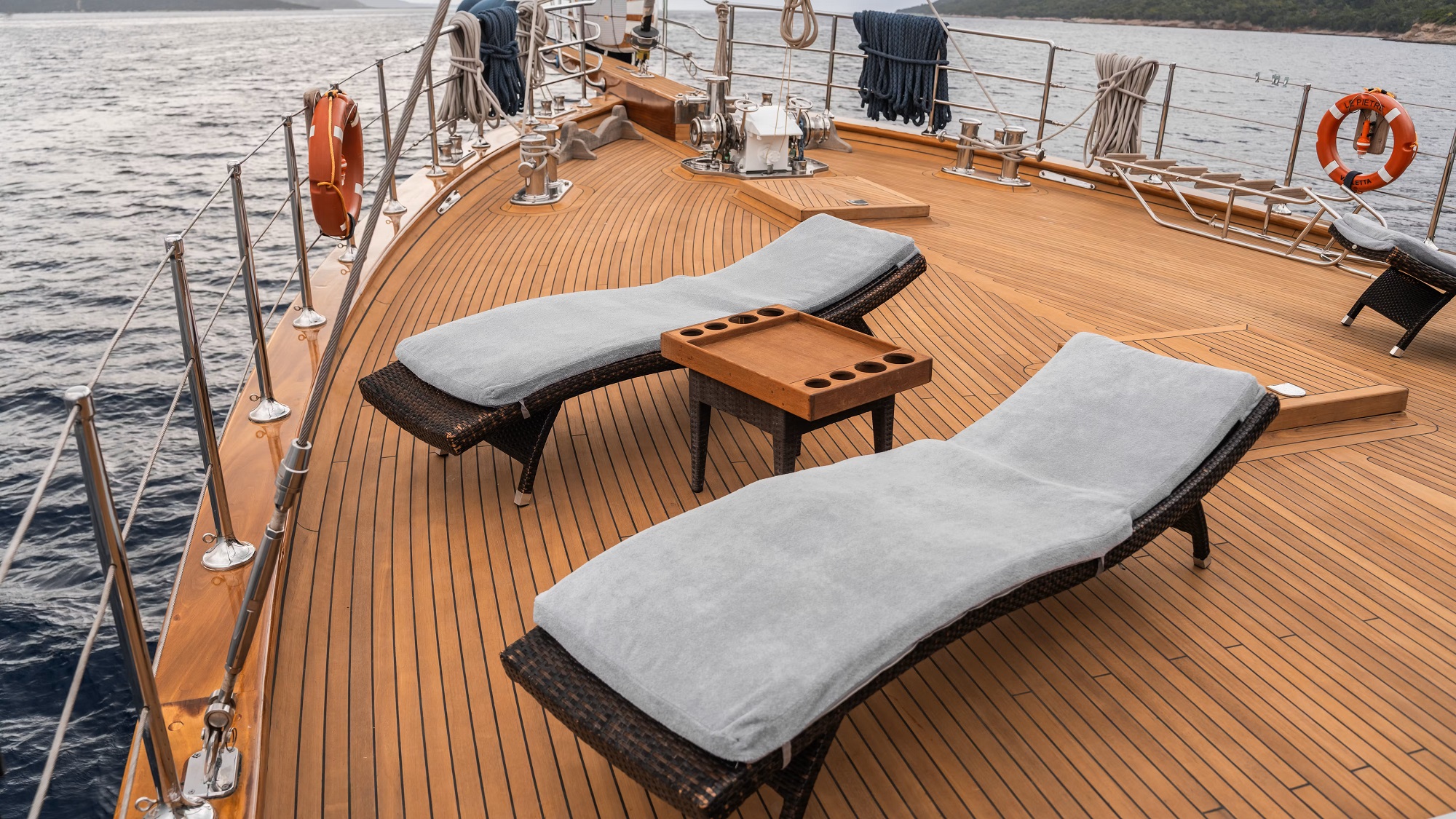 Exterior deck space is plentiful aboard LE PIETRE. The aft deck boasts shade, a large seating area and alfresco dining option. With a beam of 8m (26.2ft), LE PIETRE offers wide side decks, leading to her ample foredeck, complete with built-in seating and adjustable table, plus an abundance of teak decks to relax upon.
