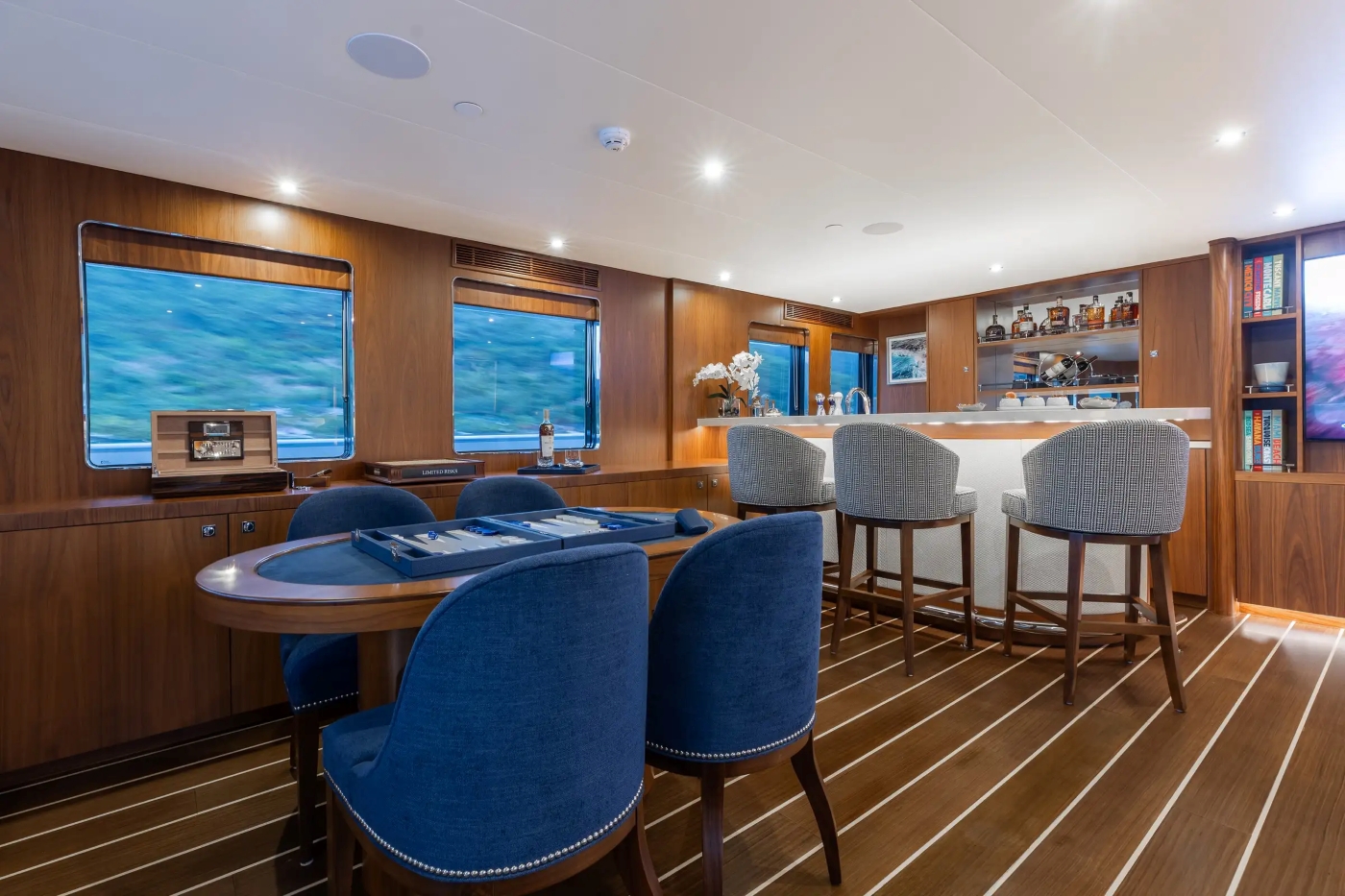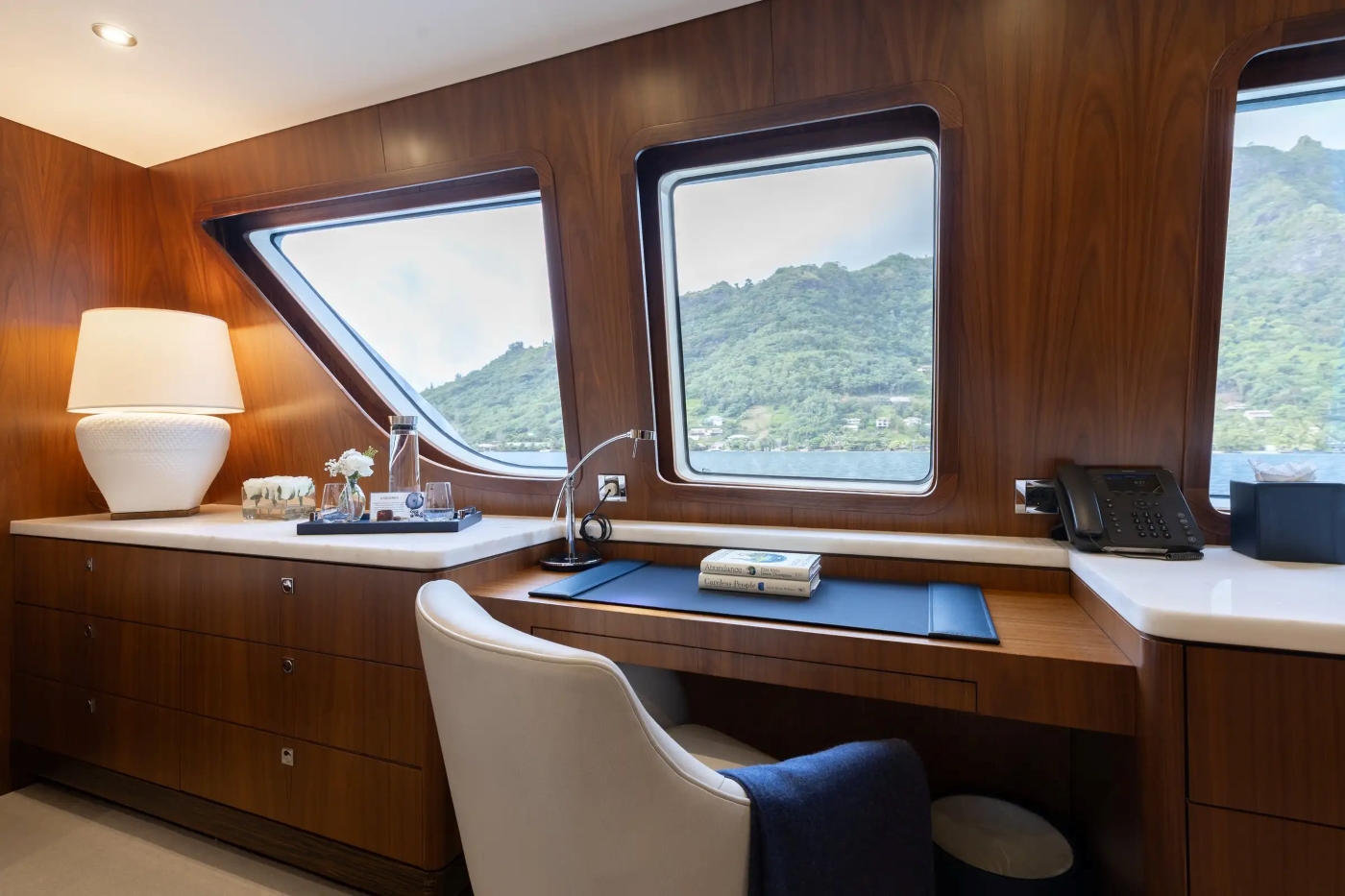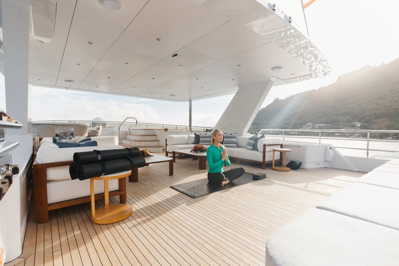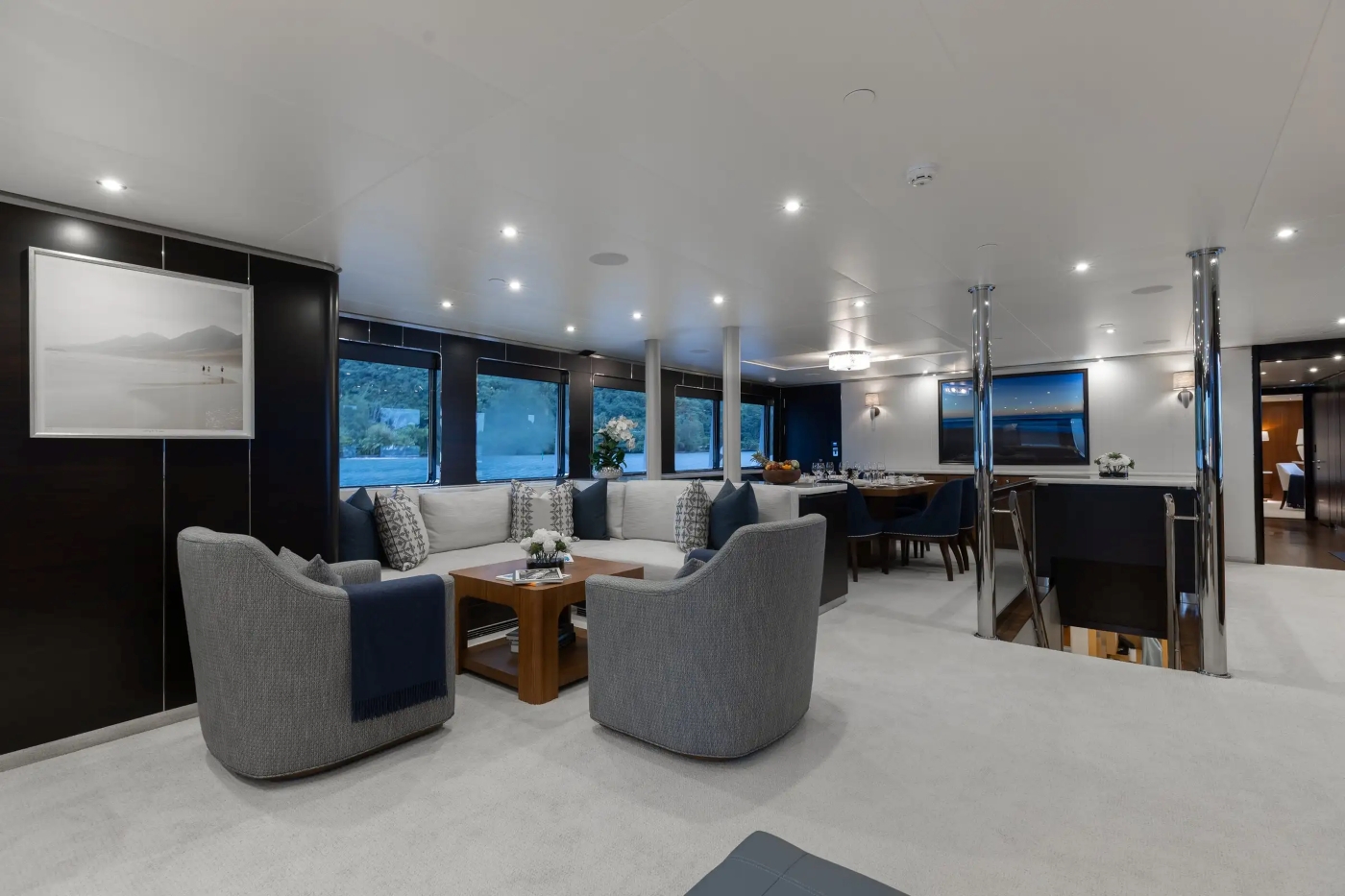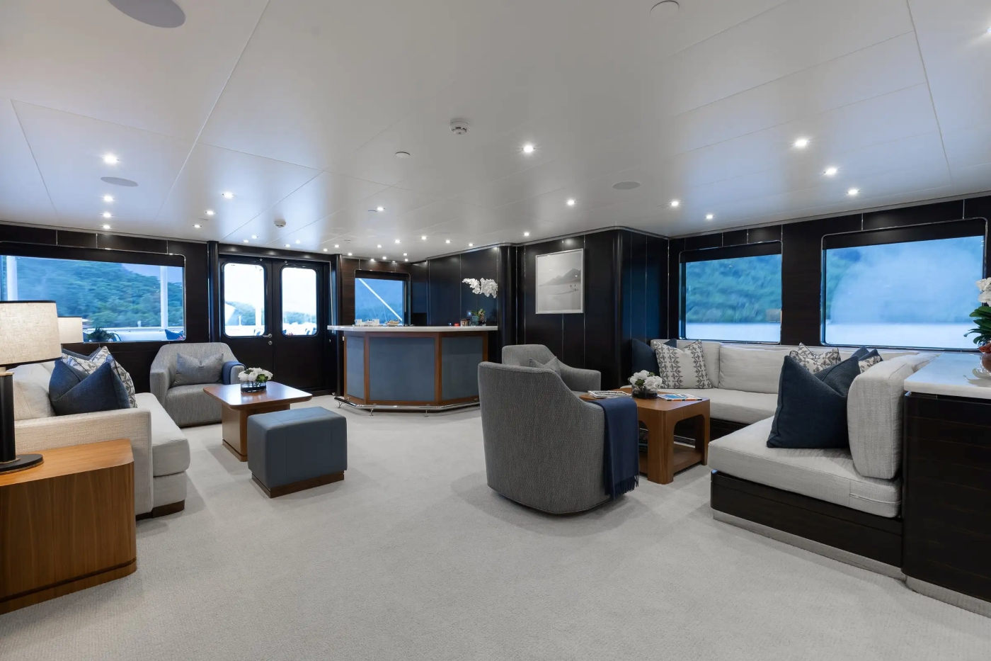Upstairs, the sky lounge offers a more relaxed atmosphere, with a bar, intimate seating areas, and spectacular ocean views. The yacht’s style is cohesive and understated, using tactile materials and a neutral palette that accentuates the vibrant blues beyond the windows.