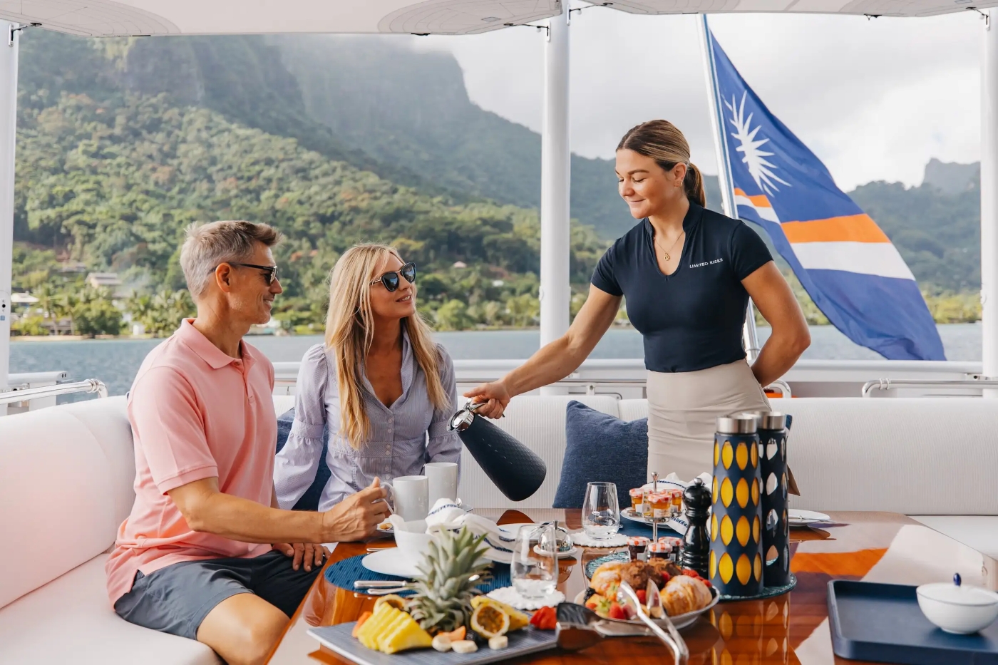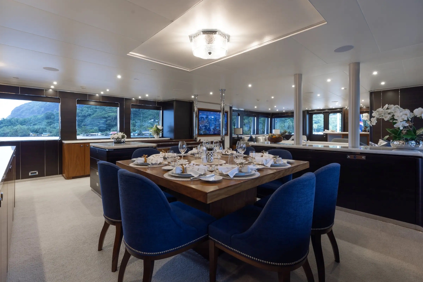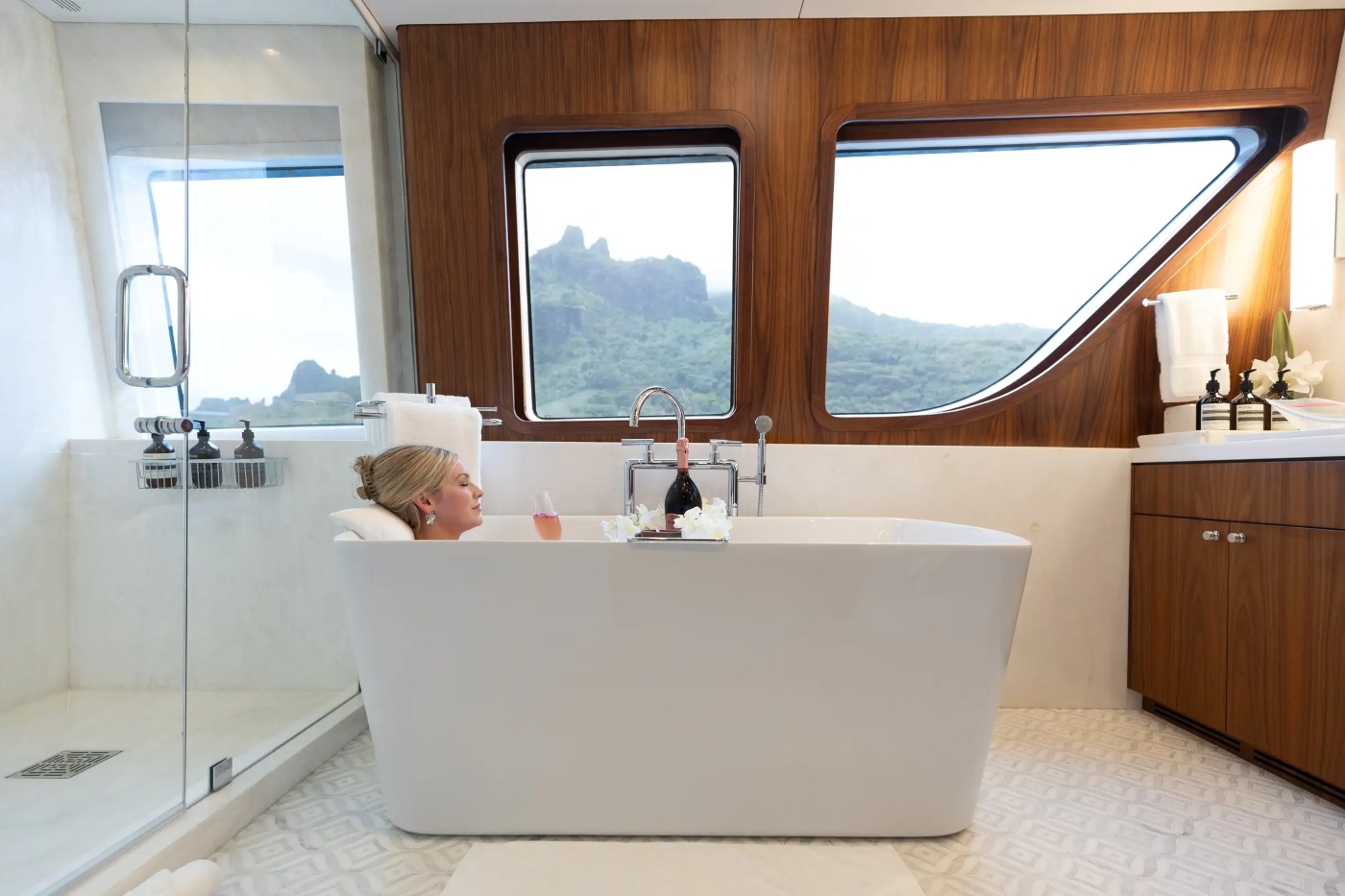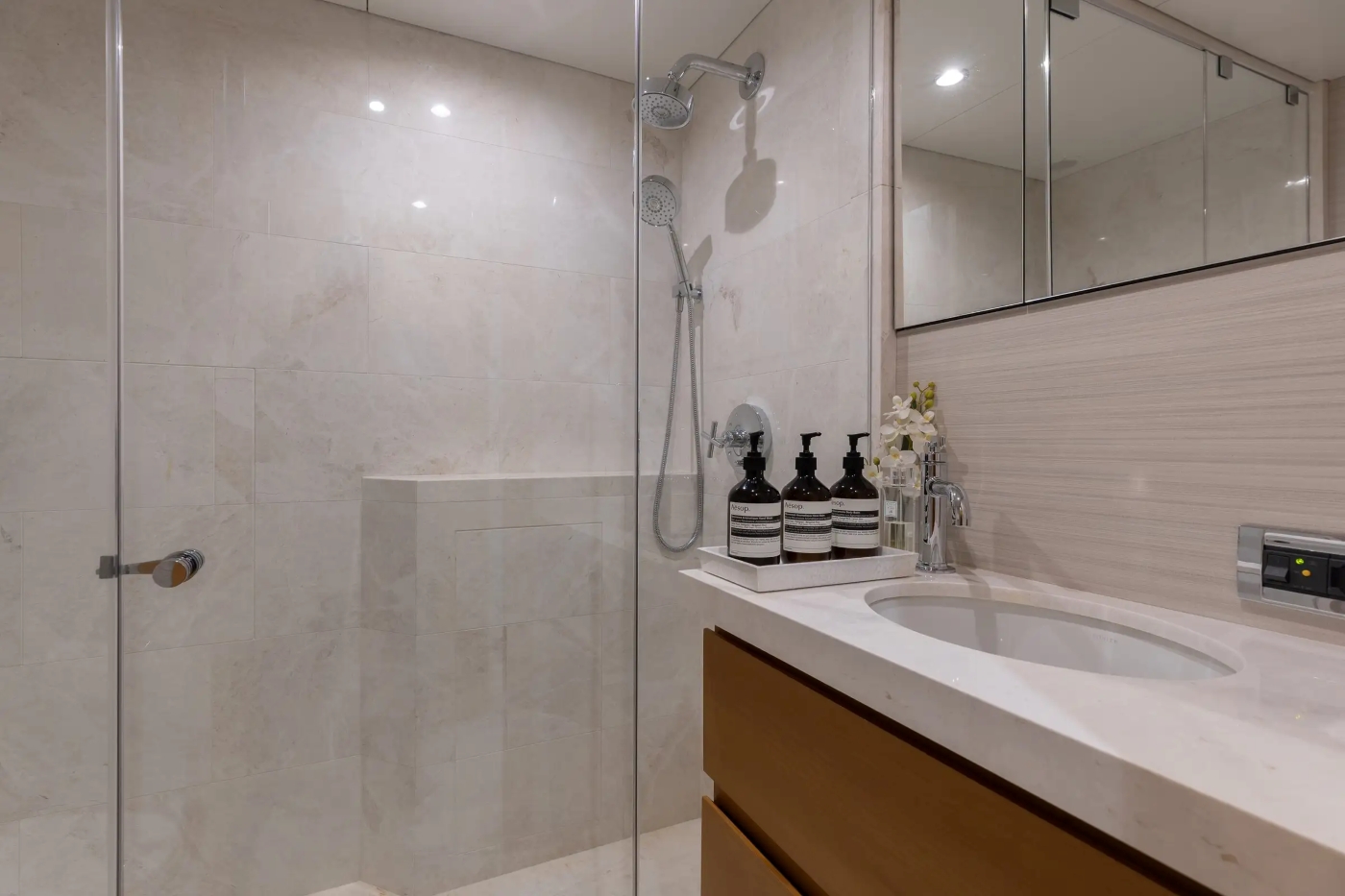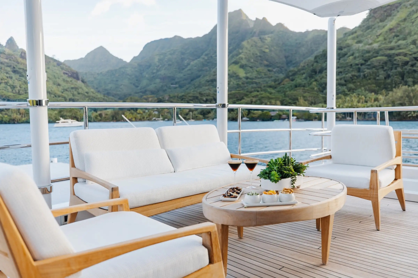Upstairs, the sky lounge offers a more relaxed atmosphere, with a bar, intimate seating areas, and spectacular ocean views. The yacht’s style is cohesive and understated, using tactile materials and a neutral palette that accentuates the vibrant blues beyond the windows.