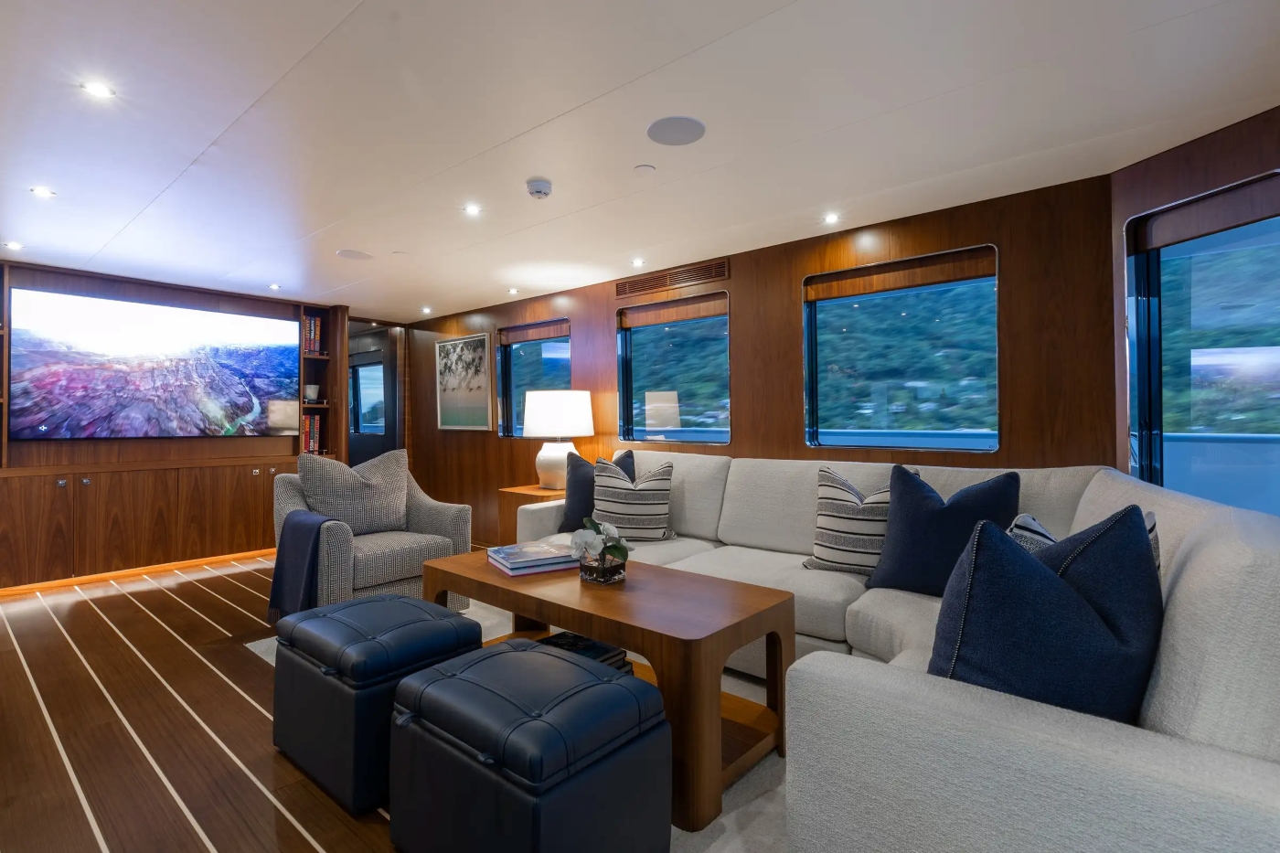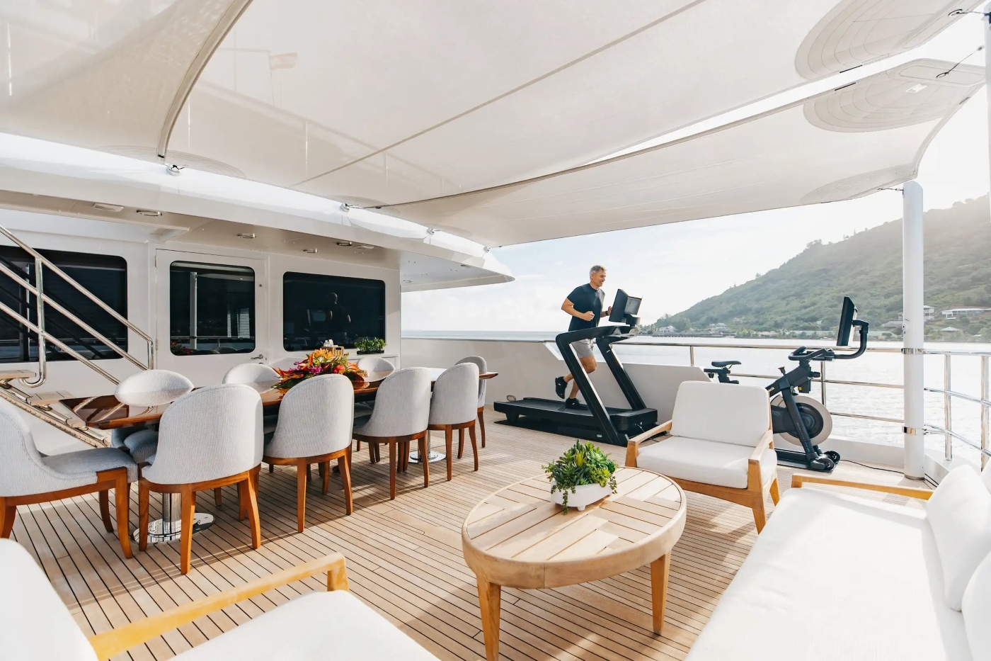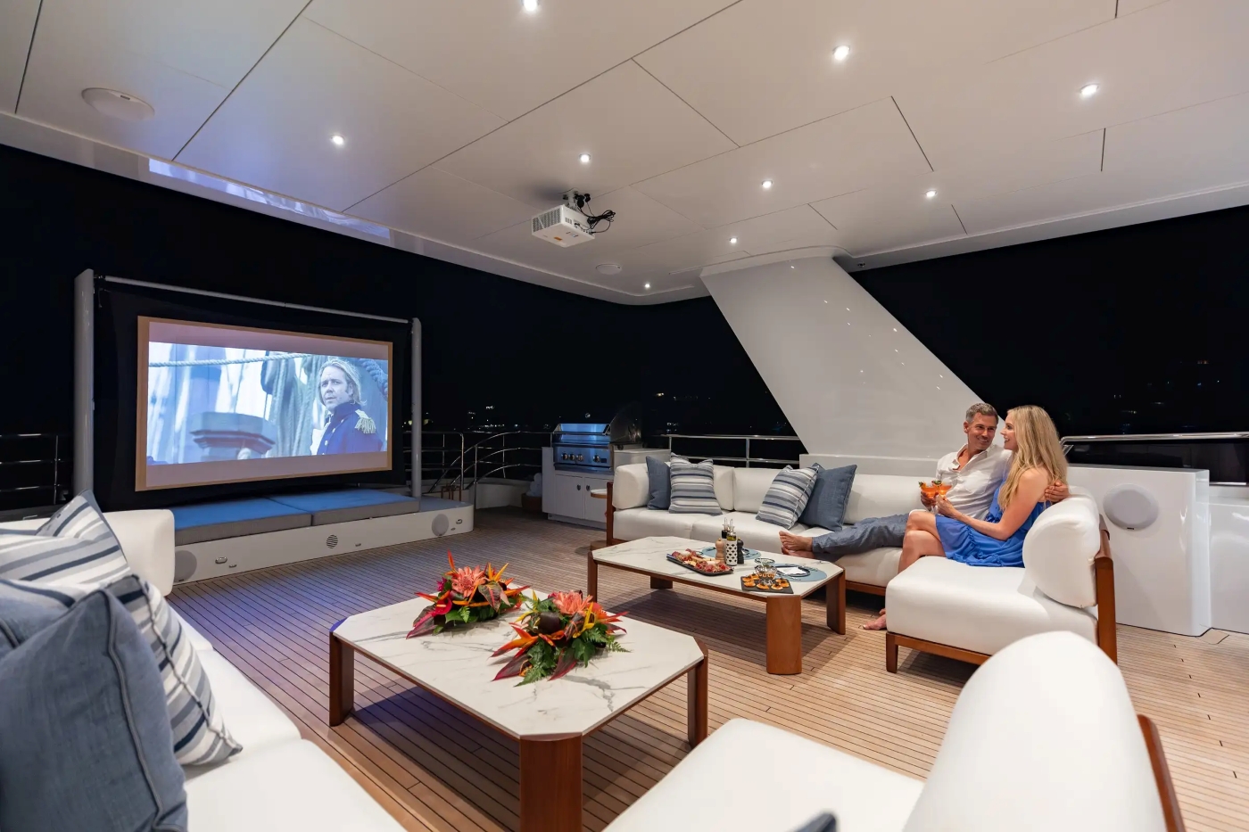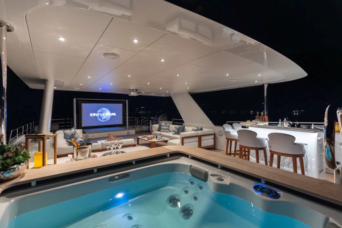 The exterior decks of LIMITED RISKS are beautifully arranged for open-air living. On the sun deck, guests will find a raised Jacuzzi flanked by a sit-up bar, sun pads, and a relaxed outdoor cinema space – ideal for entertaining day or night. Aft, the deck is equipped with a BBQ and shaded gym area, while forward-facing seating allows for scenic views while cruising.