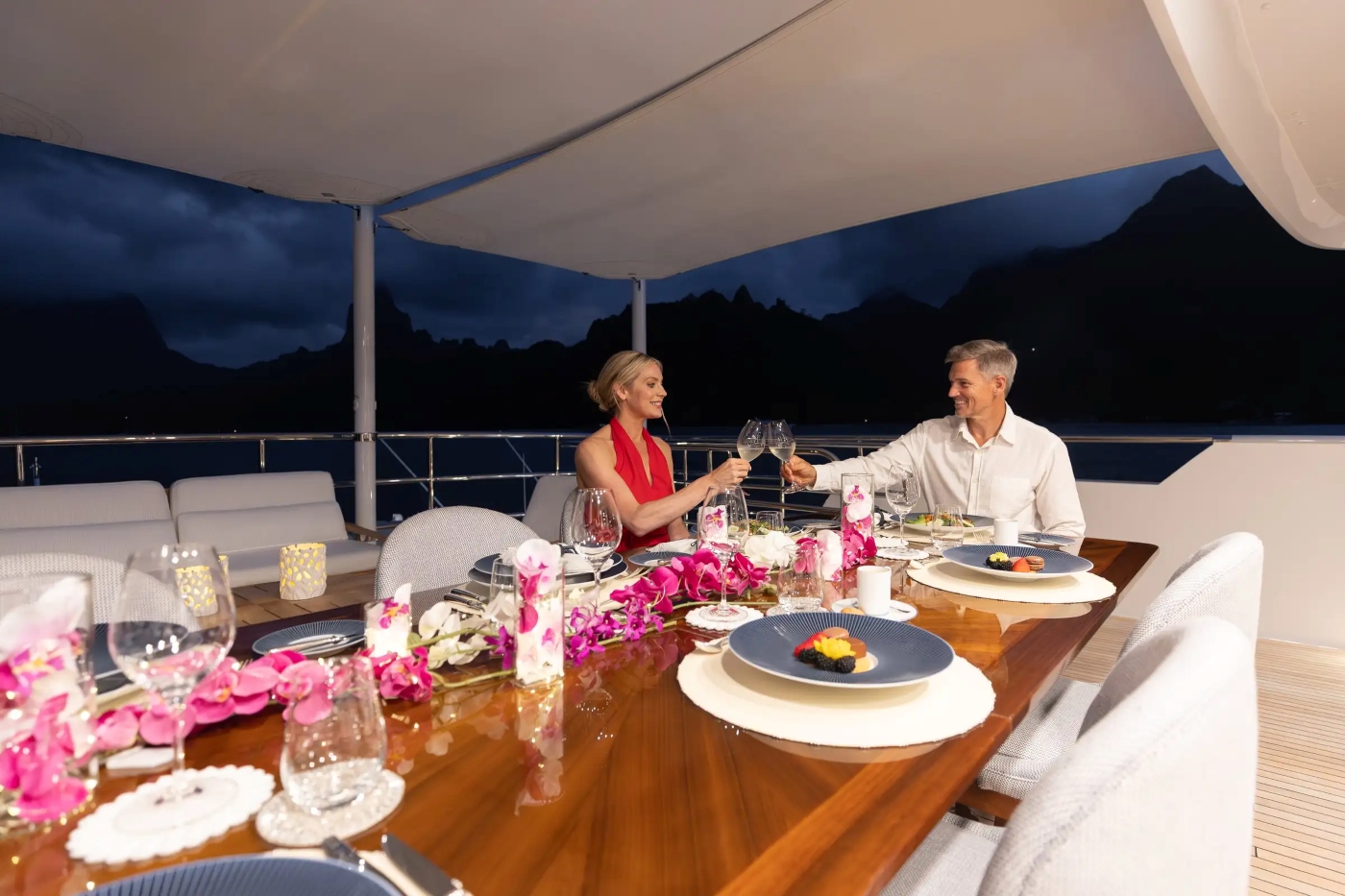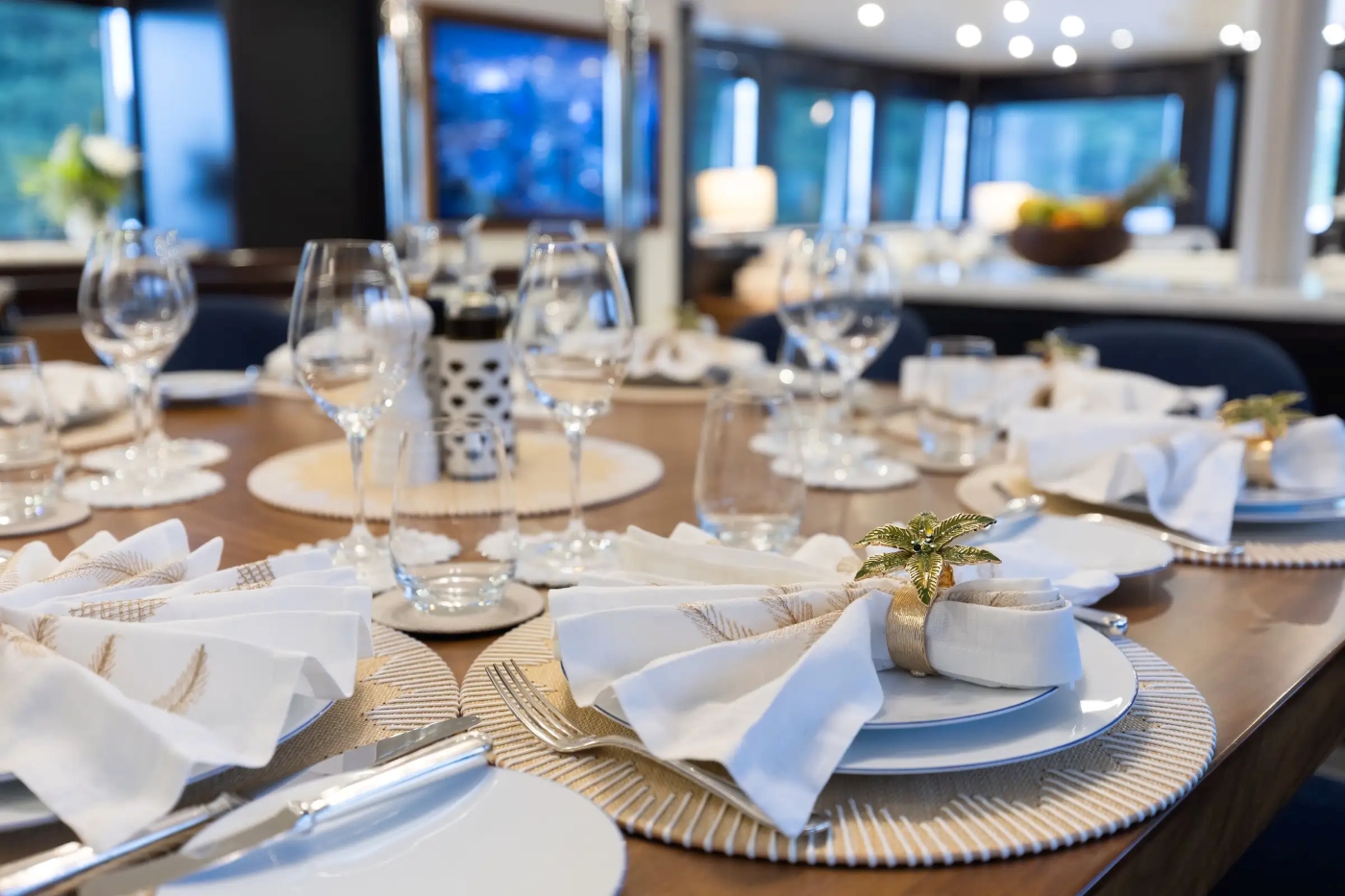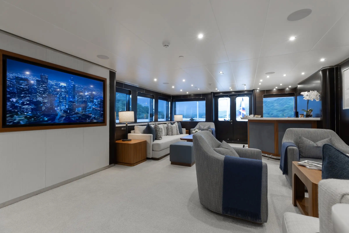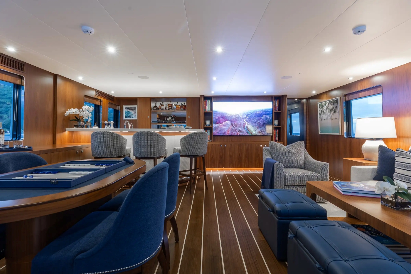The exterior decks of LIMITED RISKS are beautifully arranged for open-air living. On the sun deck, guests will find a raised Jacuzzi flanked by a sit-up bar, sun pads, and a relaxed outdoor cinema space – ideal for entertaining day or night. Aft, the deck is equipped with a BBQ and shaded gym area, while forward-facing seating allows for scenic views while cruising.
