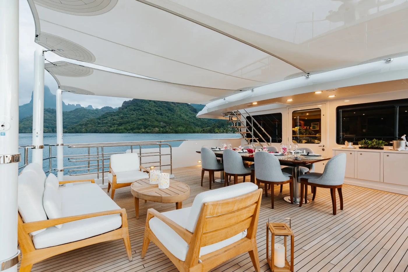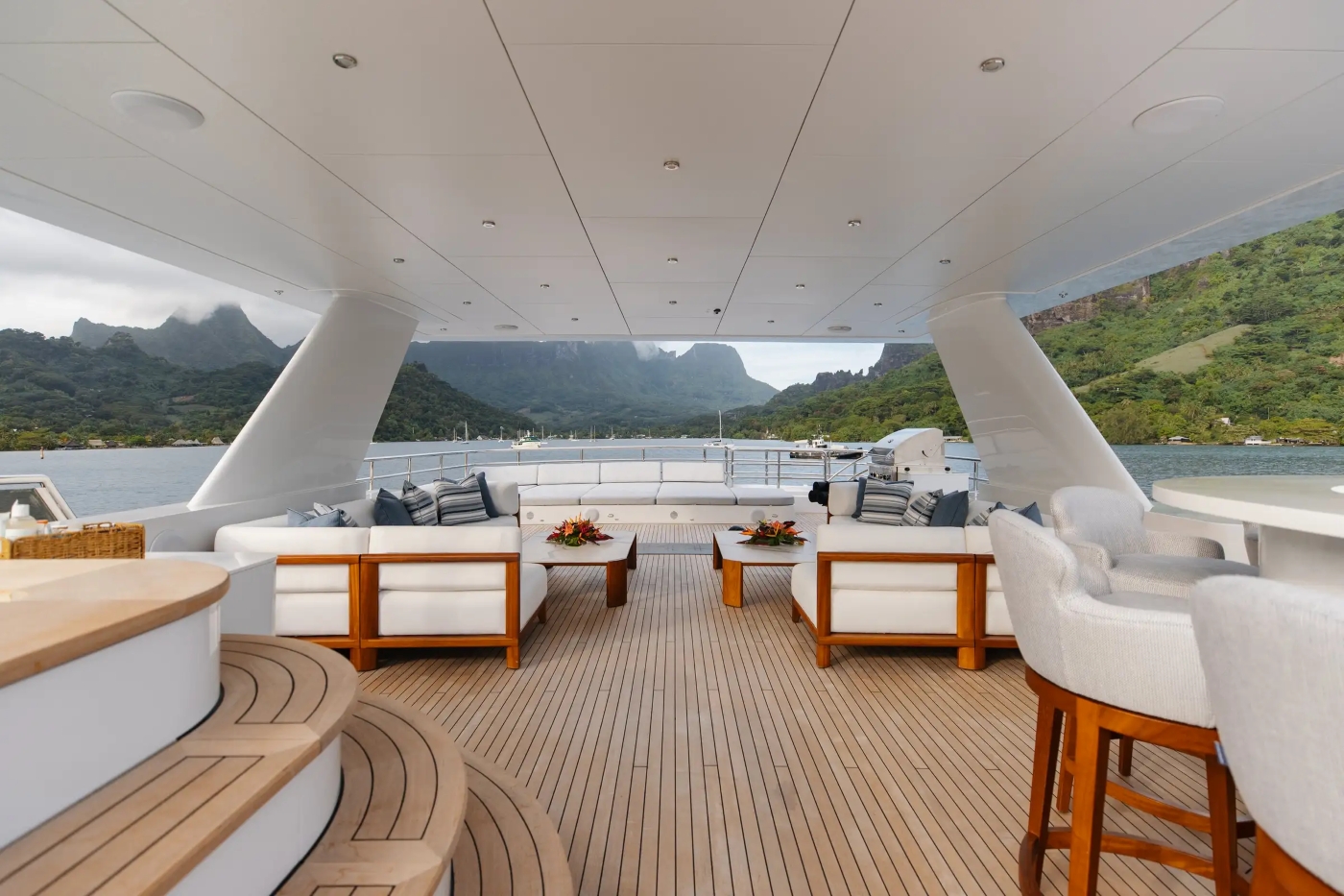 On the bridge deck, a refined dining table is set beneath a large canopy, surrounded by elegant lounge seating that flows from the interior sky lounge. The main deck aft offers a more casual setting with sofas and a coffee table arrangement, perfect for enjoying refreshments after a swim. Below, the expansive swim platform and beach club setup provide effortless access to the water and the yacht’s fleet of toys.