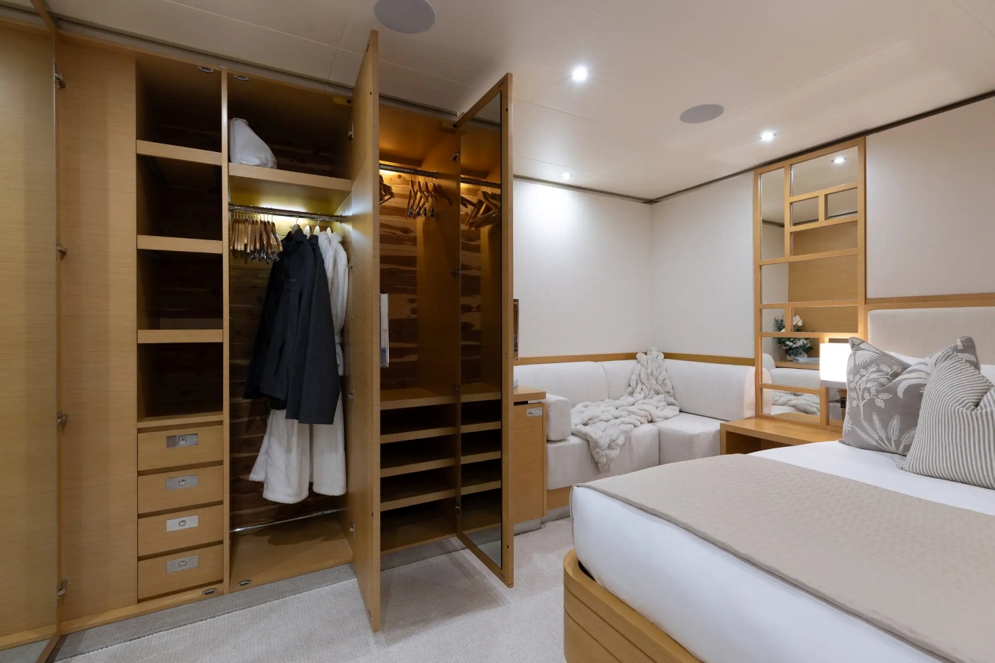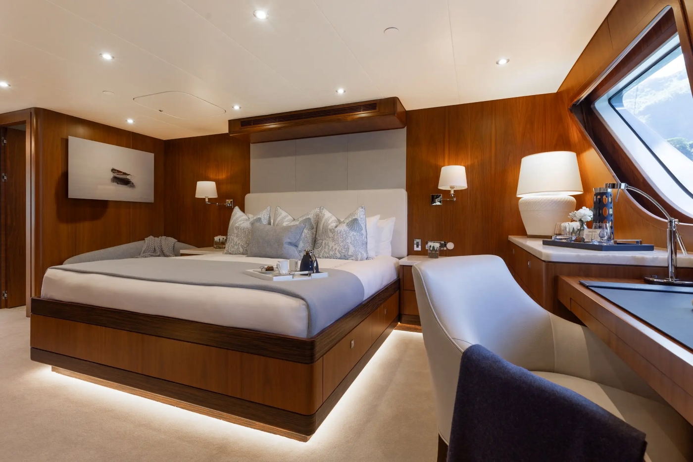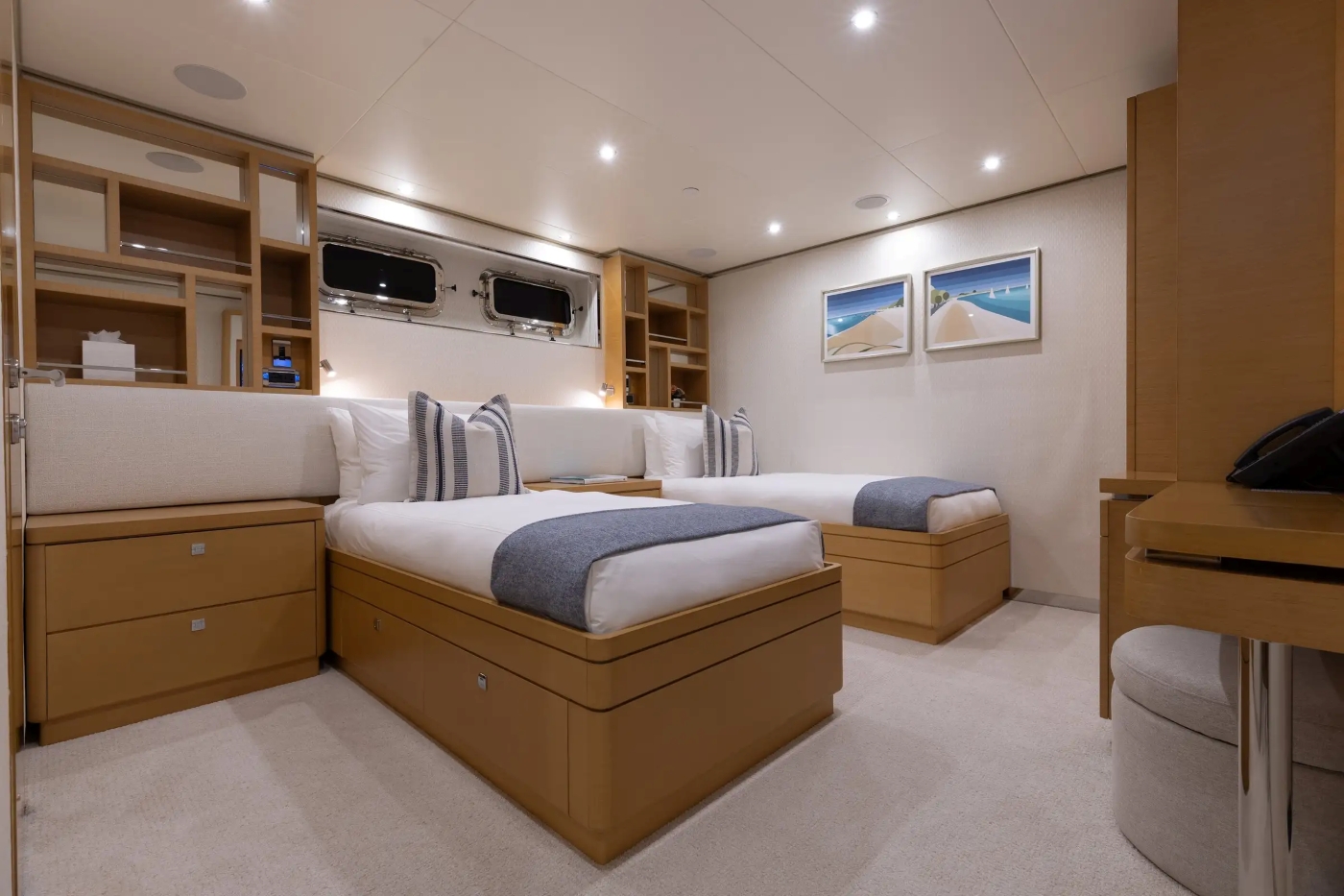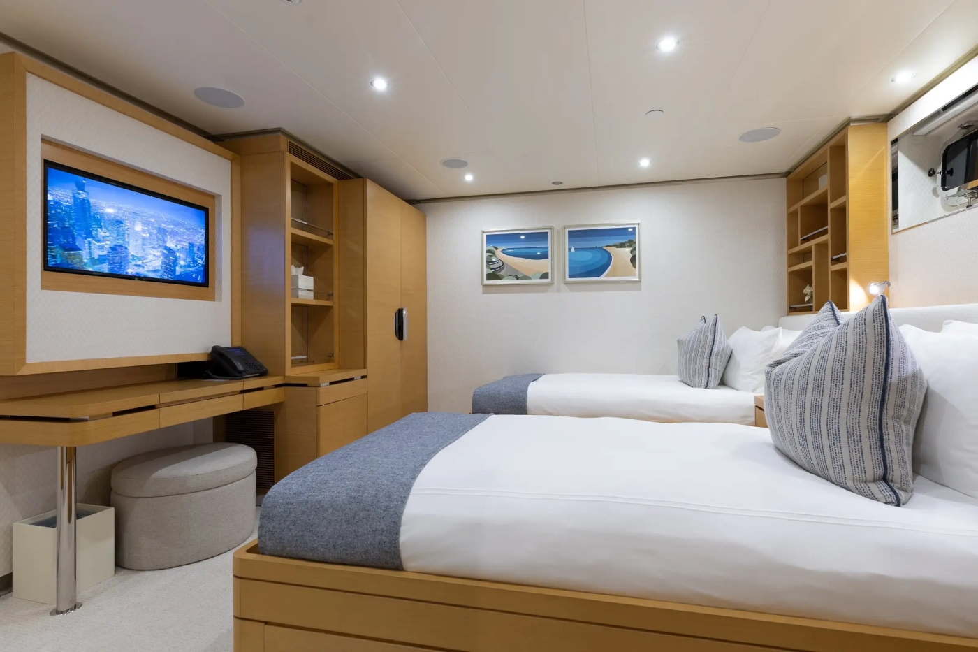 The guest accommodation on LIMITED RISKS includes: ~ Master cabin on main deck: King-sized bed, private office area, walk-in wardrobe, and full-beam en suite with bath and shower ~ 2 Double cabins on lower deck: Each with double bed, wardrobe, and en suite bathroom with shower ~ 2 Convertible cabins on lower deck: Configurable as twin or double beds, each with en suite bathroom ~ 1 Pullman berth available in a double cabin with additional single bed