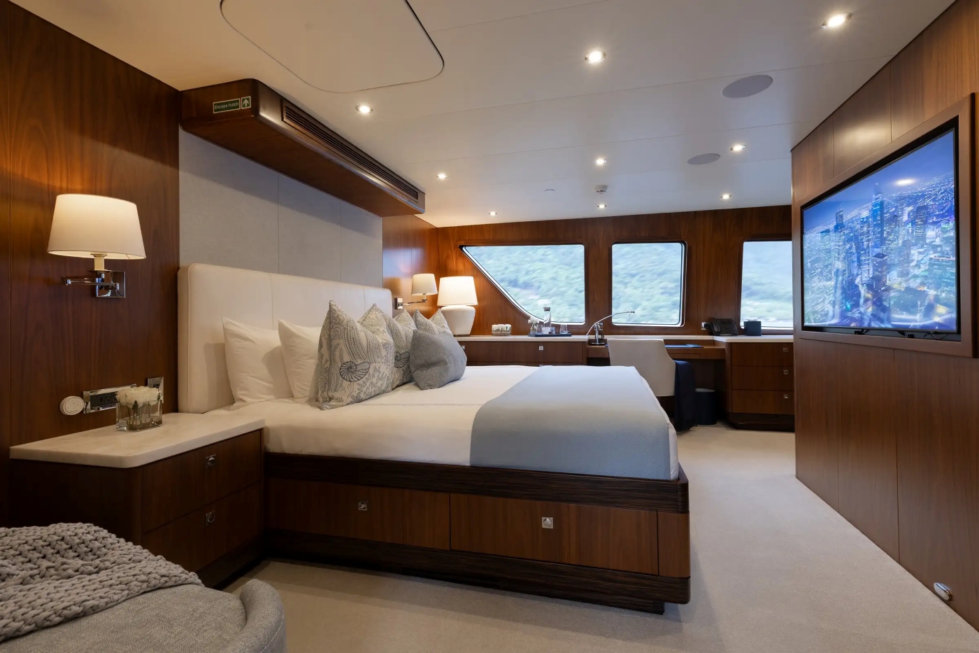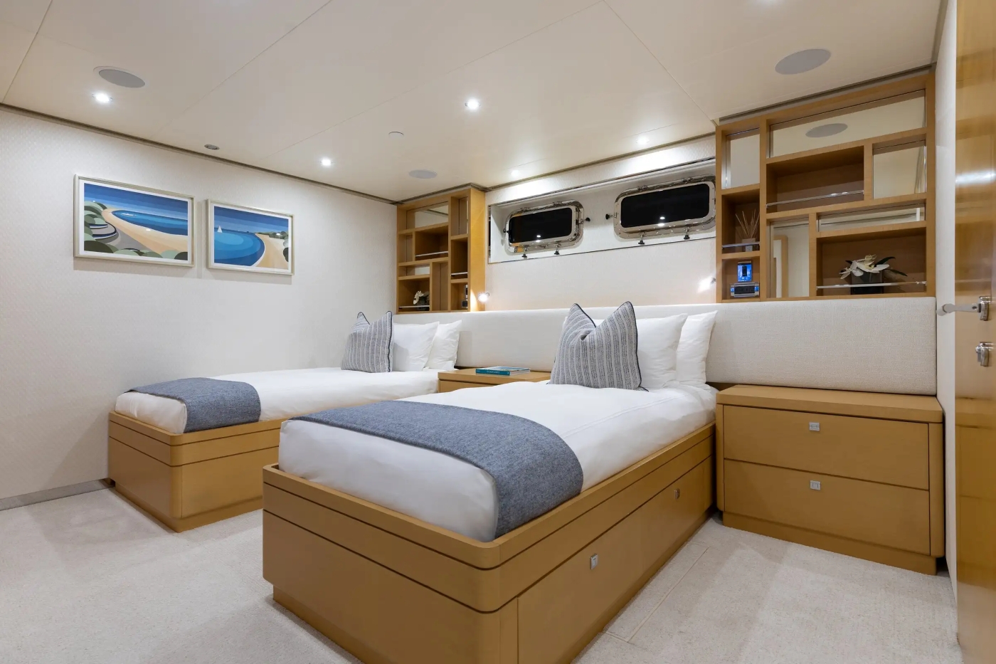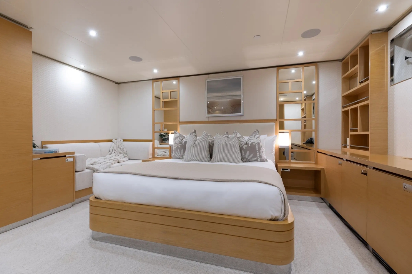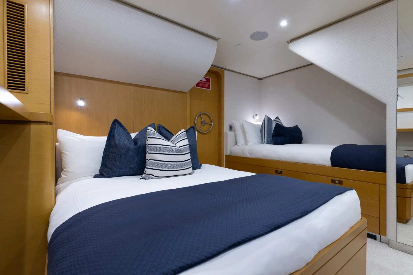 The guest accommodation on LIMITED RISKS includes: ~ Master cabin on main deck: King-sized bed, private office area, walk-in wardrobe, and full-beam en suite with bath and shower ~ 2 Double cabins on lower deck: Each with double bed, wardrobe, and en suite bathroom with shower ~ 2 Convertible cabins on lower deck: Configurable as twin or double beds, each with en suite bathroom ~ 1 Pullman berth available in a double cabin with additional single bed