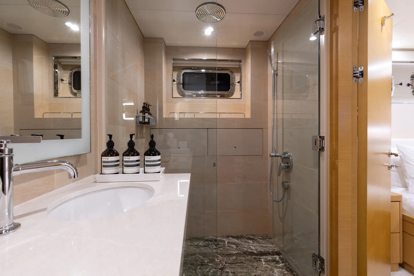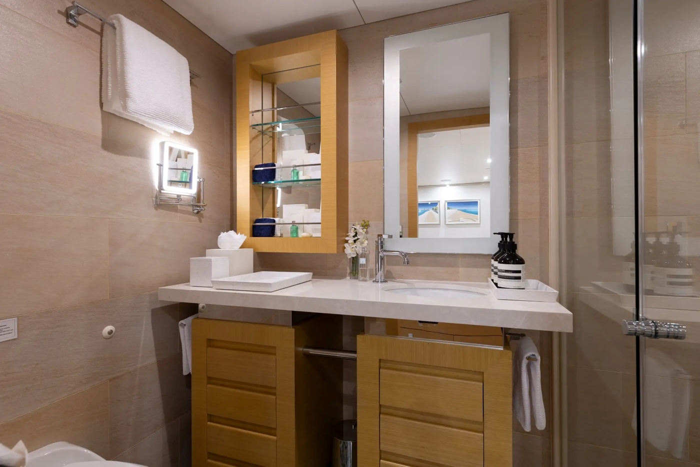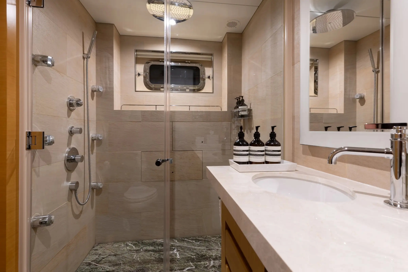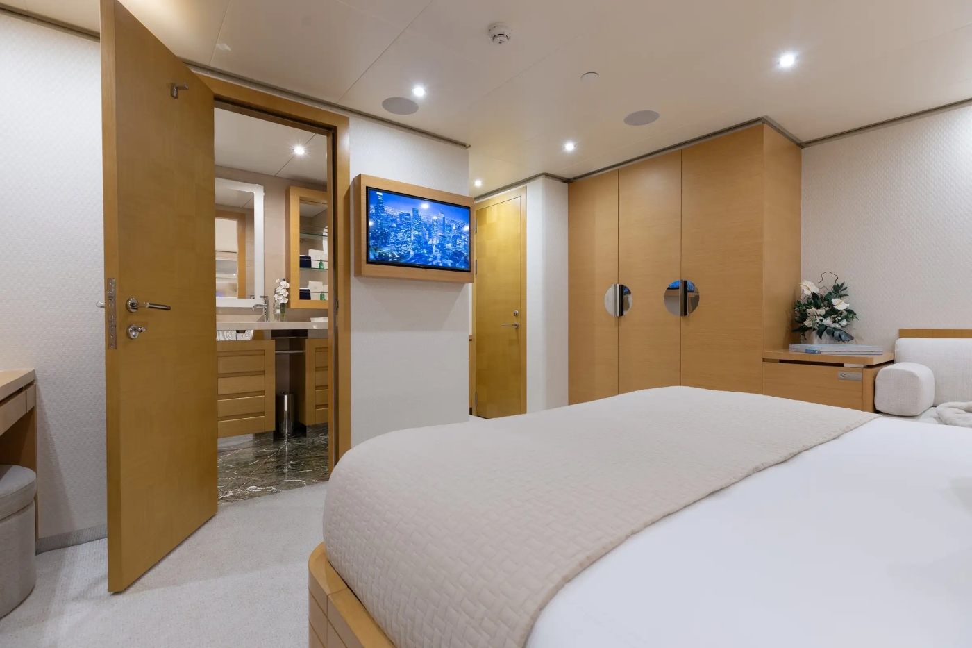 The guest accommodation on LIMITED RISKS includes: ~ Master cabin on main deck: King-sized bed, private office area, walk-in wardrobe, and full-beam en suite with bath and shower ~ 2 Double cabins on lower deck: Each with double bed, wardrobe, and en suite bathroom with shower ~ 2 Convertible cabins on lower deck: Configurable as twin or double beds, each with en suite bathroom ~ 1 Pullman berth available in a double cabin with additional single bed