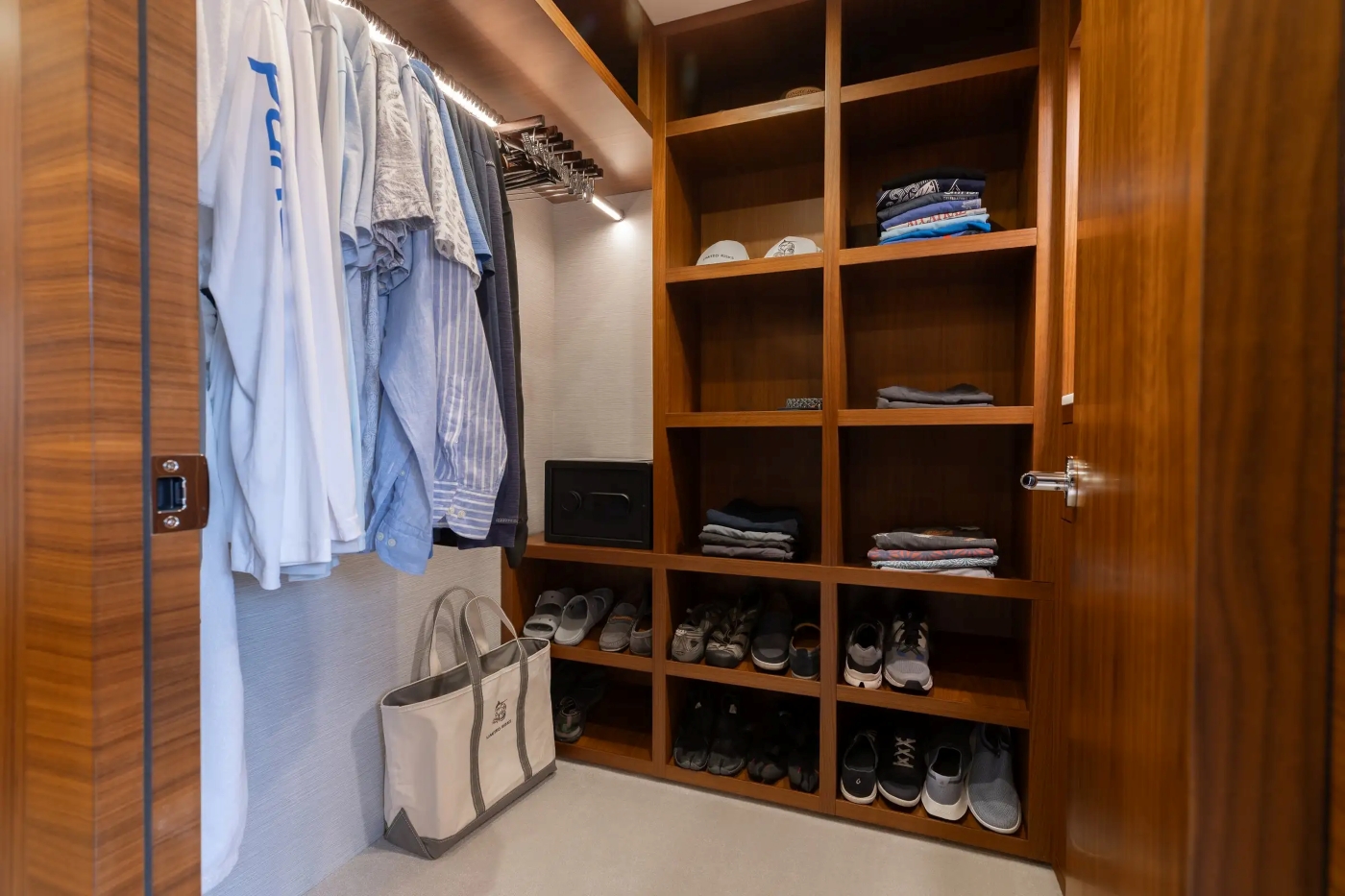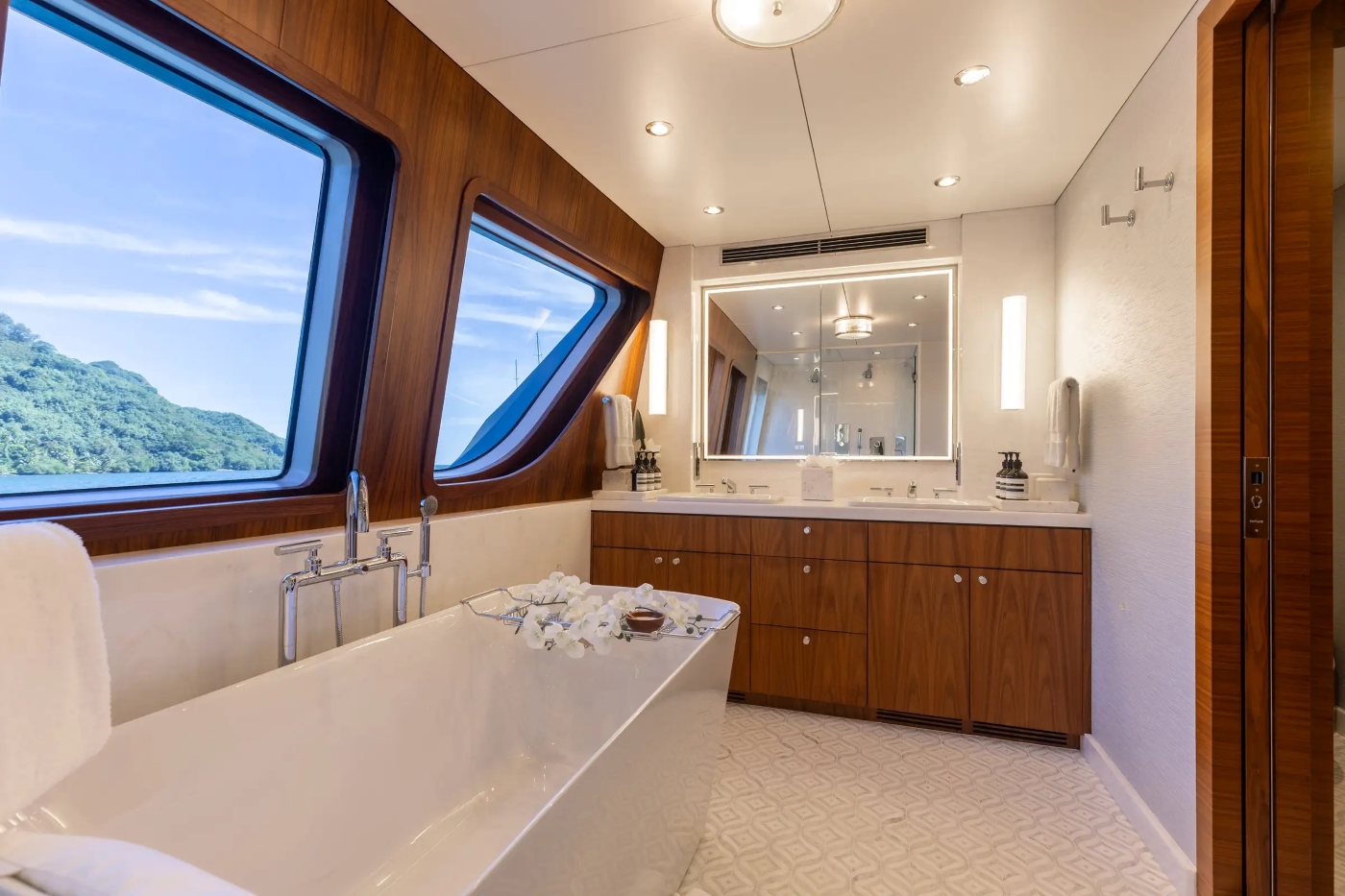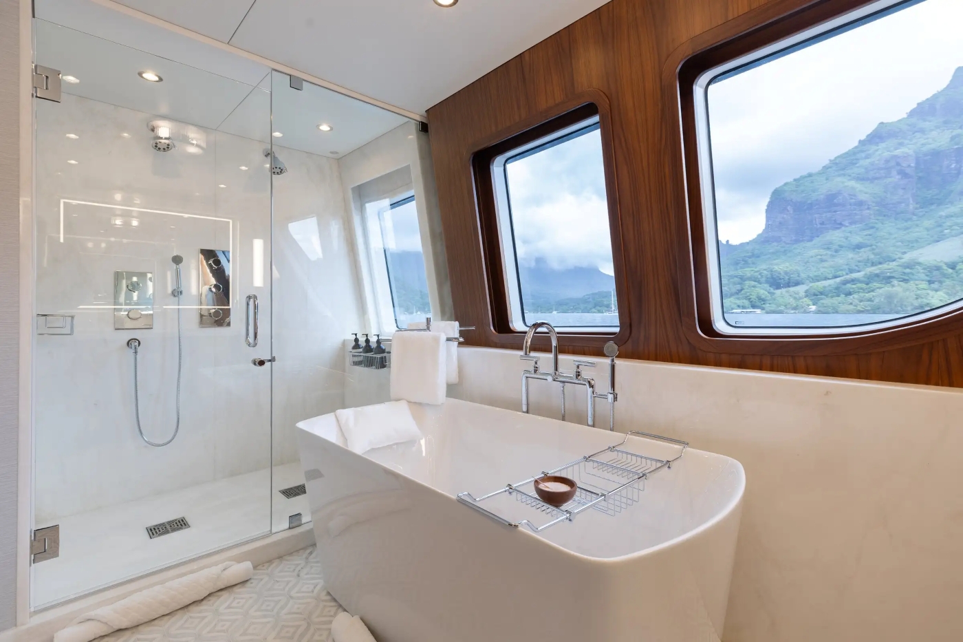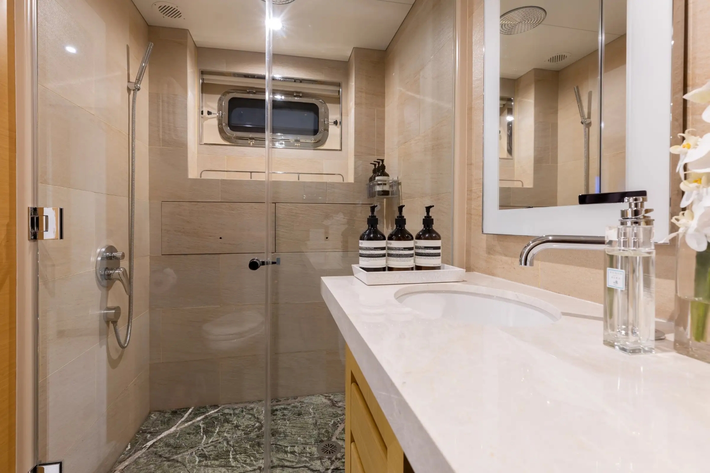 The guest accommodation on LIMITED RISKS includes: ~ Master cabin on main deck: King-sized bed, private office area, walk-in wardrobe, and full-beam en suite with bath and shower ~ 2 Double cabins on lower deck: Each with double bed, wardrobe, and en suite bathroom with shower ~ 2 Convertible cabins on lower deck: Configurable as twin or double beds, each with en suite bathroom ~ 1 Pullman berth available in a double cabin with additional single bed