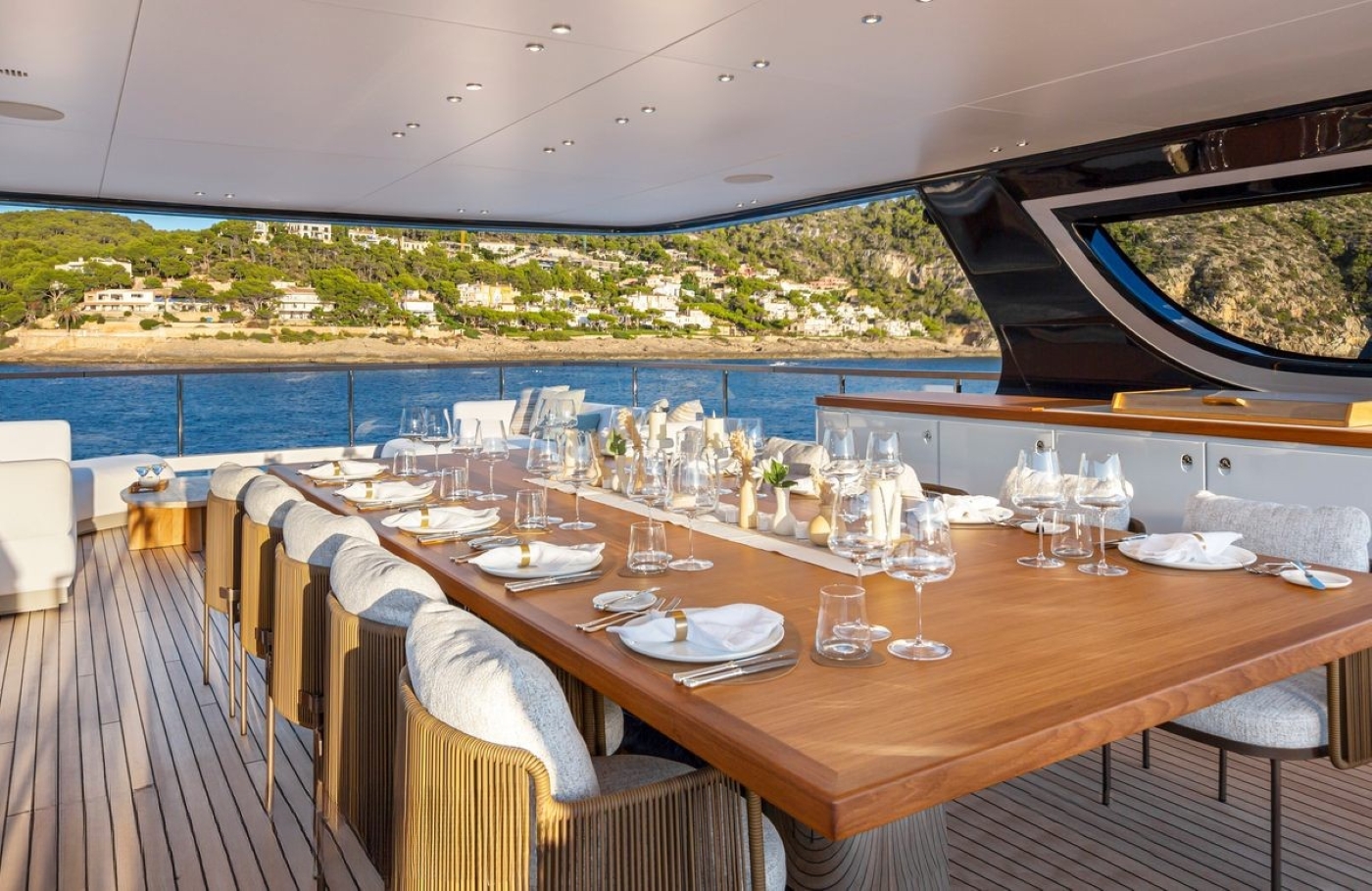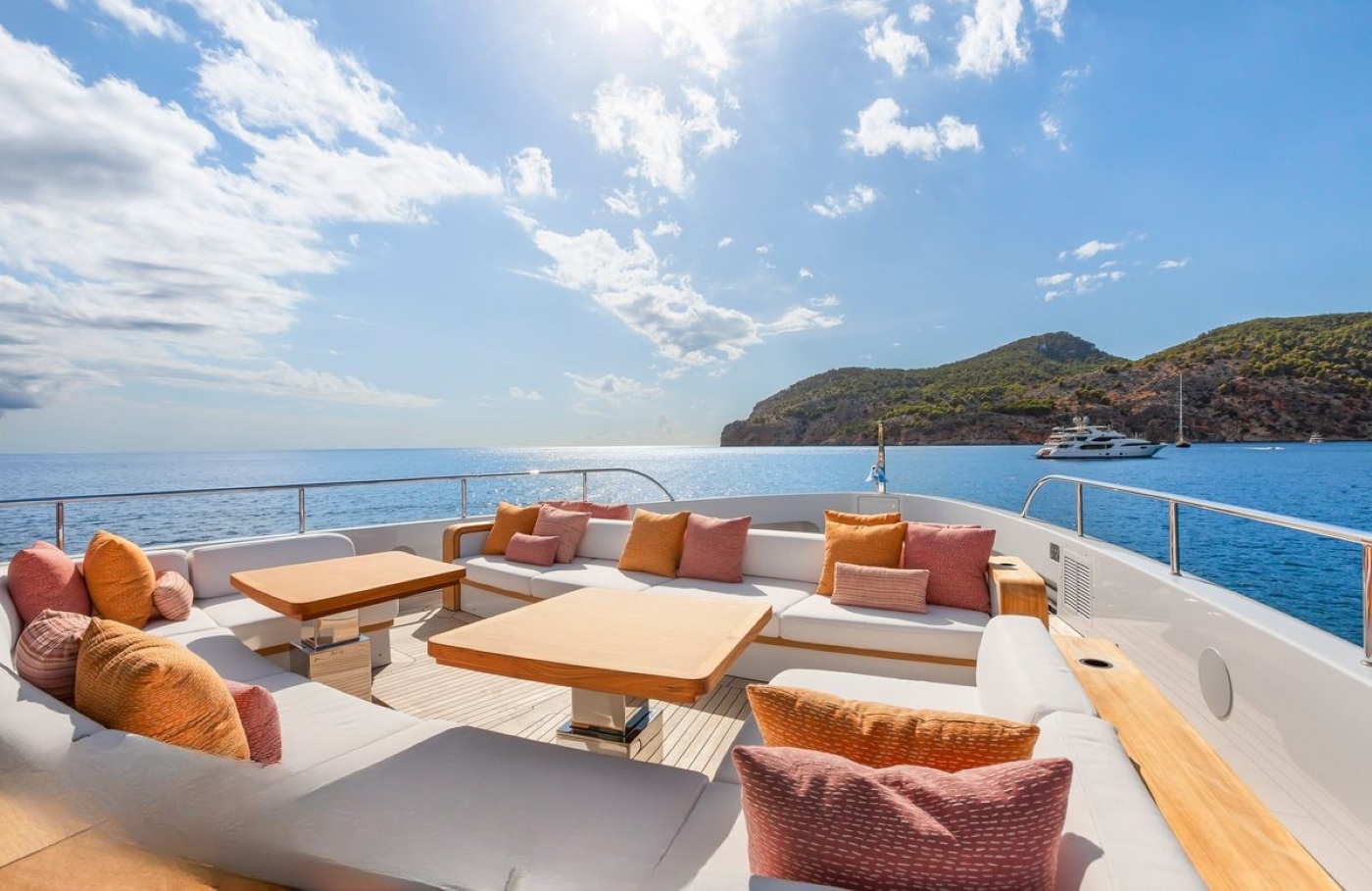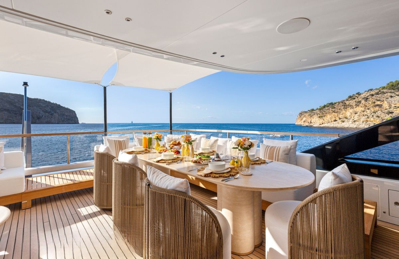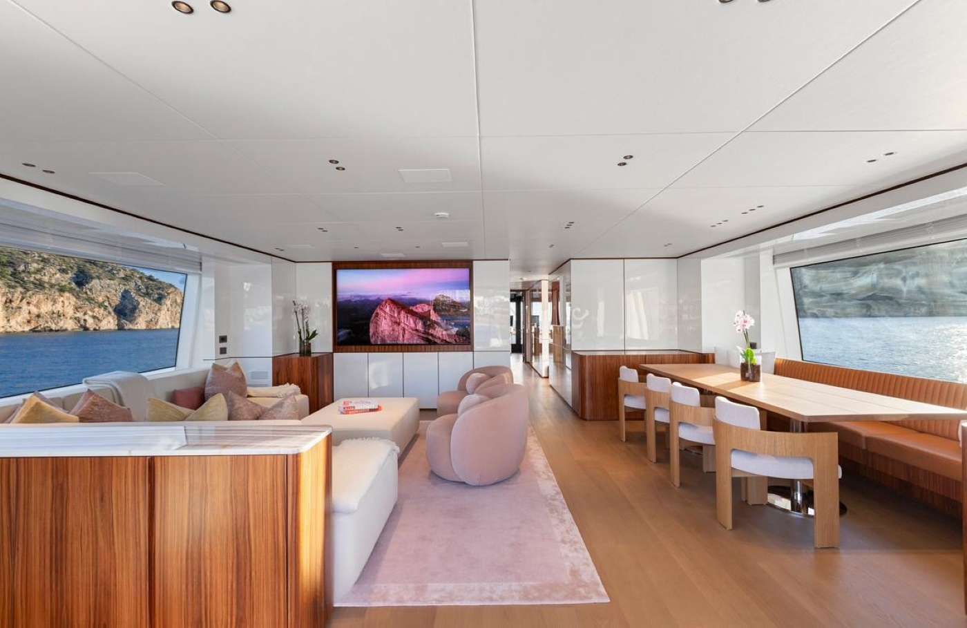The sundeck features an alfresco dining table for 12, a sit-up bar, barbecue and cushioned sun loungers aft – all under the shelter of a sleek hardtop. On the bridge deck aft, guests will find a second dining area and expansive lounge space, ideal for breakfast, evening drinks or a cinema night beneath the stars. Forward, the bow sunpads provide a quieter escape with uninterrupted views of the horizon.