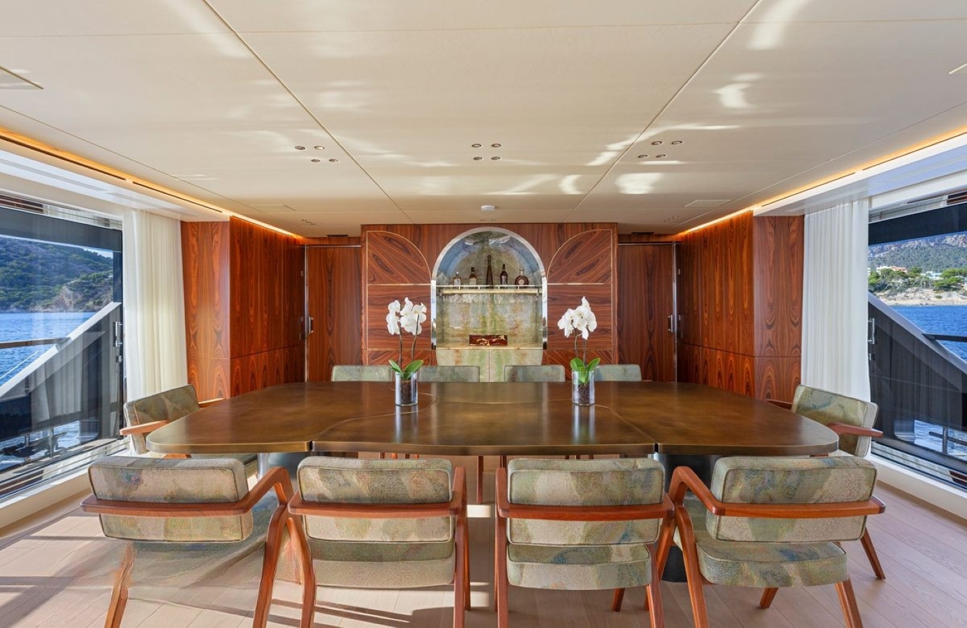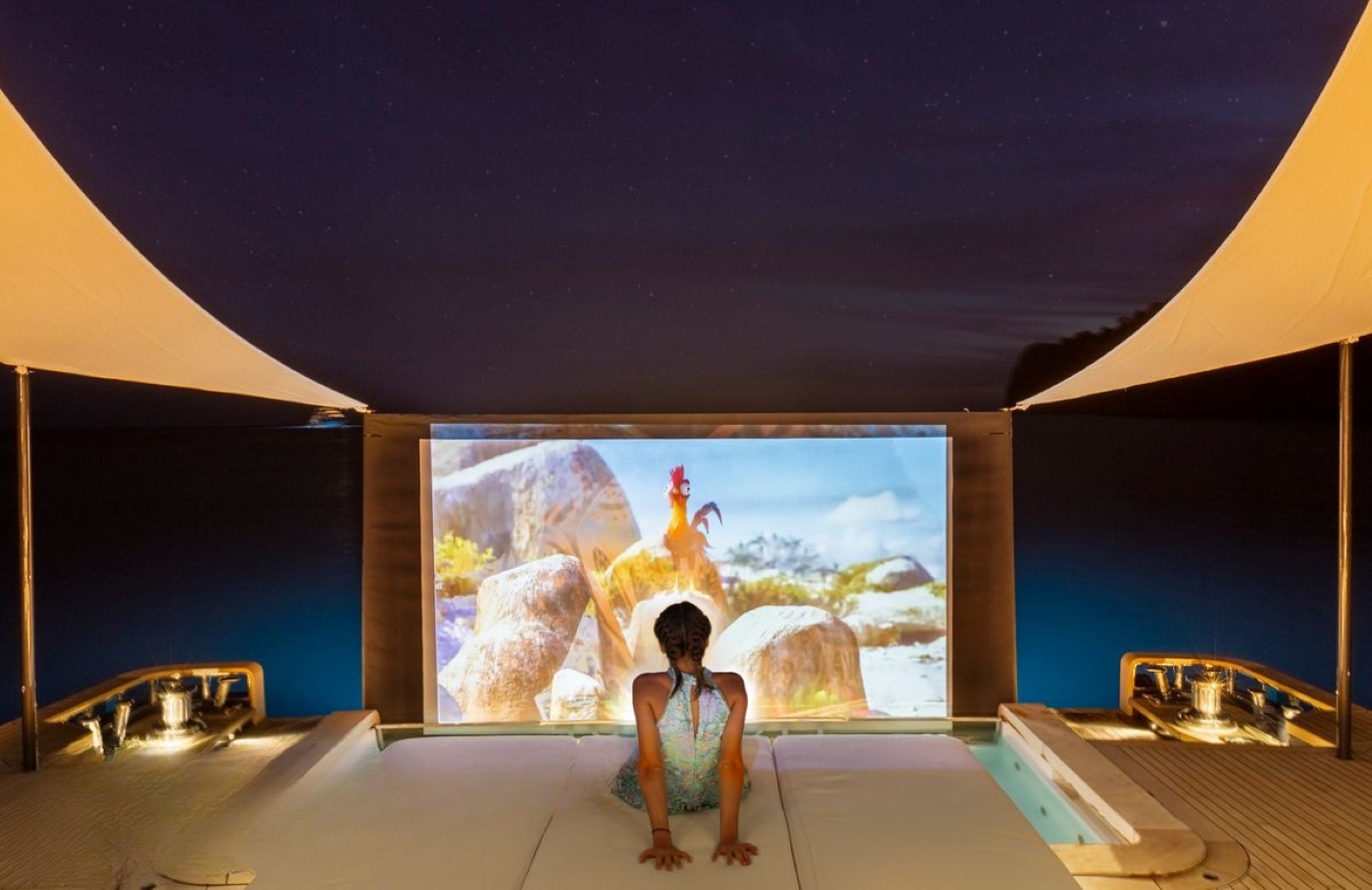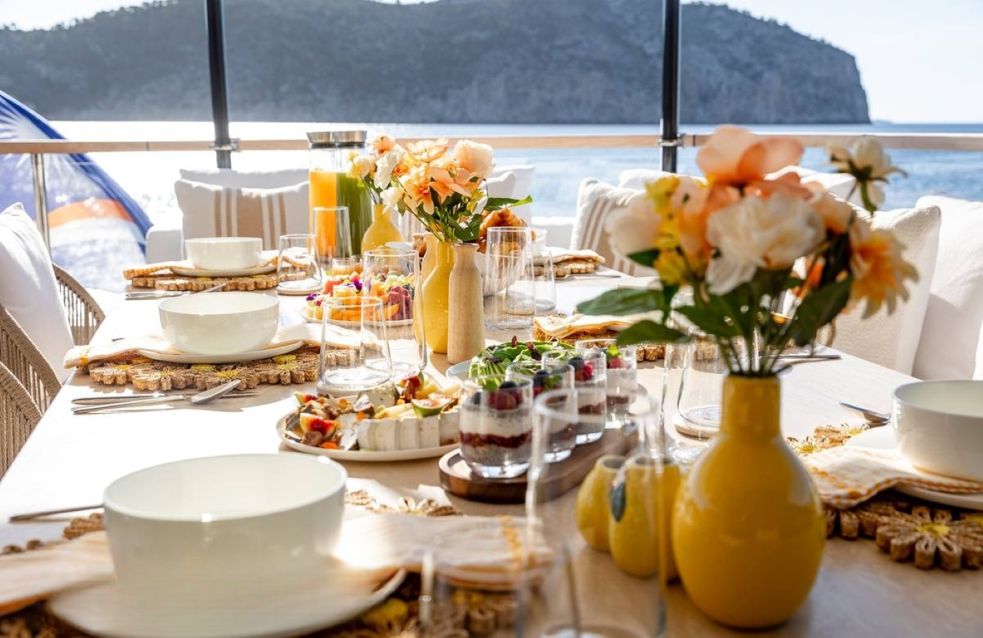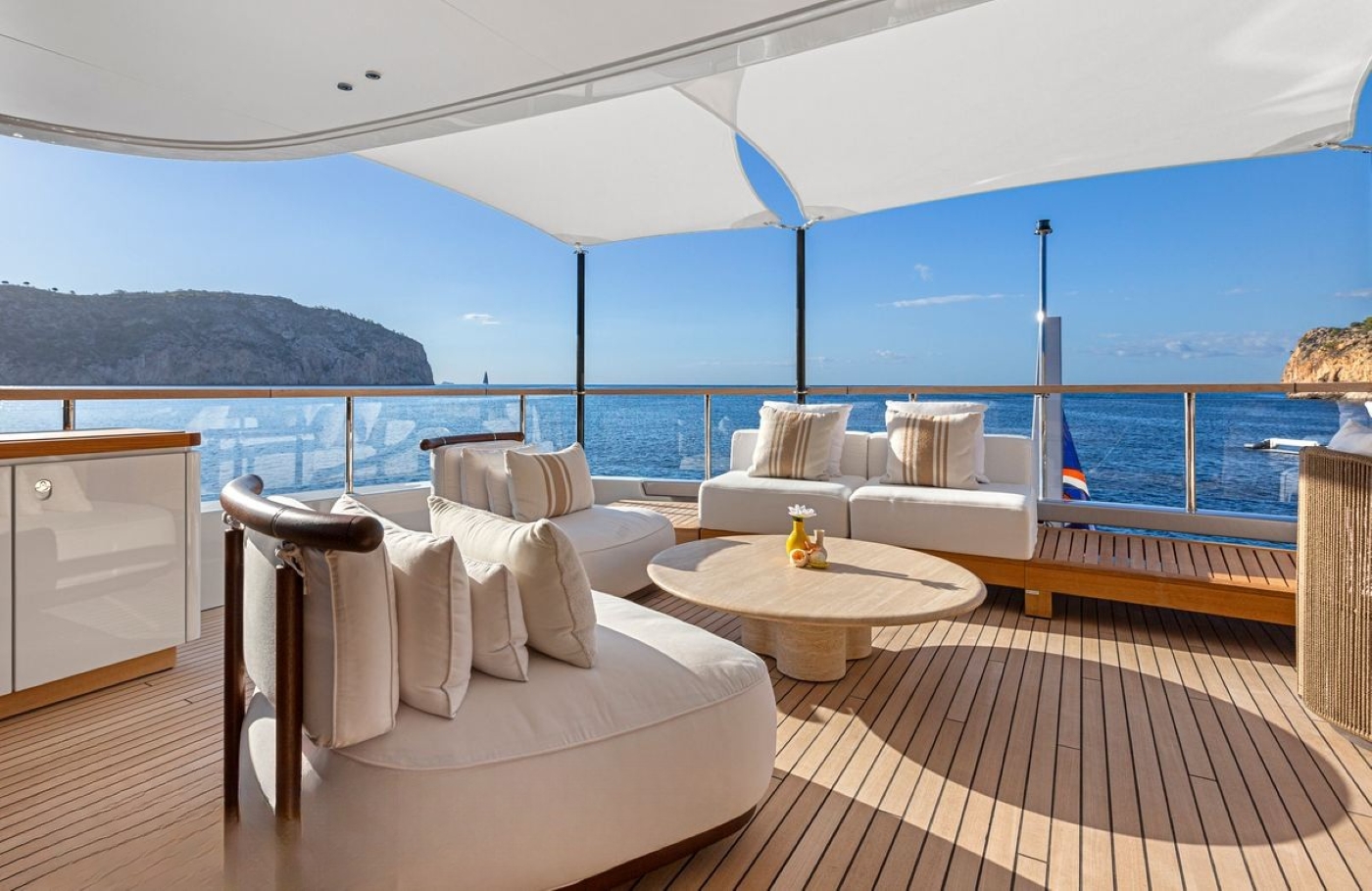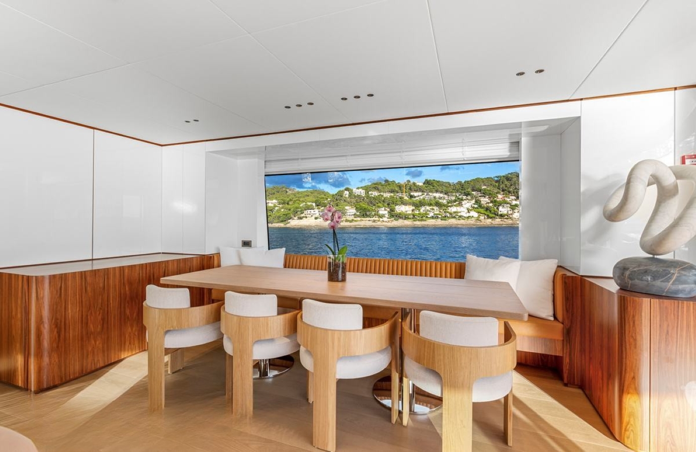 The sundeck features an alfresco dining table for 12, a sit-up bar, barbecue and cushioned sun loungers aft – all under the shelter of a sleek hardtop. On the bridge deck aft, guests will find a second dining area and expansive lounge space, ideal for breakfast, evening drinks or a cinema night beneath the stars. Forward, the bow sunpads provide a quieter escape with uninterrupted views of the horizon.