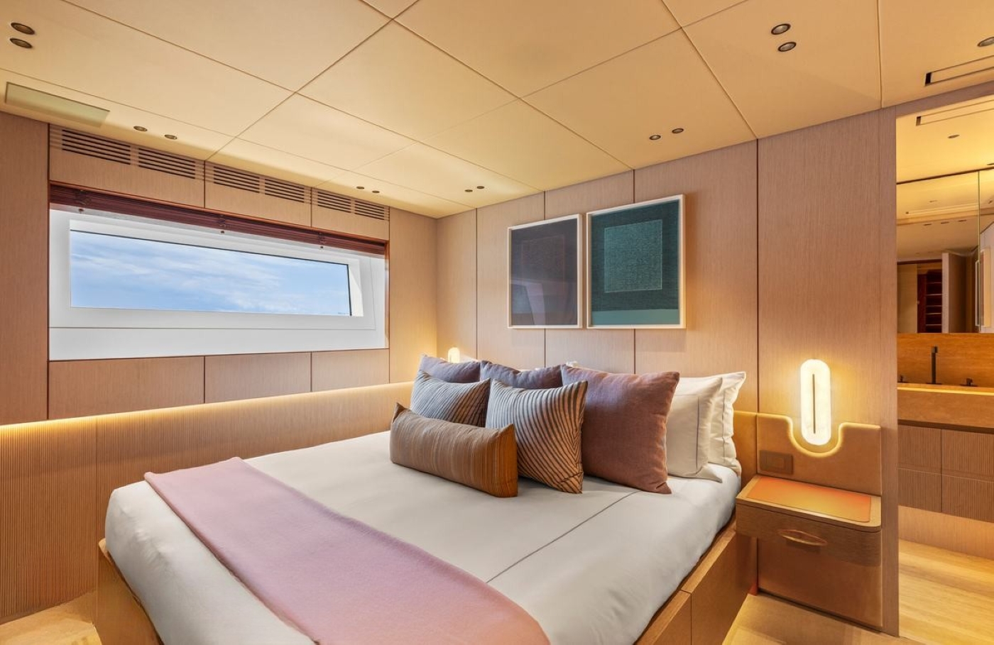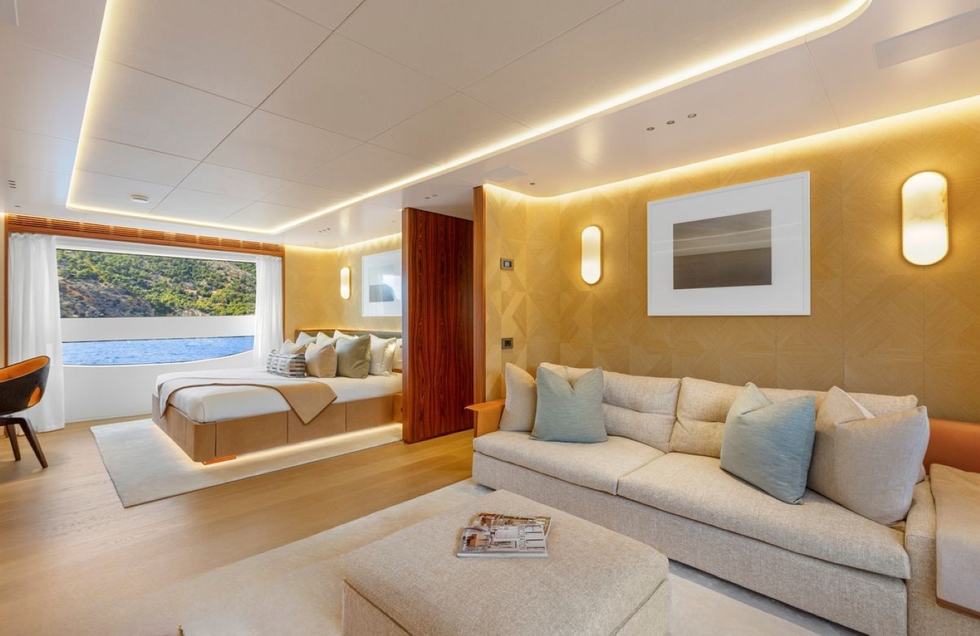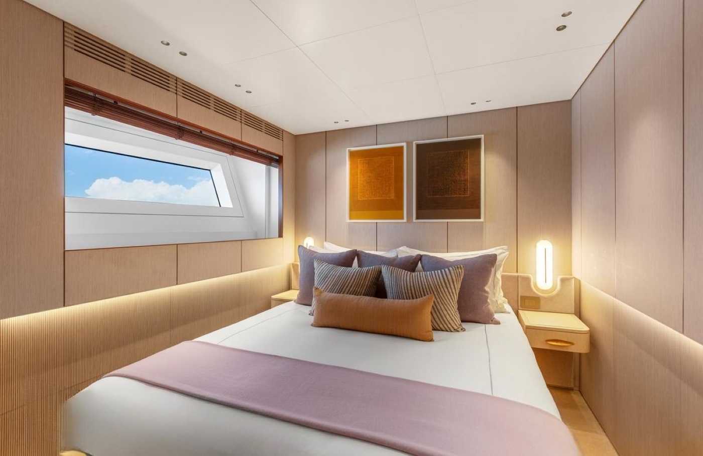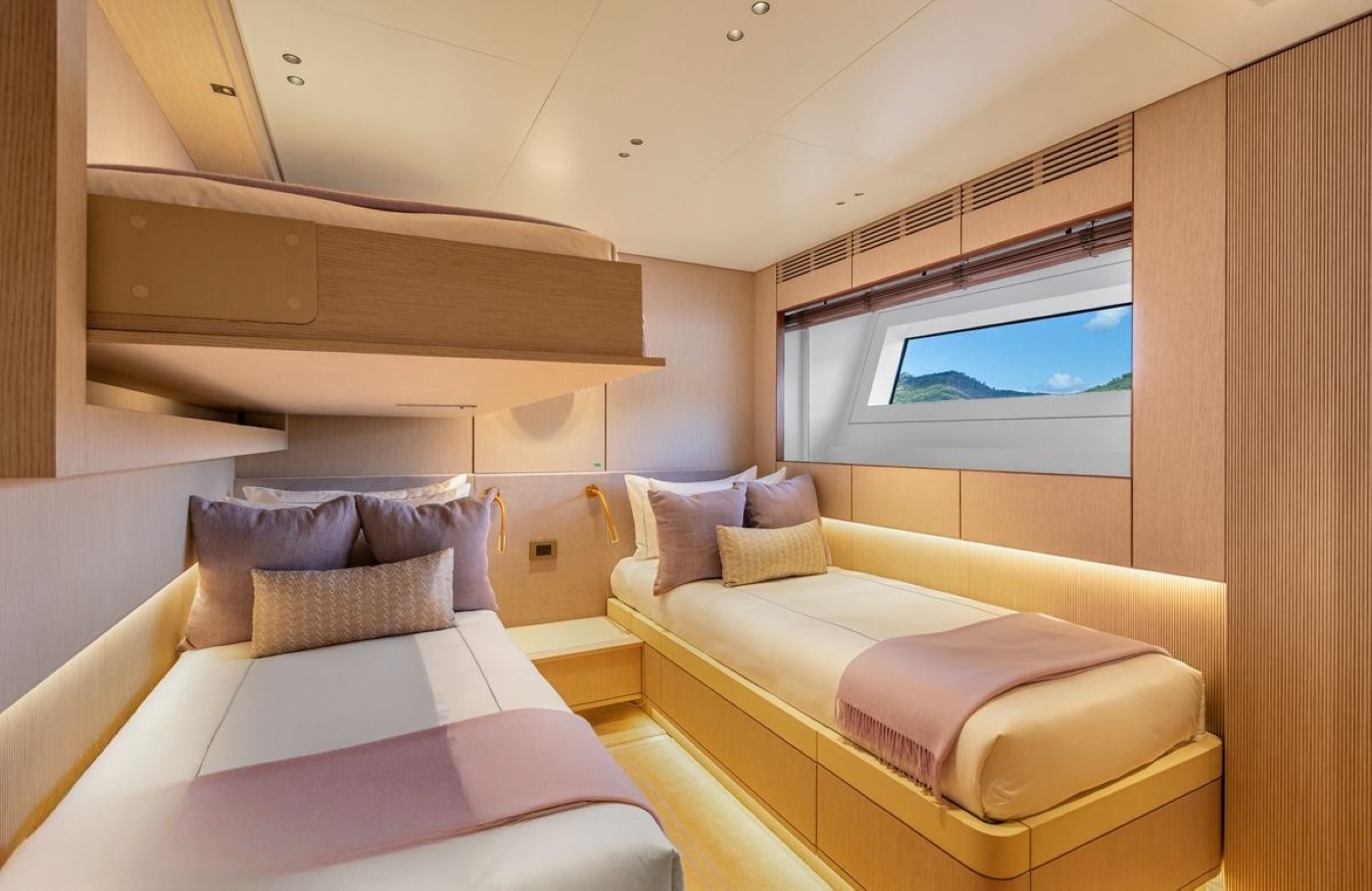 LIV LOVE accommodates up to 11 guests in five ensuite cabins: ~ Master Suite (main deck): Full-beam with private lounge, desk, dressing rooms, his and hers bathrooms with central rainfall shower ~ 2 x VIP Cabins (lower deck): Queen-sized beds, ensuites, large windows ~ 1 x Double Cabin (lower deck): Double bed and ensuite ~ 1 x Twin Cabin (lower deck): Convertible to double, with Pullman berth and ensuite All cabins are finished with precision and comfort, offering ample wardrobe space and bespoke detailing. The layout is ideal for families or mixed group configurations.