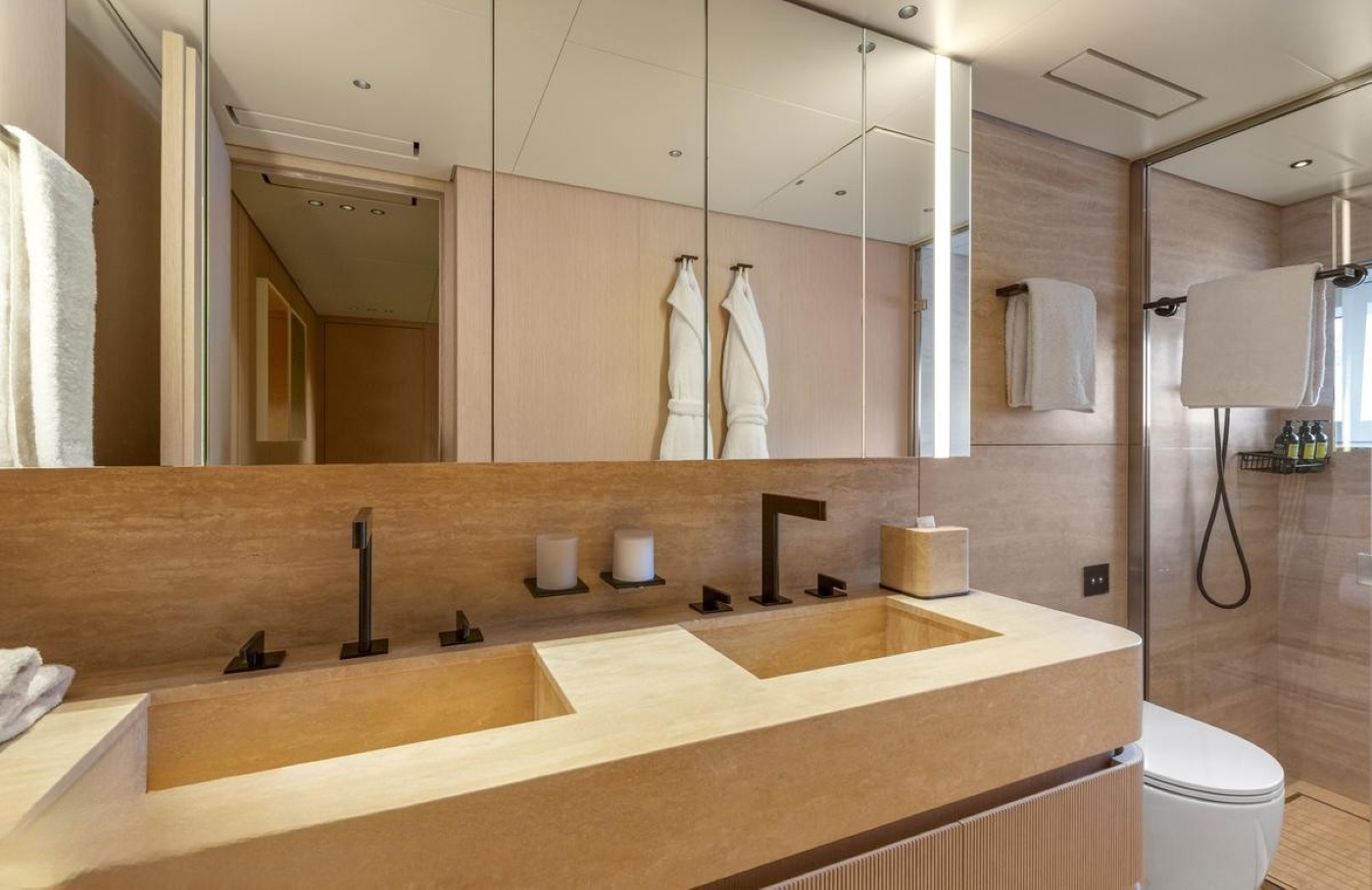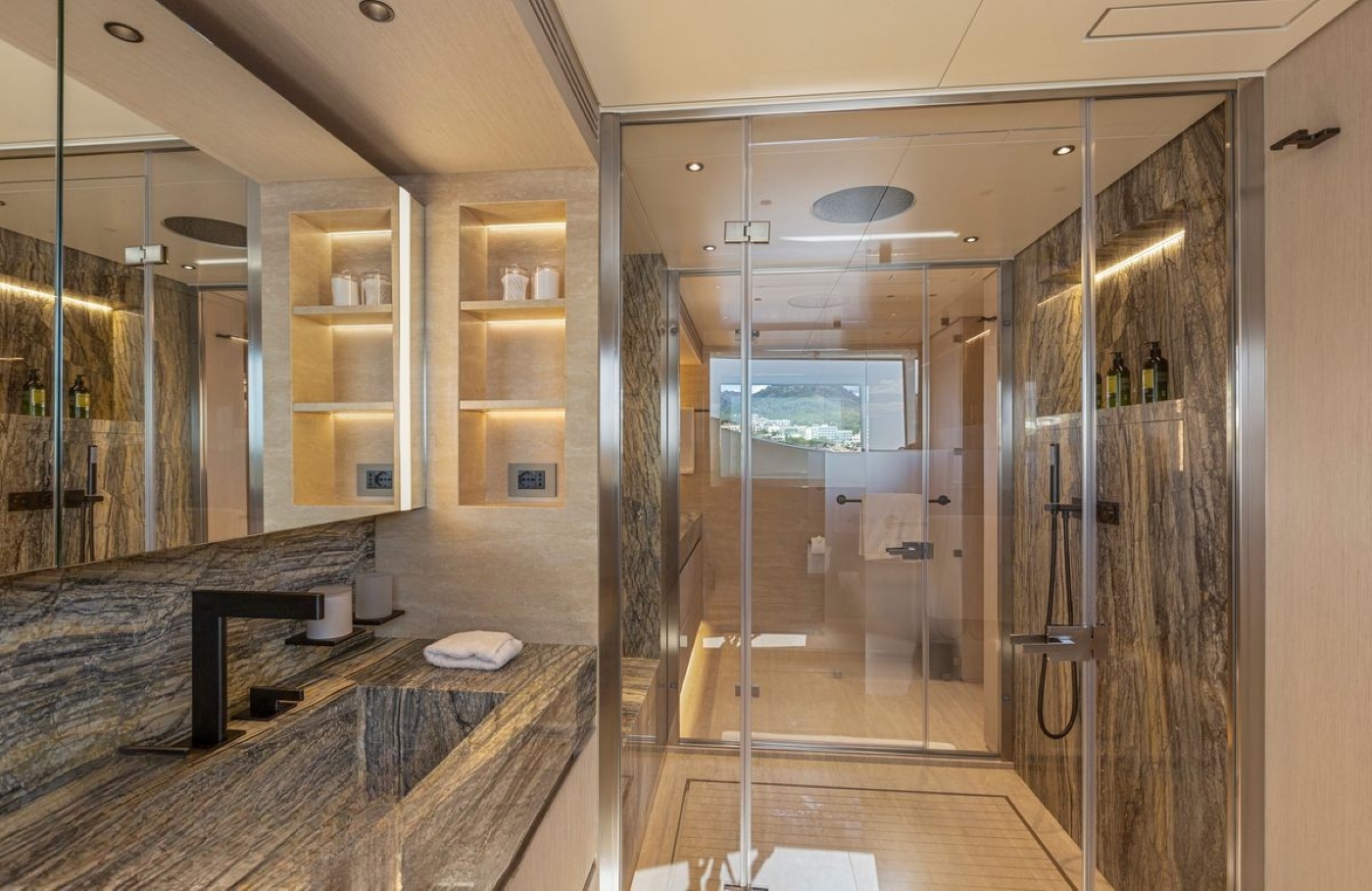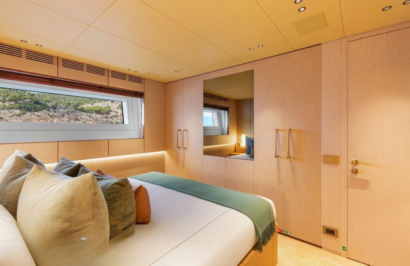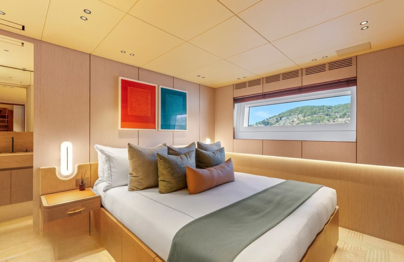 LIV LOVE accommodates up to 11 guests in five ensuite cabins: ~ Master Suite (main deck): Full-beam with private lounge, desk, dressing rooms, his and hers bathrooms with central rainfall shower ~ 2 x VIP Cabins (lower deck): Queen-sized beds, ensuites, large windows ~ 1 x Double Cabin (lower deck): Double bed and ensuite ~ 1 x Twin Cabin (lower deck): Convertible to double, with Pullman berth and ensuite All cabins are finished with precision and comfort, offering ample wardrobe space and bespoke detailing. The layout is ideal for families or mixed group configurations.