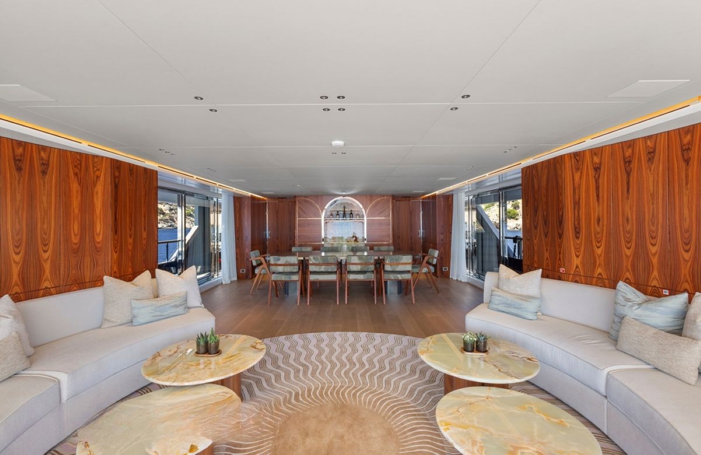 LIV LOVE’s design centres around an inviting connection with the sea. Her standout beach club opens onto a hydraulic swim platform, with an infinity-edge glass pool offering spectacular views from the aft deck. Fold-out balconies and seamless glazing amplify the openness, while her three deck levels provide spaces for every kind of social gathering.